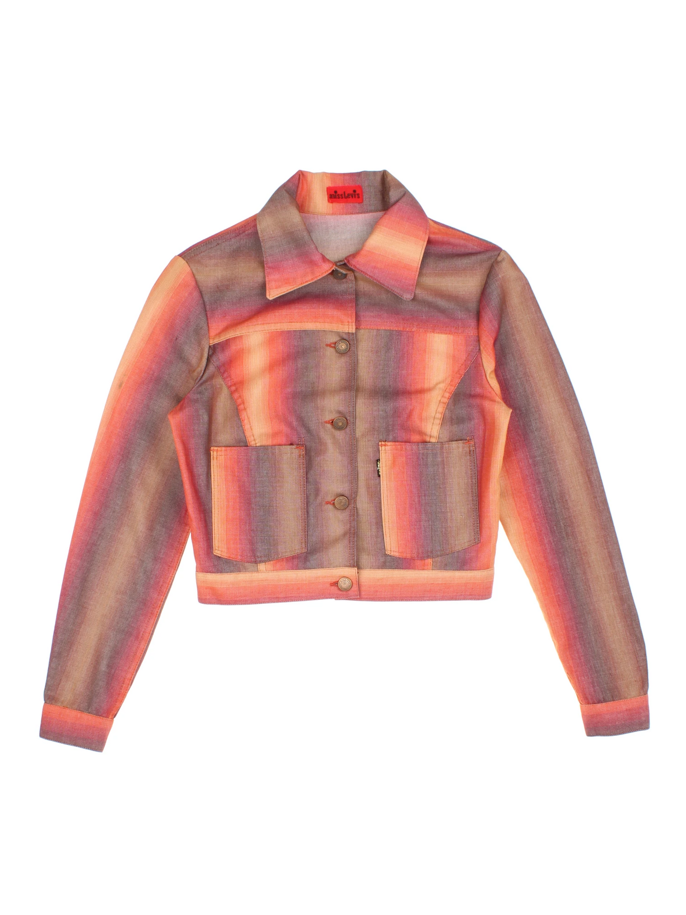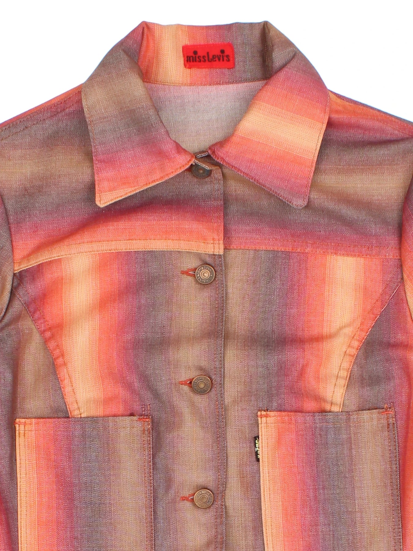 Elevate your wardrobe with this Miss Levi's Vintage Cotton Western Jacket, designed in a vibrant mix of orange, pink, and purple tones. Crafted from breathable cotton, this piece embodies iconic 70's style with its classic western silhouette and statement patch pockets. The cropped fit and structured cut flatter the figure, making it ideal for pairing with high-waisted jeans, skirts or over dresses. Perfect for casual outings or making a bold statement at daytime gatherings, this jacket’s authentic vintage charm appeals to lovers of retro fashion and contemporary style alike. Designed and finished with classic Miss Levi's branding, this piece represents both comfort and style for season-round wear.