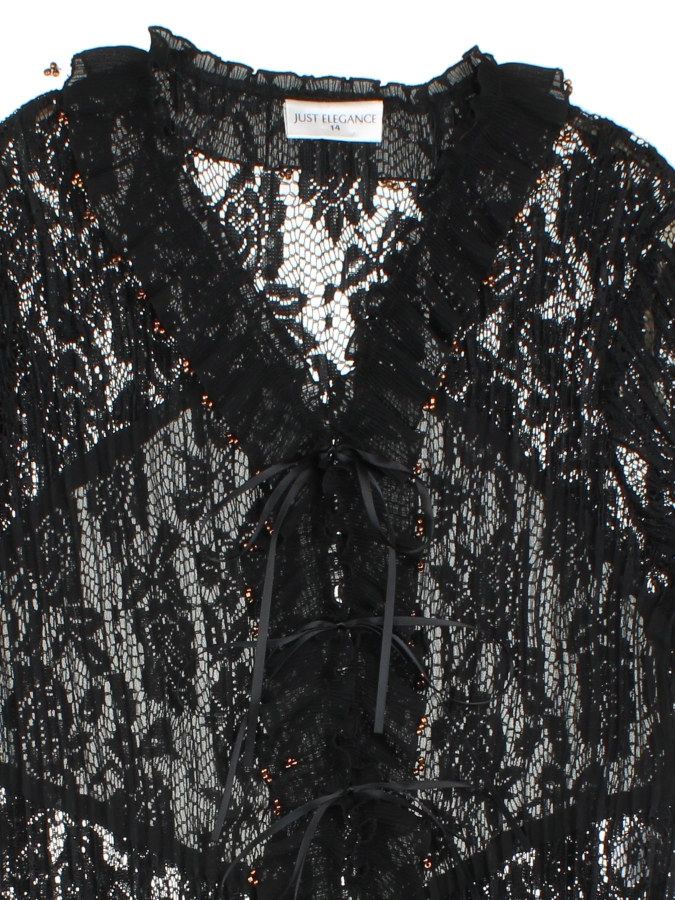 Elevate your evening wardrobe with this stunning Just Elegance Black Lace Sheer Long Sleeve Top. This exquisite blouse features delicate lace fabric with ruffle accents along the collar and sleeves, exuding timeless vintage charm. Designed in a flattering size XXS, the form-fitting style flatters the silhouette while the sheer finish adds a touch of allure, perfect for layering over camisoles or bralettes. The romantic lace design makes it an ideal choice for special occasions, cocktail parties, or elegant dinners. Pair it with tailored trousers or a sleek skirt to create a sophisticated look destined to turn heads. Shop this unique piece and add a twist of gothic-inspired glamour to your collection.