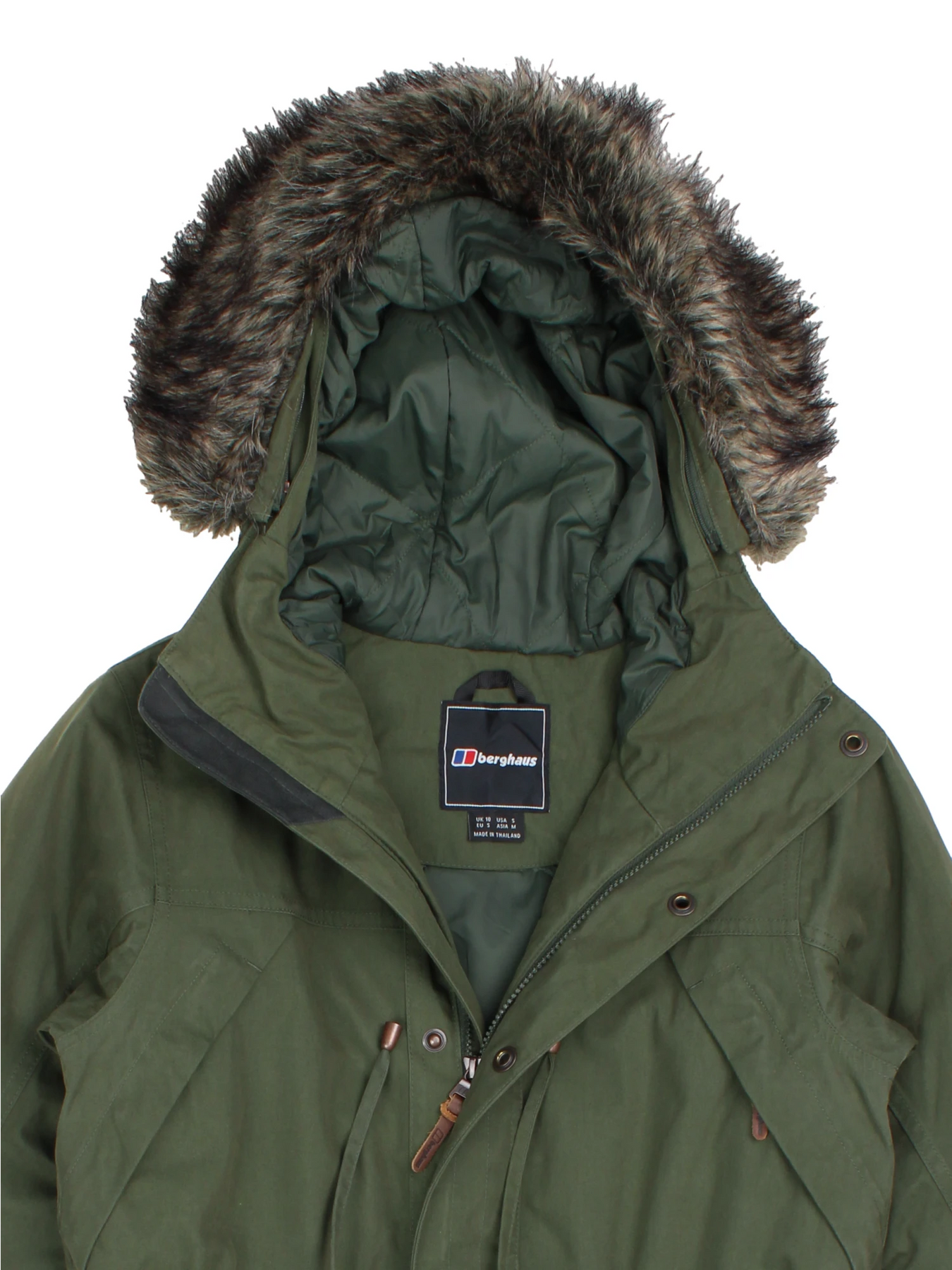 Embrace the colder months in style with the Berghaus Olive Green Faux Fur Hooded Parka Jacket. This jacket is crafted from durable nylon, ensuring exceptional resilience and weather protection during your outdoor adventures. Designed for maximum comfort, the parka features a plush faux fur trim on the hood and a quilted lining, offering superior warmth and a touch of luxury. The adjustable waist and practical front pockets enhance both the functionality and flattering fit, making this jacket ideal for winter walks, city outings, or everyday wear. Finished in a versatile olive green, this Berghaus parka seamlessly blends fashion and utility, perfect for anyone seeking a stylish winter wardrobe staple.