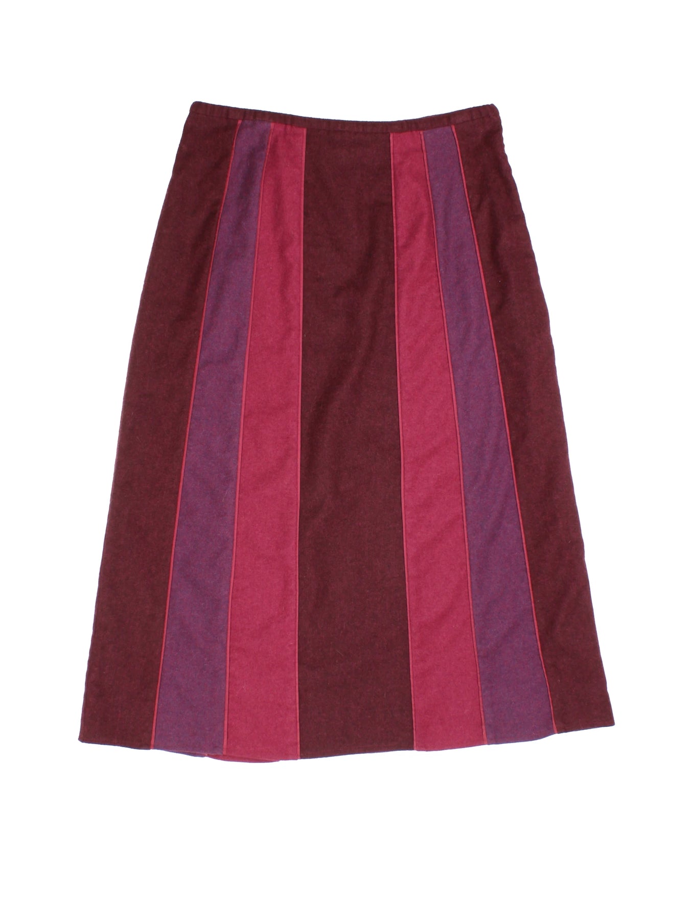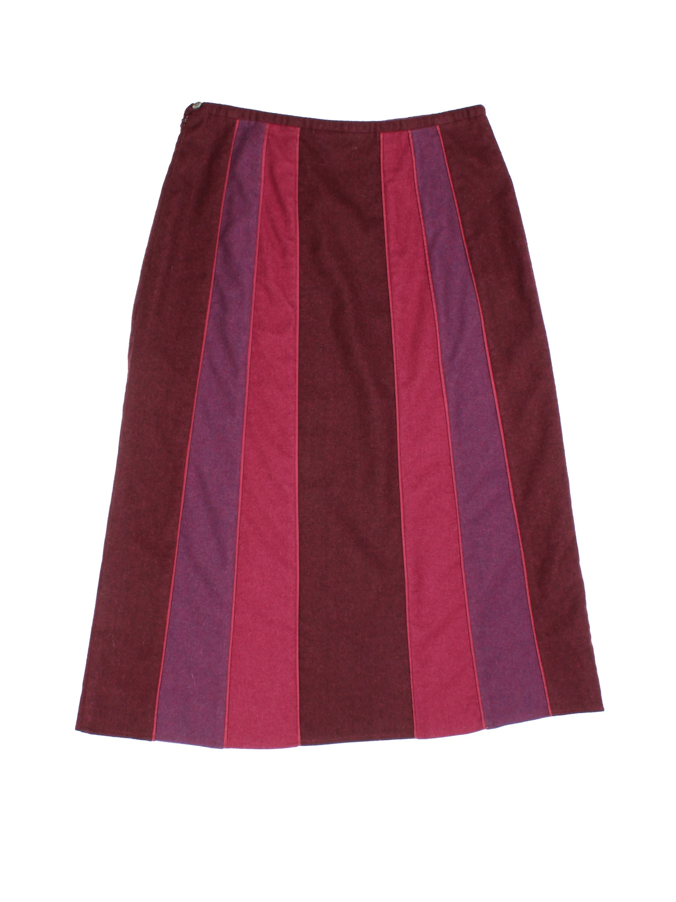 Step into timeless style with the Wealth of Nations Burgundy Wool Midi Skirt, featuring elegant colour block panelling in rich burgundy and purple tones. Crafted from warm wool, this skirt offers both comfort and sophistication, making it perfect for cool weather outings, work, or casual occasions. The flattering midi length and size L fit provide a versatile silhouette that enhances your wardrobe. Inspired by iconic 70's fashion, this vintage skirt pairs beautifully with boots, heels or smart flats for an effortlessly chic look. Make a statement while enjoying the superior quality and retro flair of this unique piece.