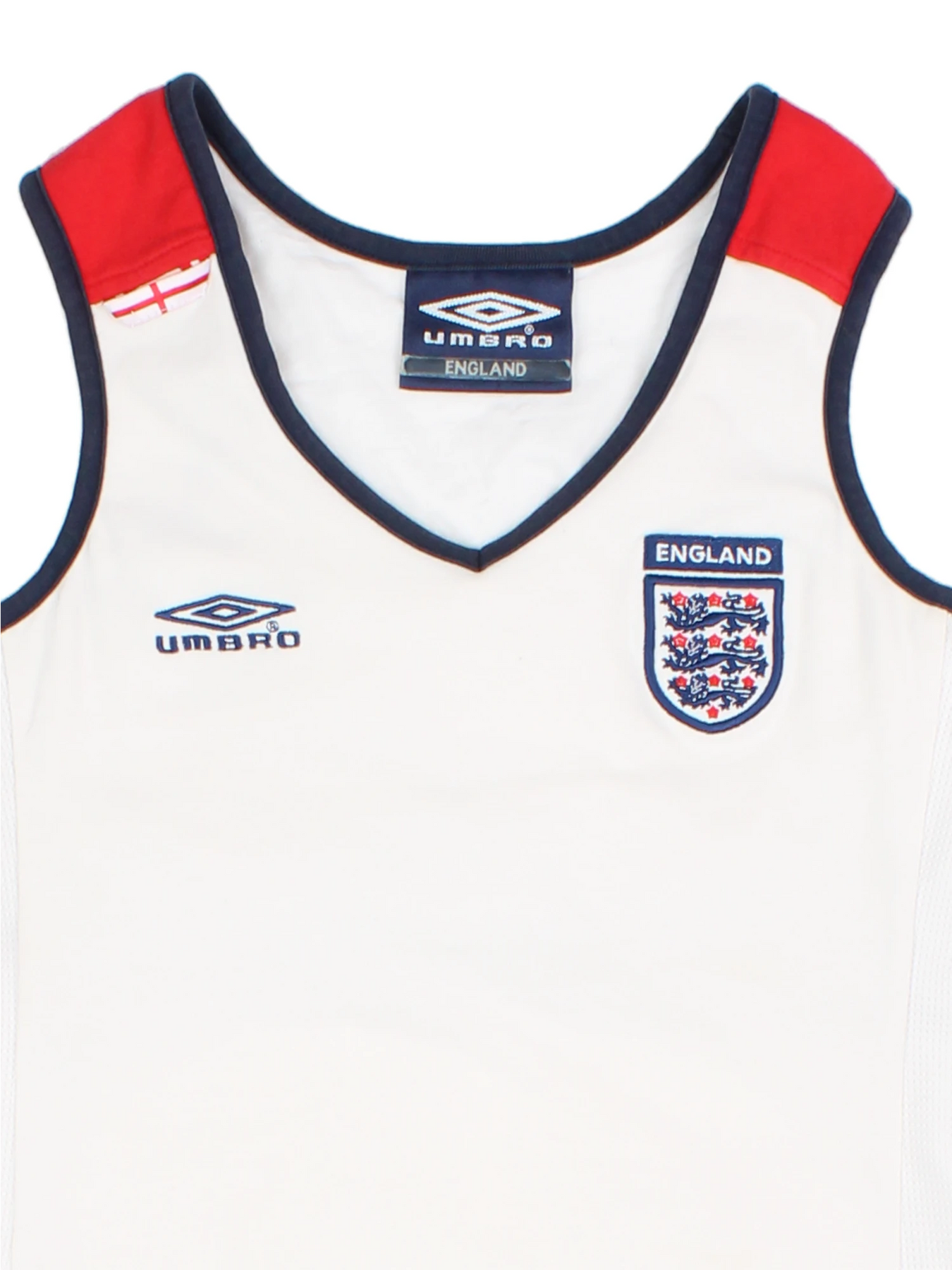 Show your support for England with this vintage-inspired Umbro sleeveless sports top in crisp white with distinctive red and navy accents. Crafted from lightweight polyester, this athletic top is designed to offer maximum comfort and breathability during intense matches or casual wear. Featuring the iconic England crest and Umbro branding, this shirt is perfect for football fans and collectors alike. The size XXS fit provides a streamlined look while delivering freedom of movement, making it an excellent choice for both sports and street style. Ideal for pairing with shorts or track pants, this piece brings retro 90's flair to your wardrobe and is a standout staple for any England supporter. Don’t miss out on this limited, stylish classic – a must for any football enthusiast looking to capture nostalgic energy in their collection.