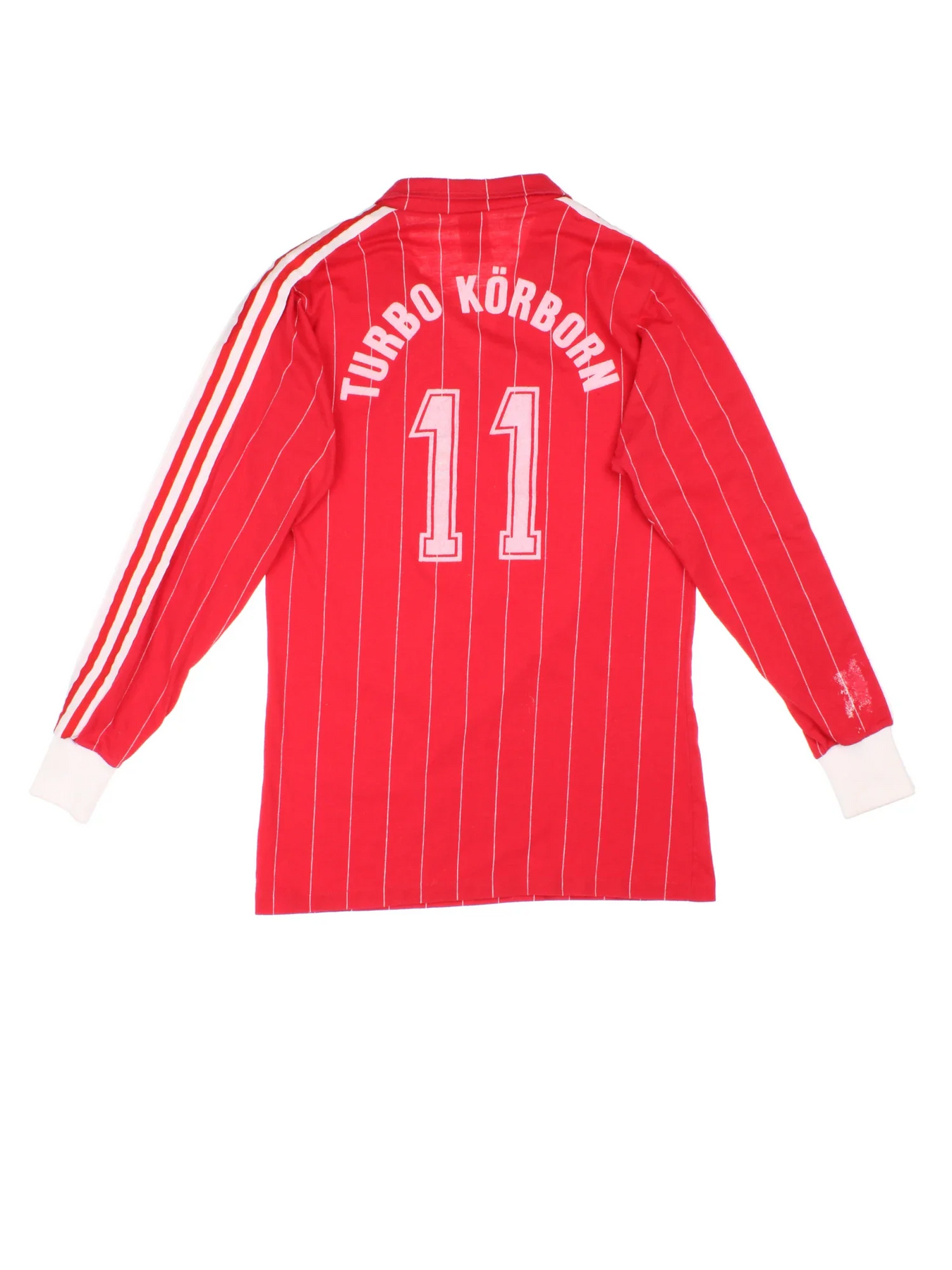 Vintage 80's Adidas Football Shirt in a red and white colourway with the logo printed on the front and Turbo Korborn number 11 on the back.
