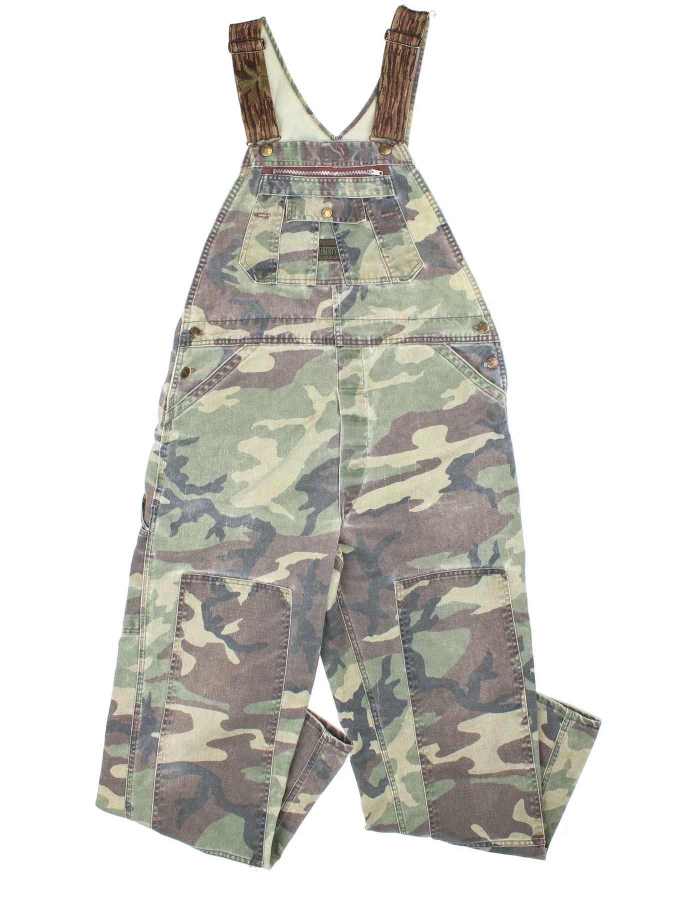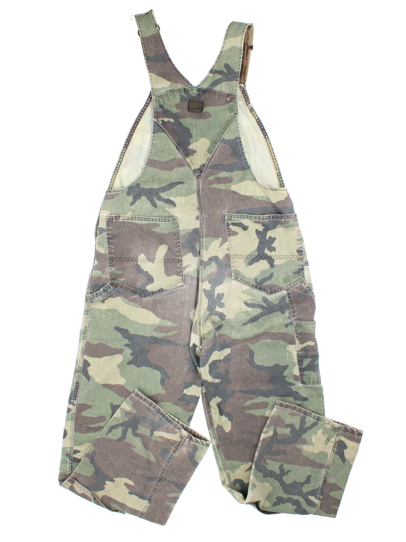 Vintage Liberty Camo Dungarees in green colourway with multiple pockets, branded buttons and the logo embroidered on the front/back.