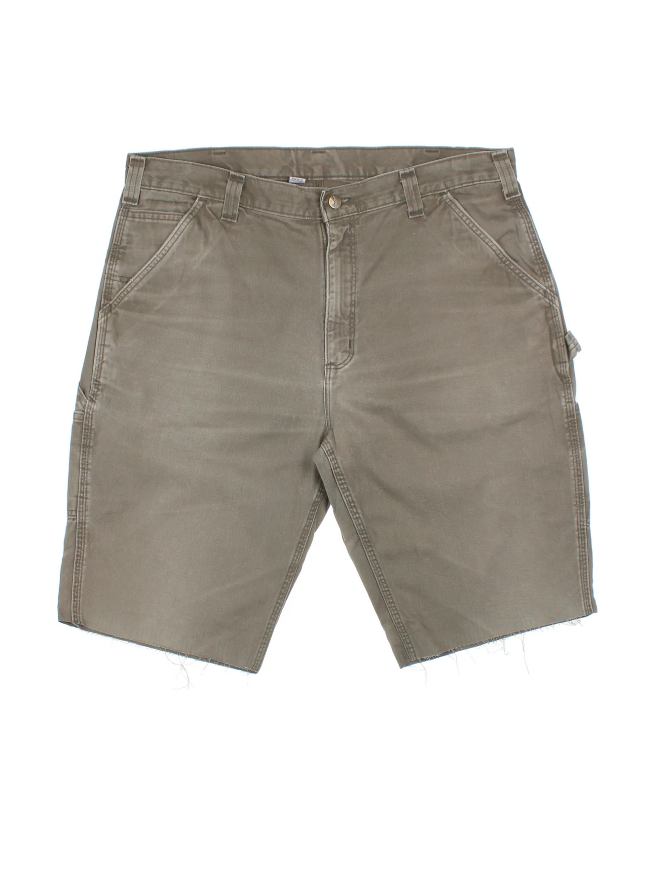 Carhartt Cut Off Shorts in grey colourway. Zip fly fastening with multiple pockets, frayed hem and embroidered branding on the back.