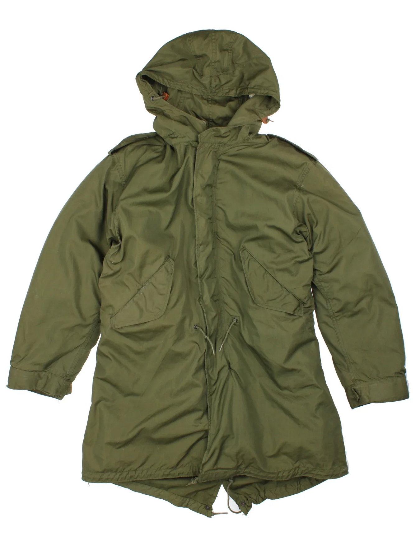 Vintage 2 in 1 Parka in a green colourway. Hooded, with zip up fastening, side pockets and removable sheep skin lining.