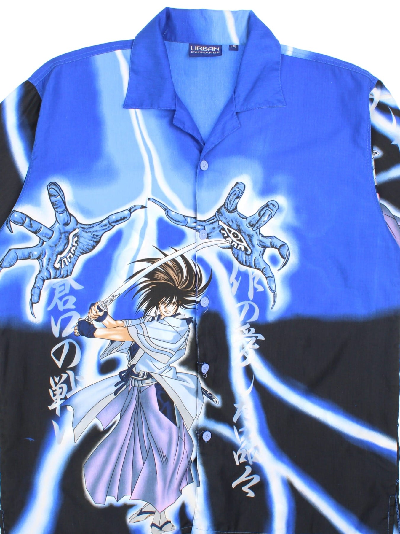 Vintage Samurai Shodown Seishiro Shirt in a blue colourway, button up with all over print.