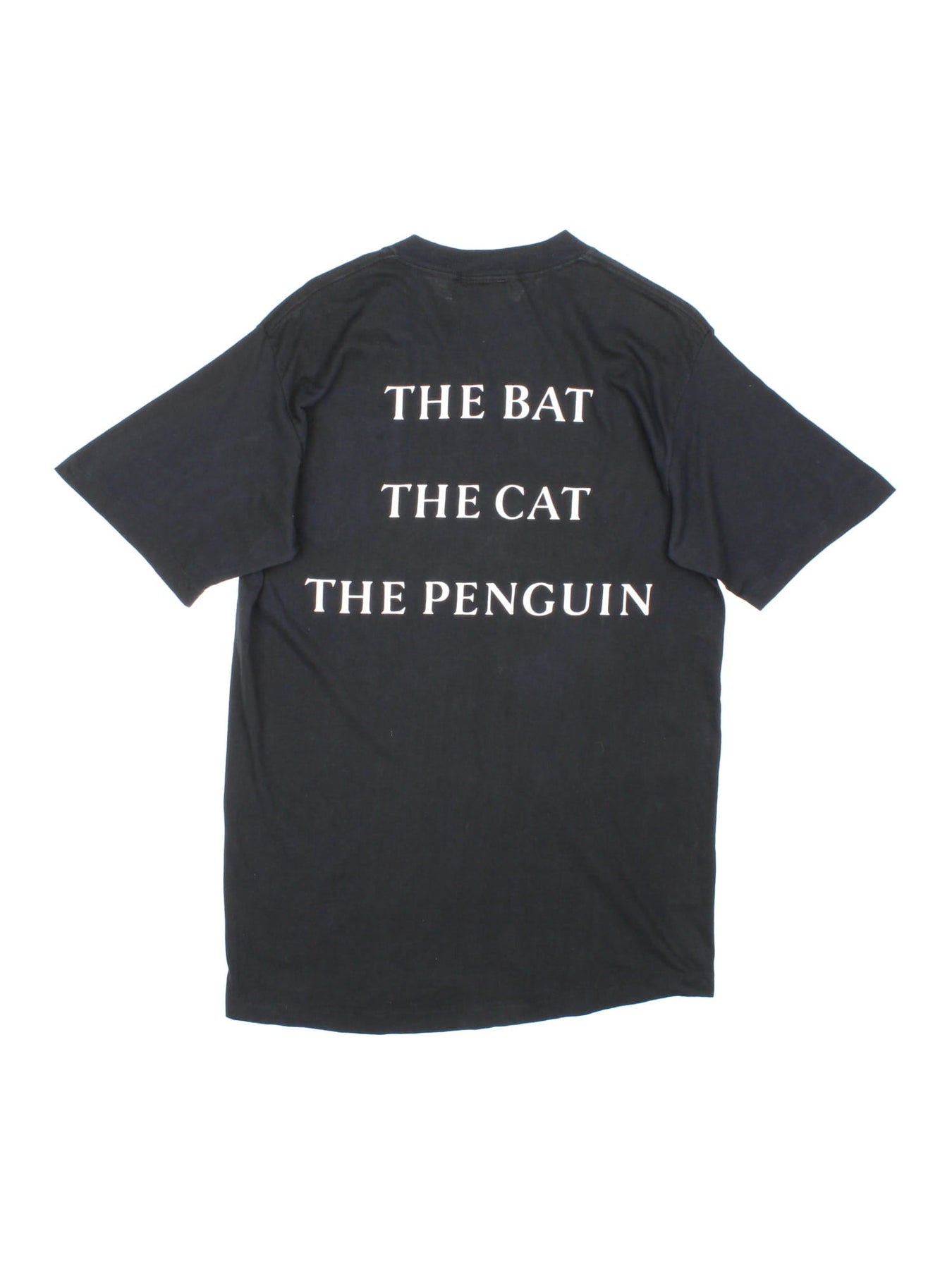 Original Vintage 1992 Batman Returns single stitch T-Shirt in black with the logo on the front and 'The Bat The Cat The Penguin' graphic printed on the back.