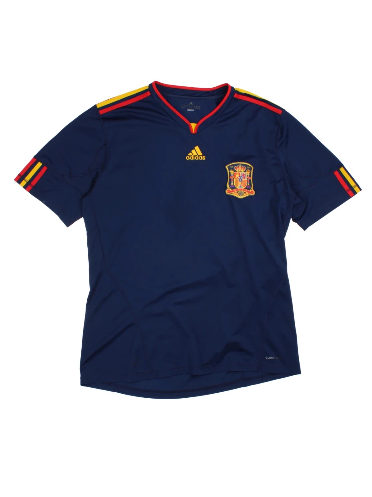 Show your support for the Spanish national team with this authentic Adidas Spain National Team Blue Football Shirt. Crafted from high-performance polyester Climalite fabric, this official jersey is designed to keep you cool and comfortable whether you are on the pitch or cheering from the stands. The deep blue shirt features vibrant yellow and red Adidas stripes on the shoulders, along with the Spain crest proudly displayed on the chest. Ideal for football fans and collectors alike, this sports jersey combines style and function, making it a must-have addition to your supporter wardrobe. Perfect for casual wear, training or match days, pair it with your favourite shorts or jeans for a complete sporty look. Excellent for gifting any Spain football enthusiast!