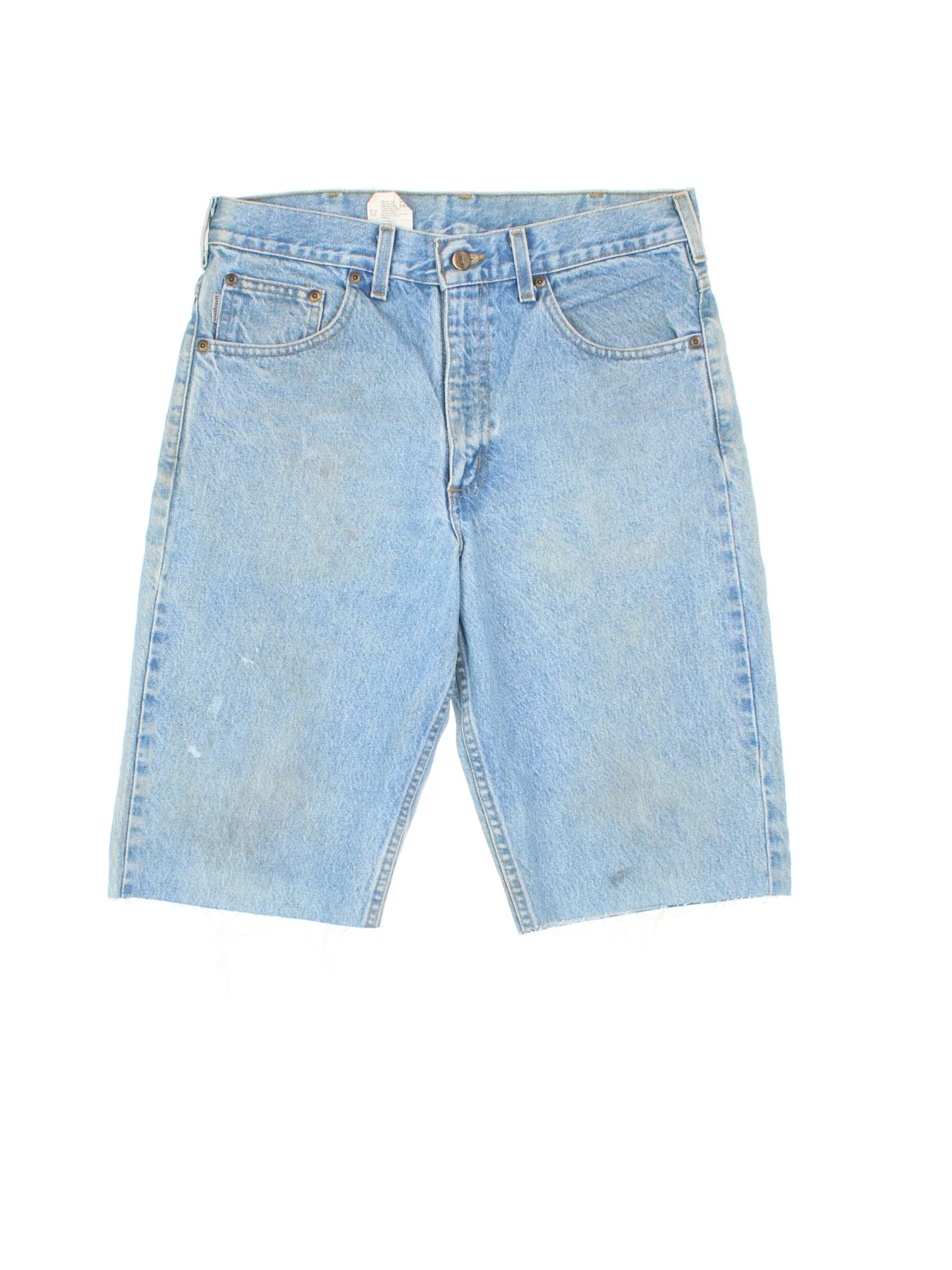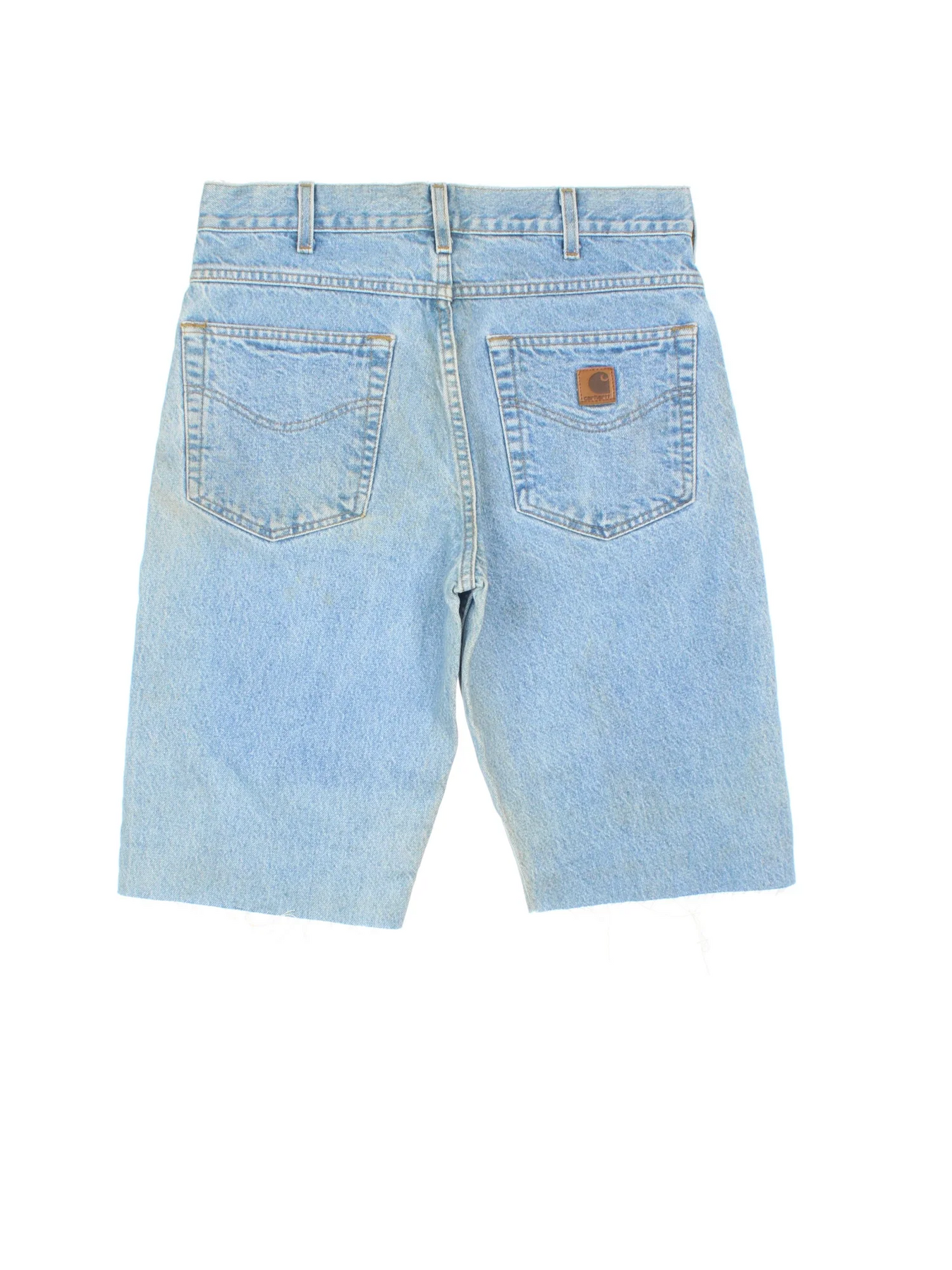 Carhartt Cut Off Shorts in blue colourway. Zip fly fastening with multiple pockets, frayed hem and embroidered branding on the back.