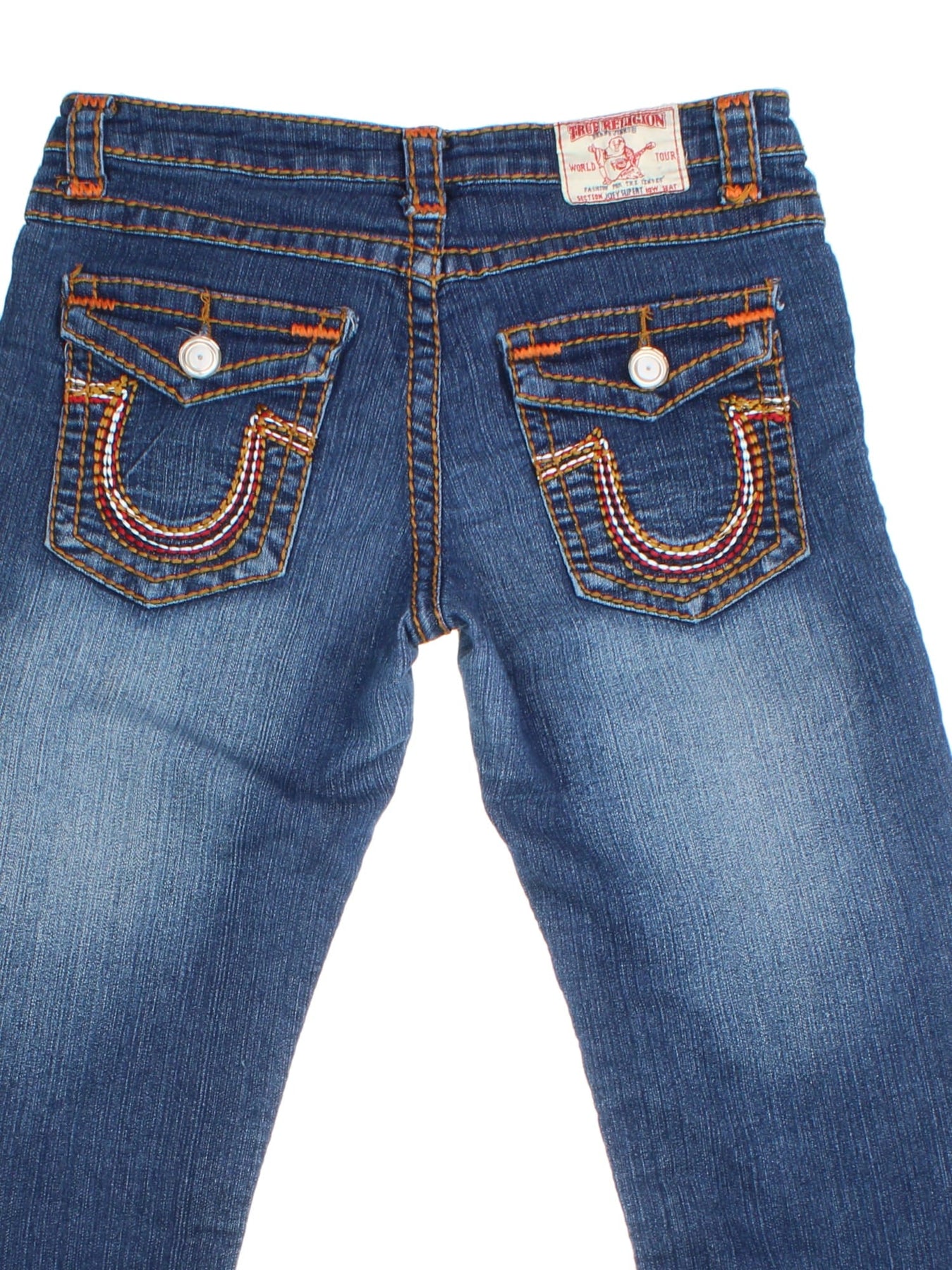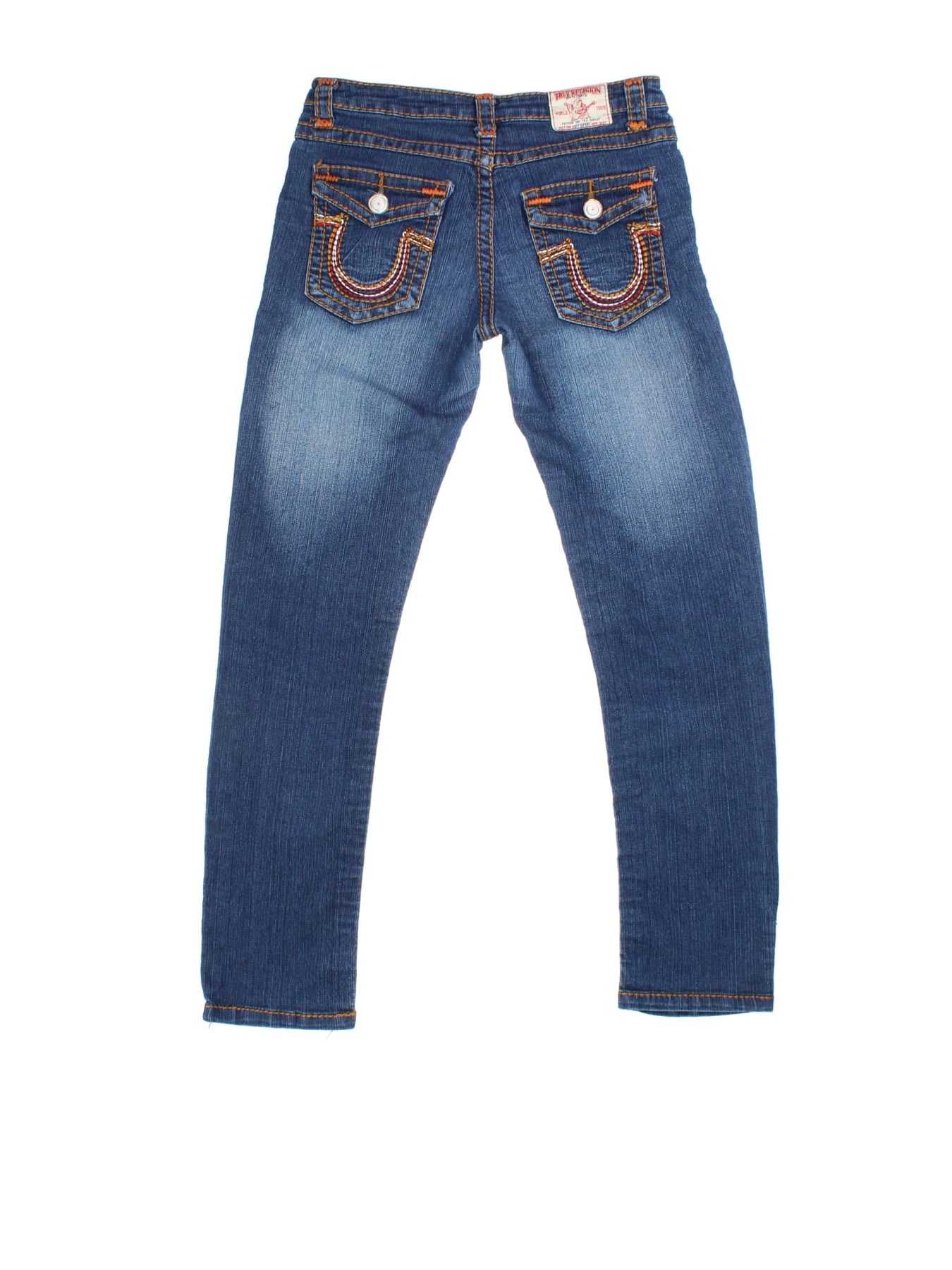 True Religion Y2K Jeans in blue colourway with multiple pockets and the logo embroidered on the back pockets.
