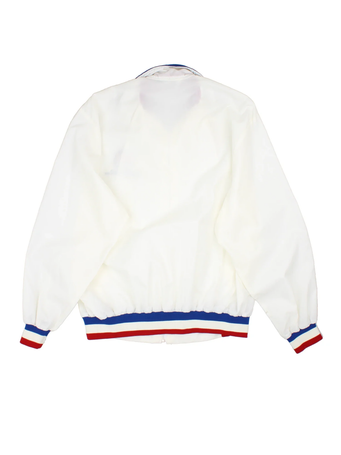 1990 NFL Super Bowl Nylon Jacket in a white colourway. Zips up and has side pockets, and the logo embroidered on the front.