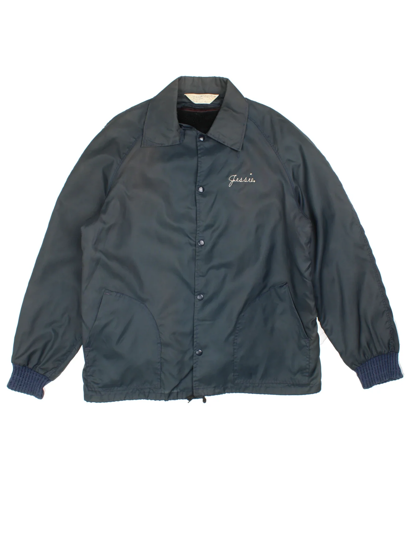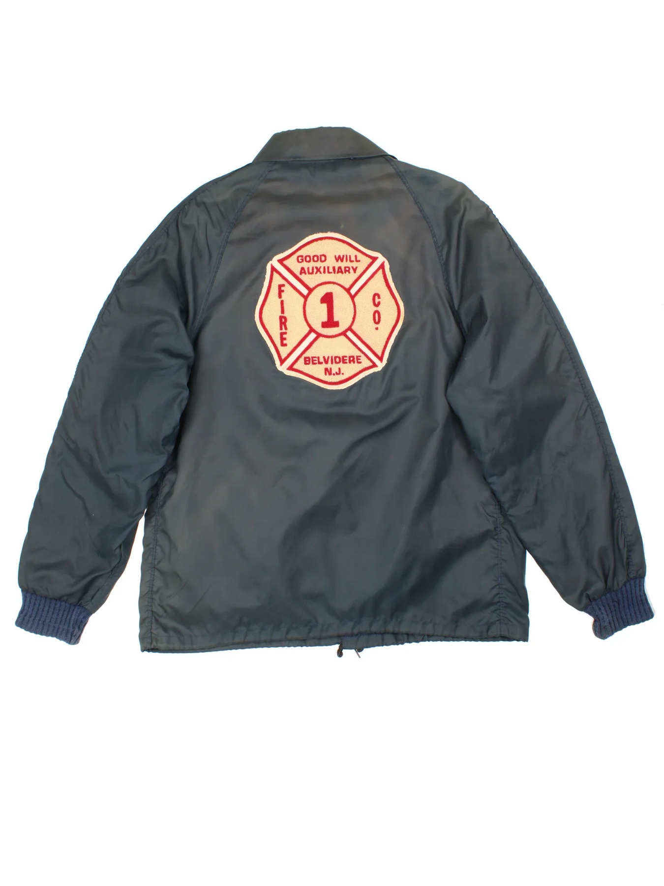 Vintage 1980's Fire Fighter Coach Jacket in a navy blue colourway. Zips up and has side pockets, detachable insulated fleece lining, and the logo embroidered on the back.