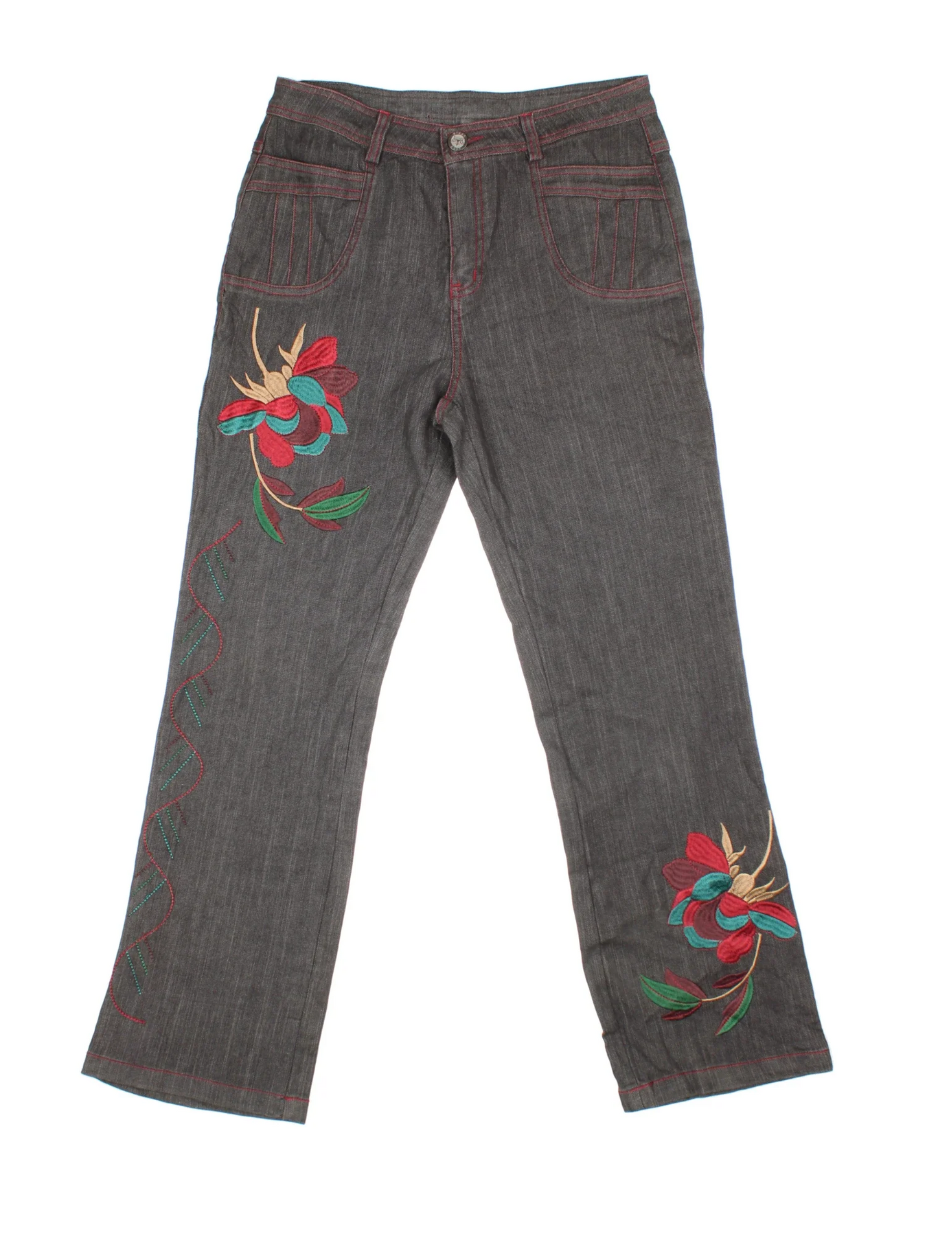 Y2K Y2K Embroidered Flared Jeans in grey colourway. Multiple pockets and embroidered detail on the front/back.