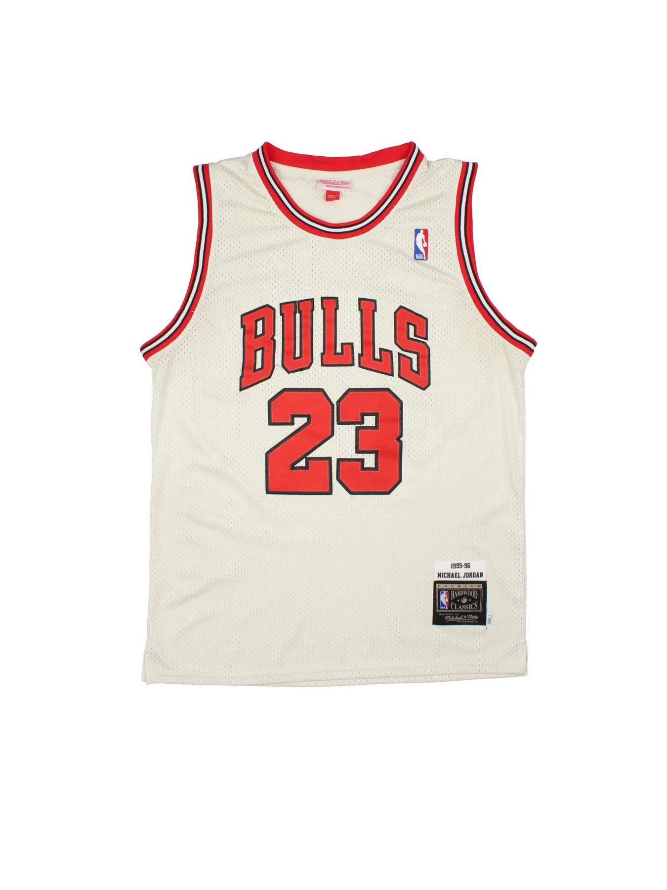 Chicago Bulls 1995-96 Michael Jordan NBA Hardwood Classic Jersey in the tan colourway with red and black trim, features embroidered logos and badge on the front and classic JORDAN #23 on the back.