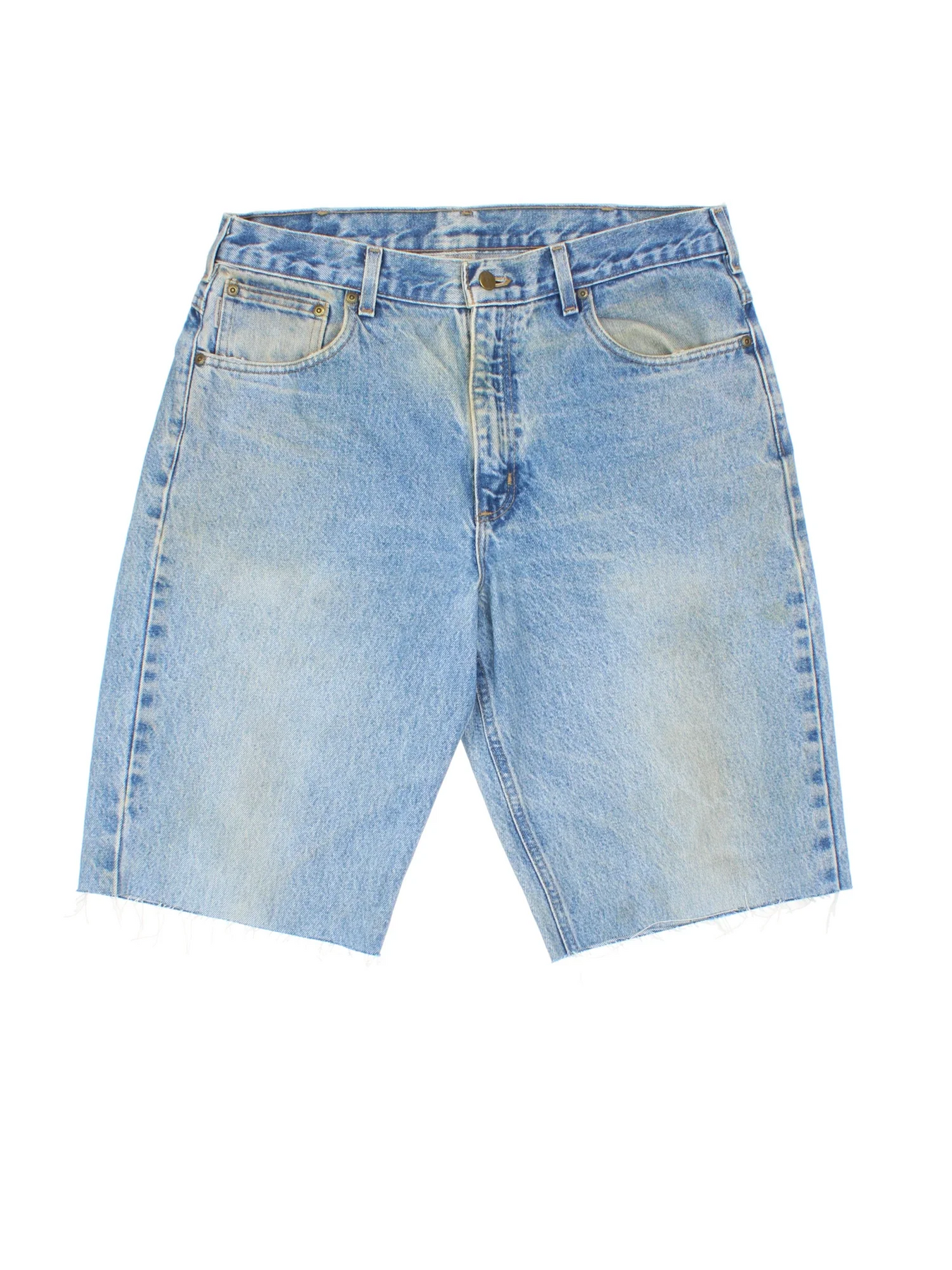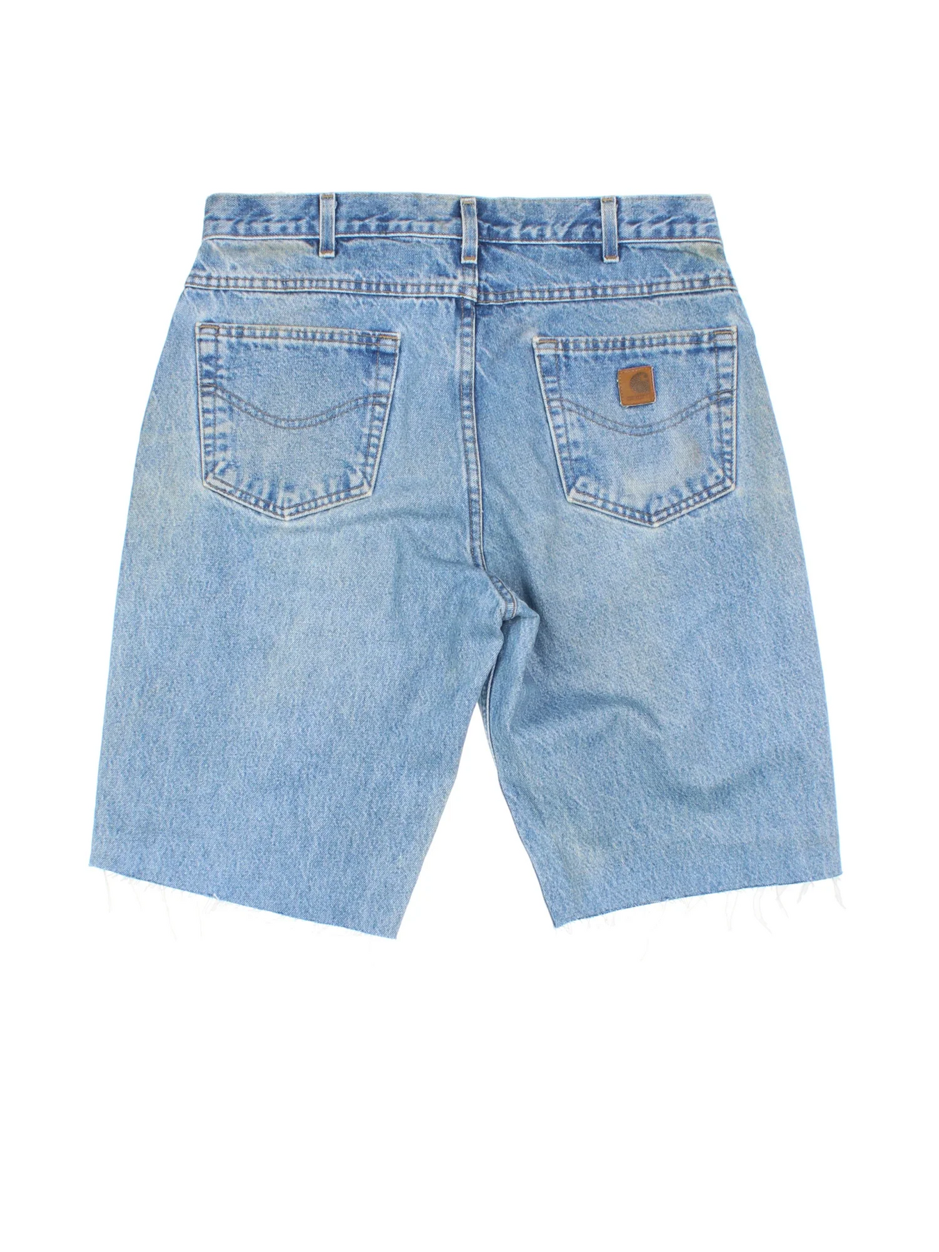 Carhartt Cut Off Shorts in blue colourway. Zip fly fastening with multiple pockets, frayed hem and embroidered branding on the back.
