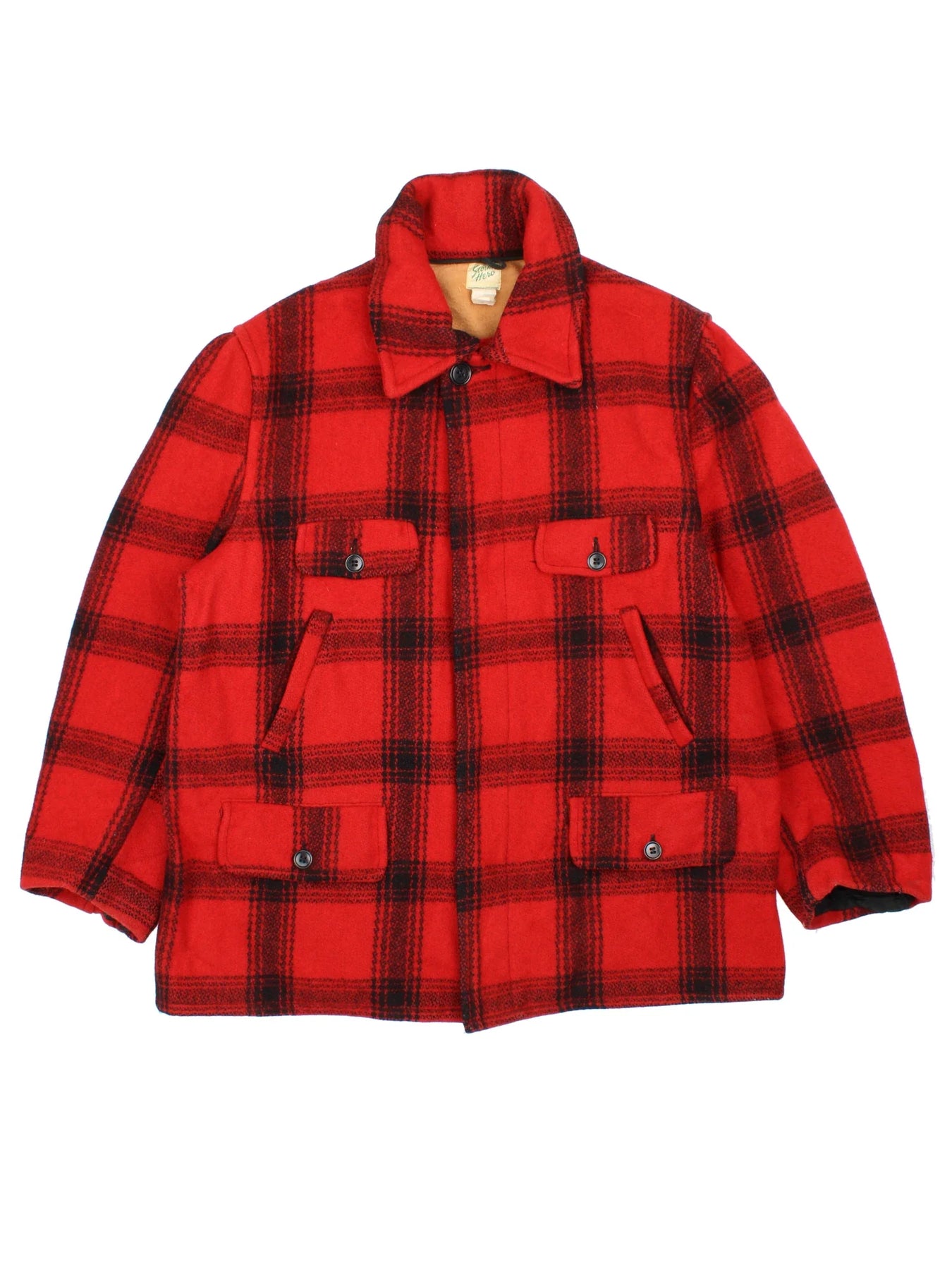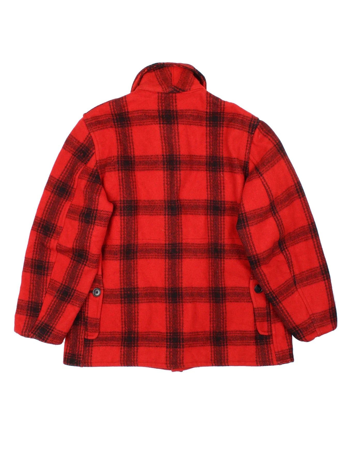 Vintage Woollen Flannel Coat in a red and black colourway with full button up and multiple pockets. All over checked patterning.