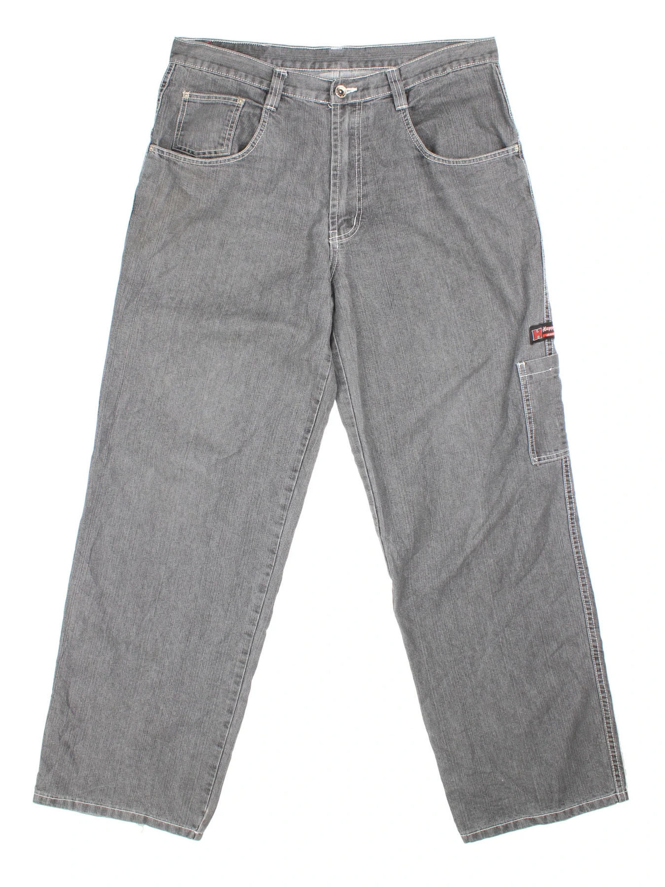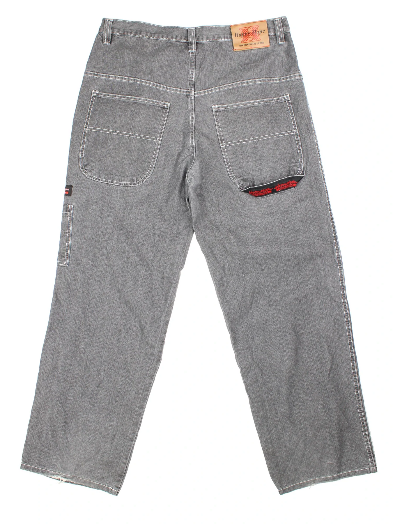 Y2K Happy Hope Jeans in grey colourway with multiple pockets, contrast stitching and embroidered branding on the back.