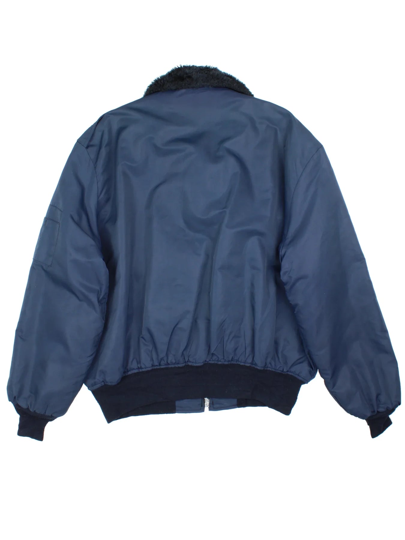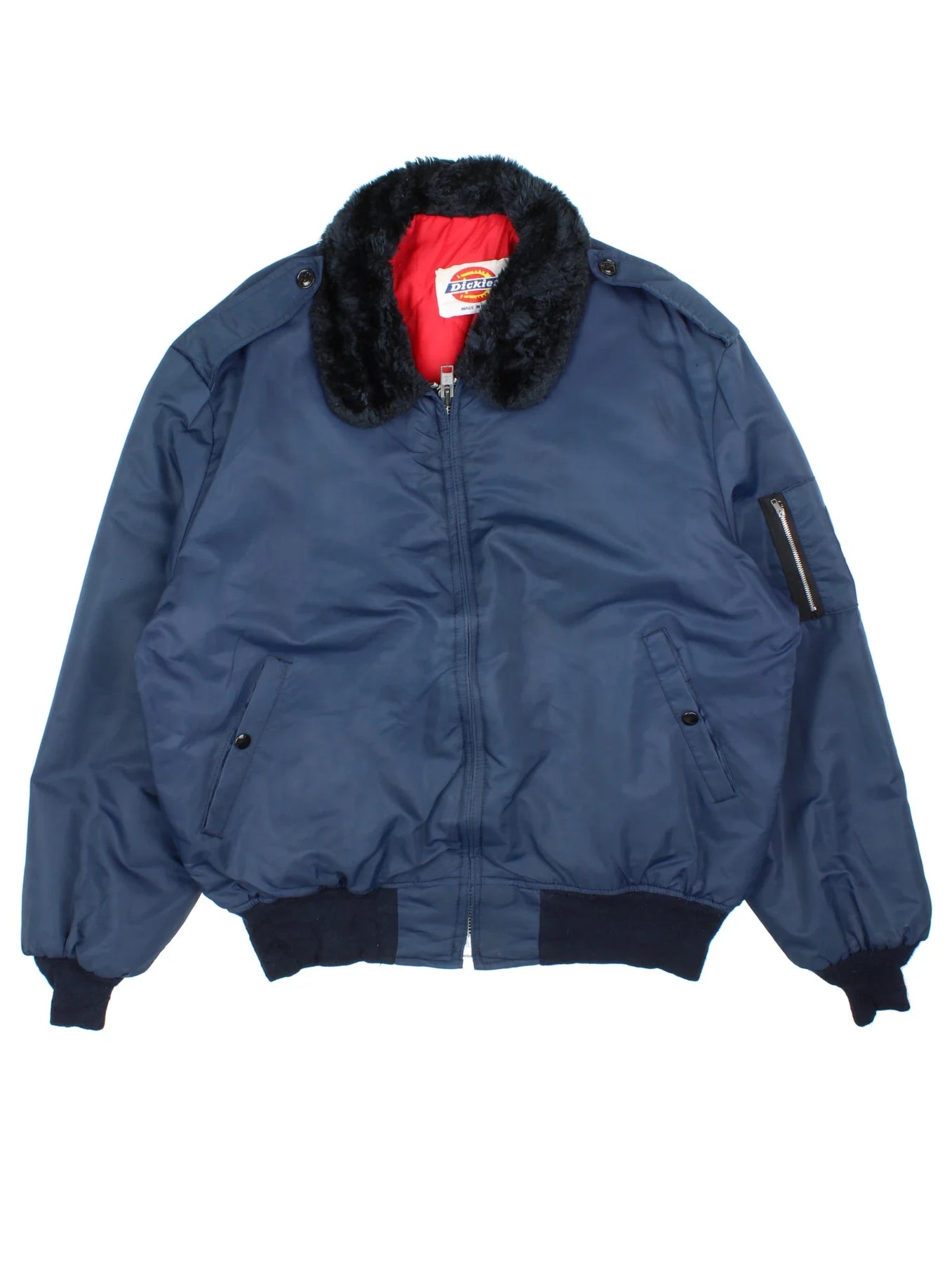 90's Dickies Bomber Jacket in a blue colourway. Zips up and has multiple pockets, insulated with a quilted lining, and a faux fur collar.