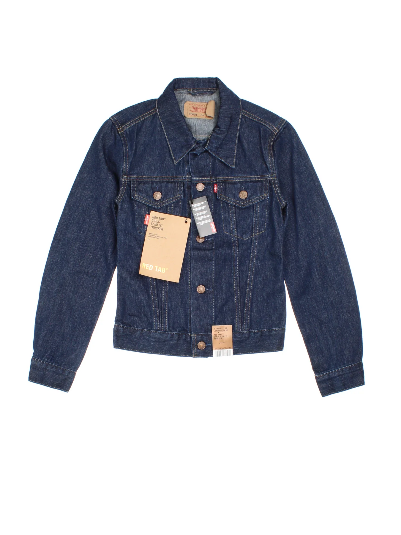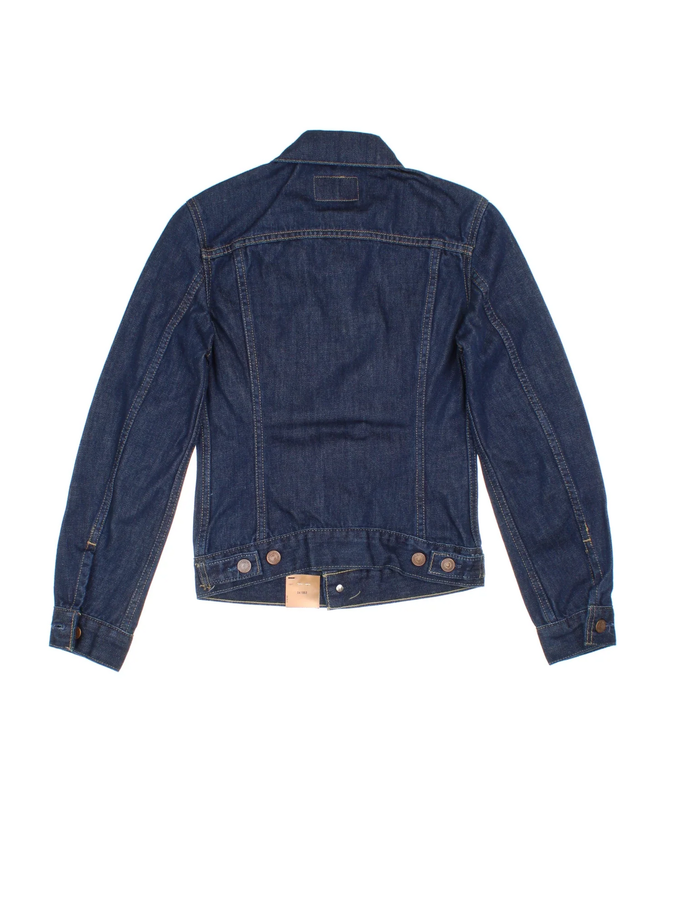 Levi Strauss Denim Trucker Jacket in a blue colourway. Buttons up and has double chest pockets, and the logo tab embroidered on the front, new with tags on.