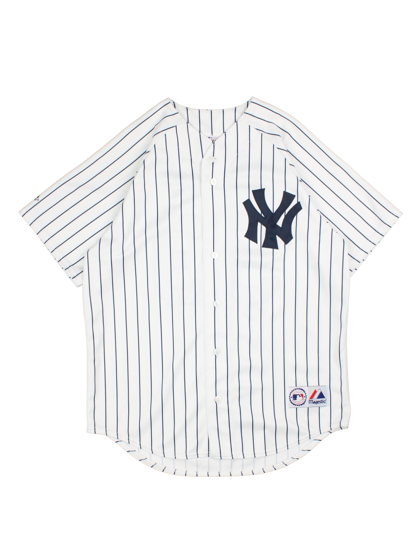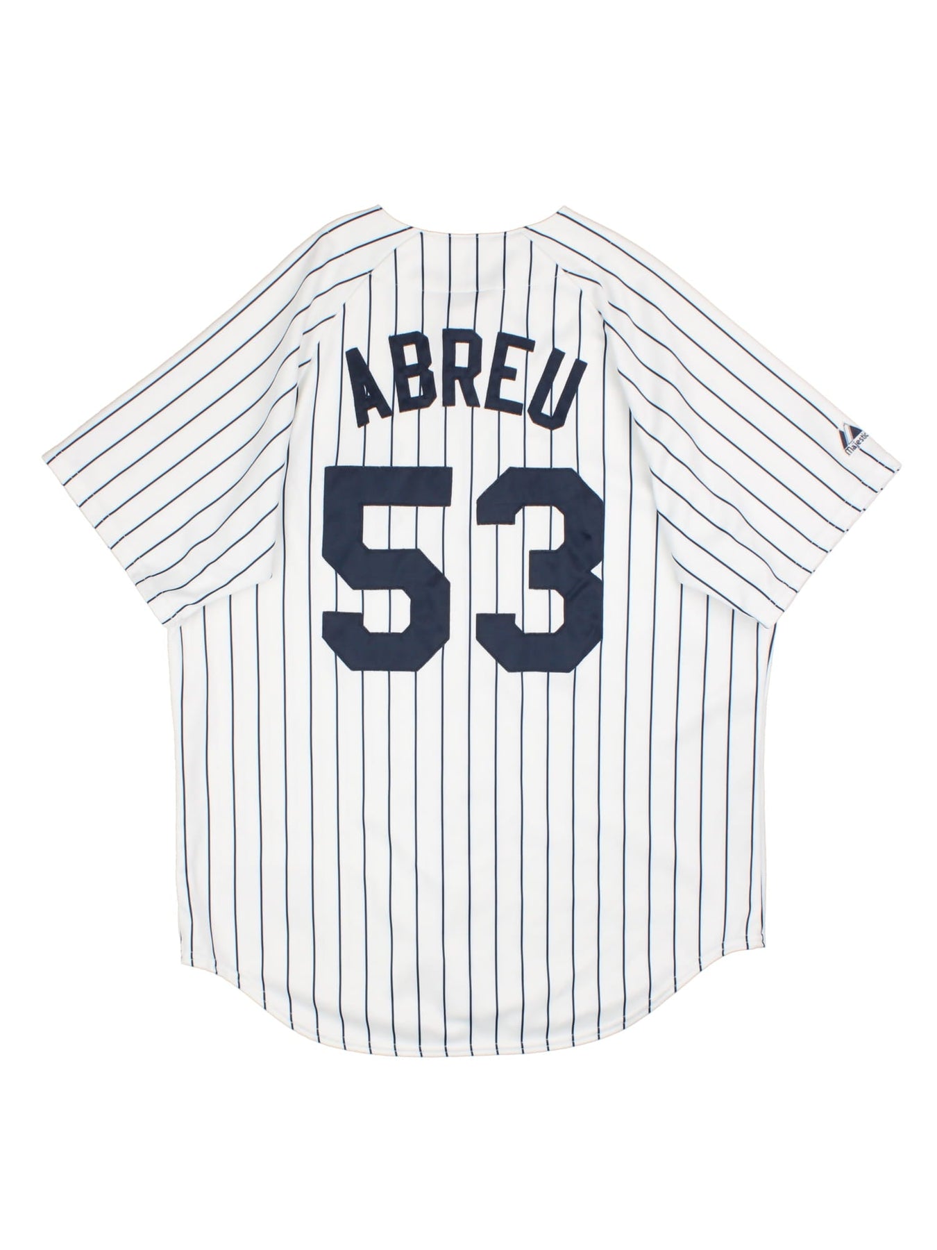 New York Yankees Majestic MLB Jersey in the white home kit colourway, features classic logo on front and traditional blue stripe detailing, button down front, has the player name ABREU and number 53 on the back.