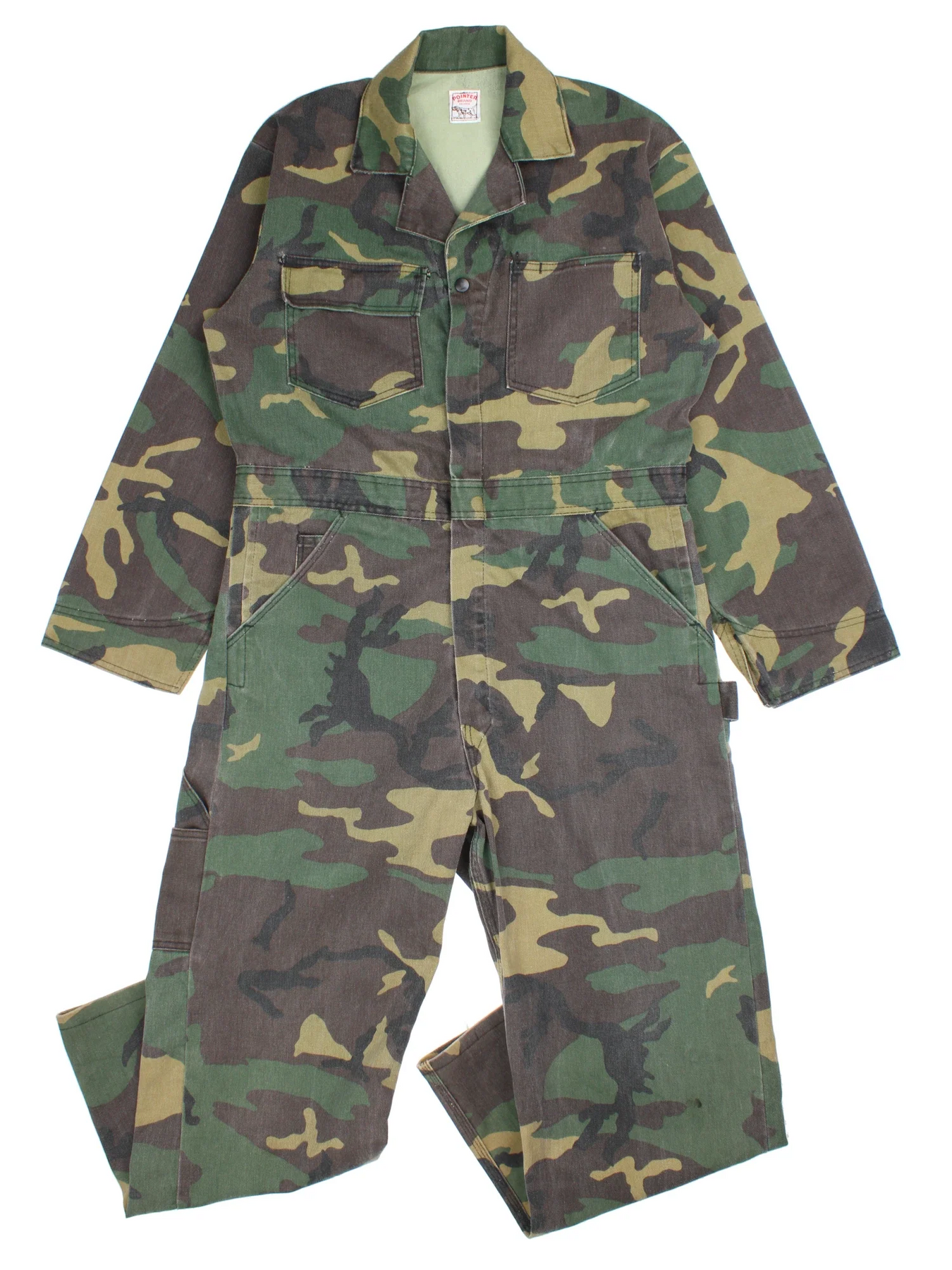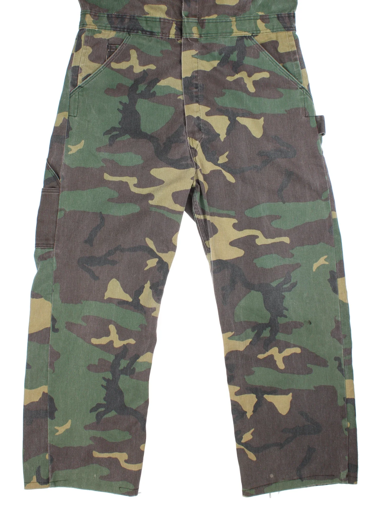 Vintage Pointer Brand Camo Overalls in green and brown colourway with multiple pockets and a button up collar.