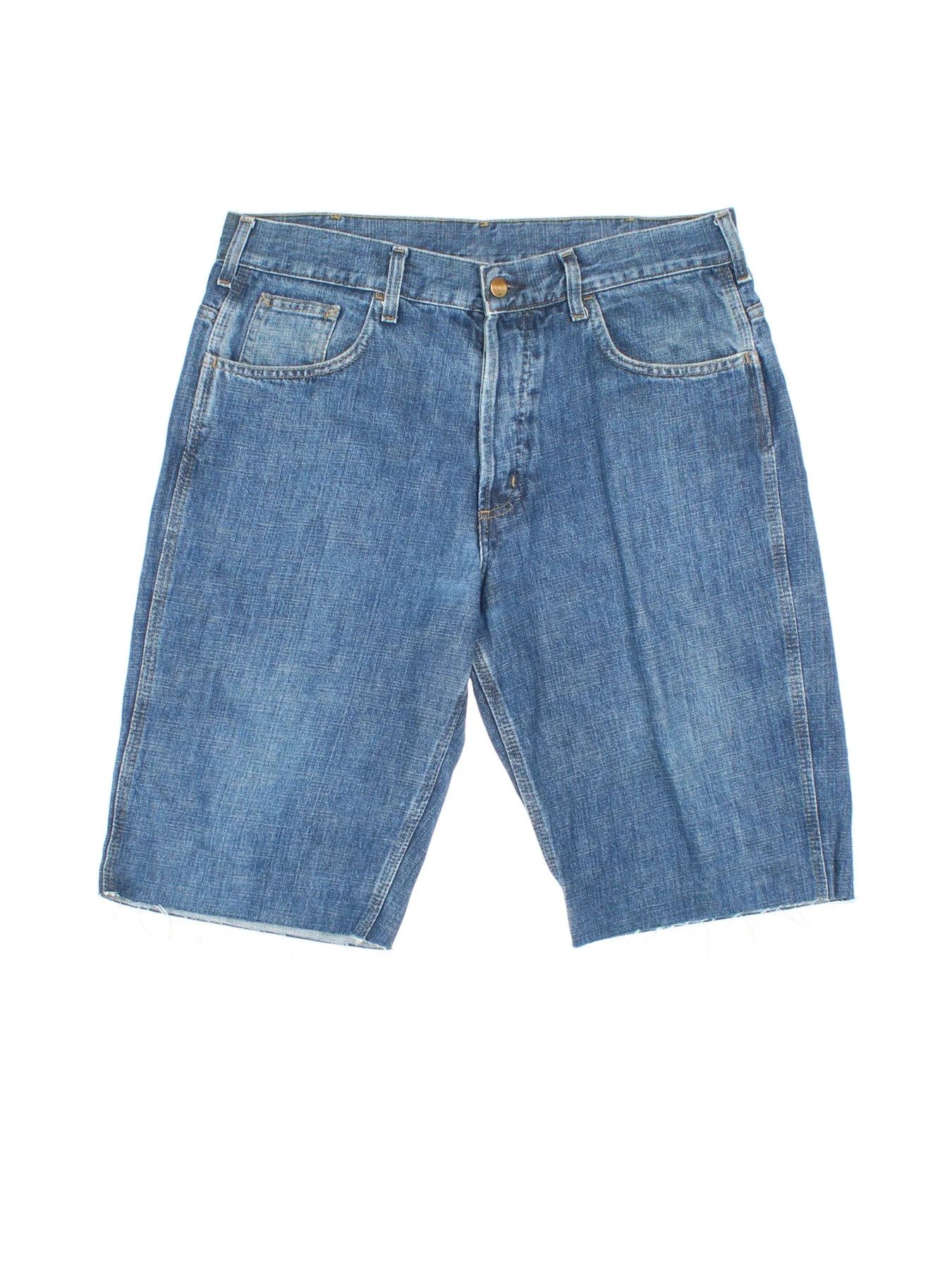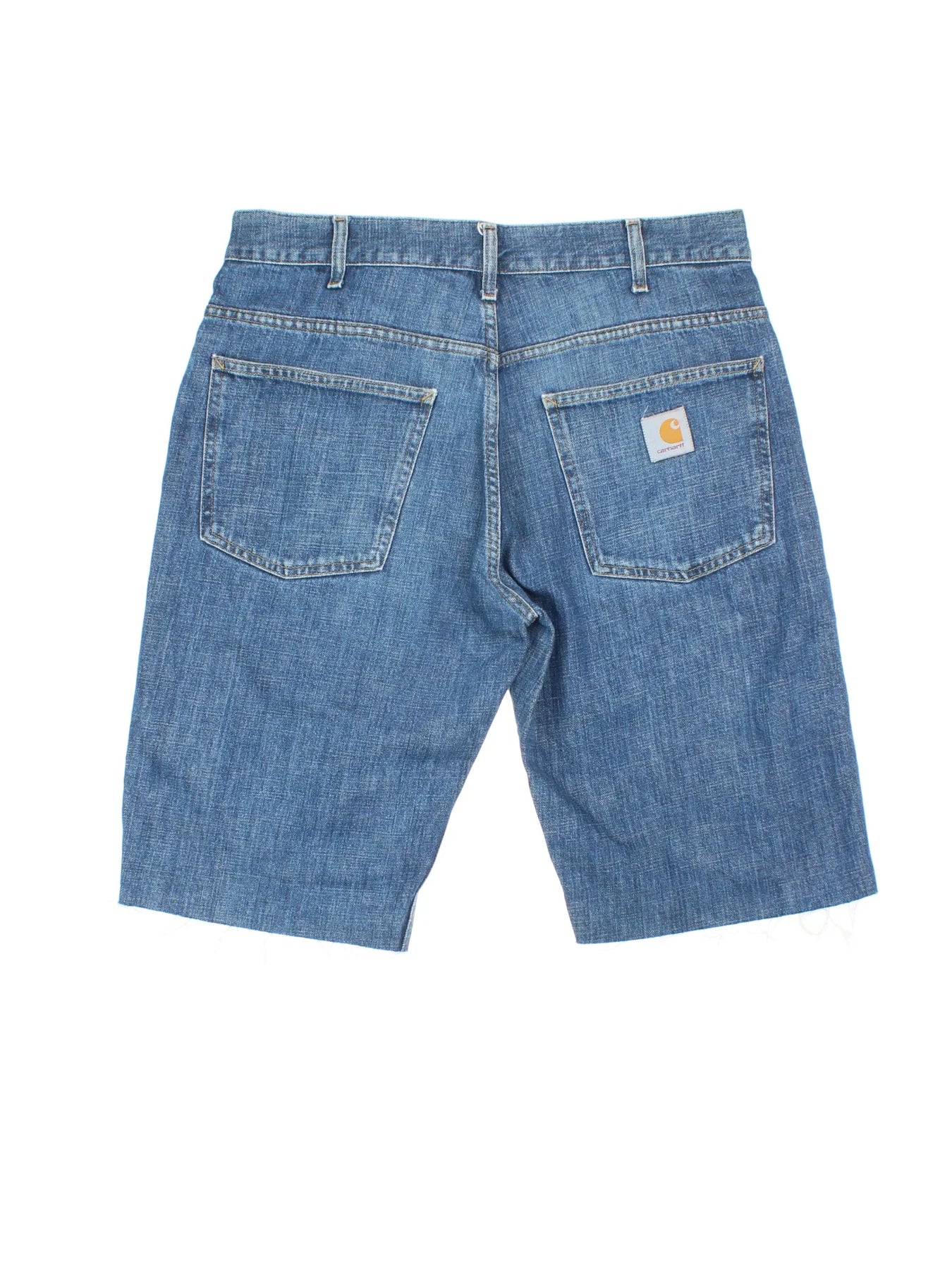 Carhartt Cut Off Shorts in blue colourway. Zip fly fastening with multiple pockets, frayed hem and embroidered branding on the back.