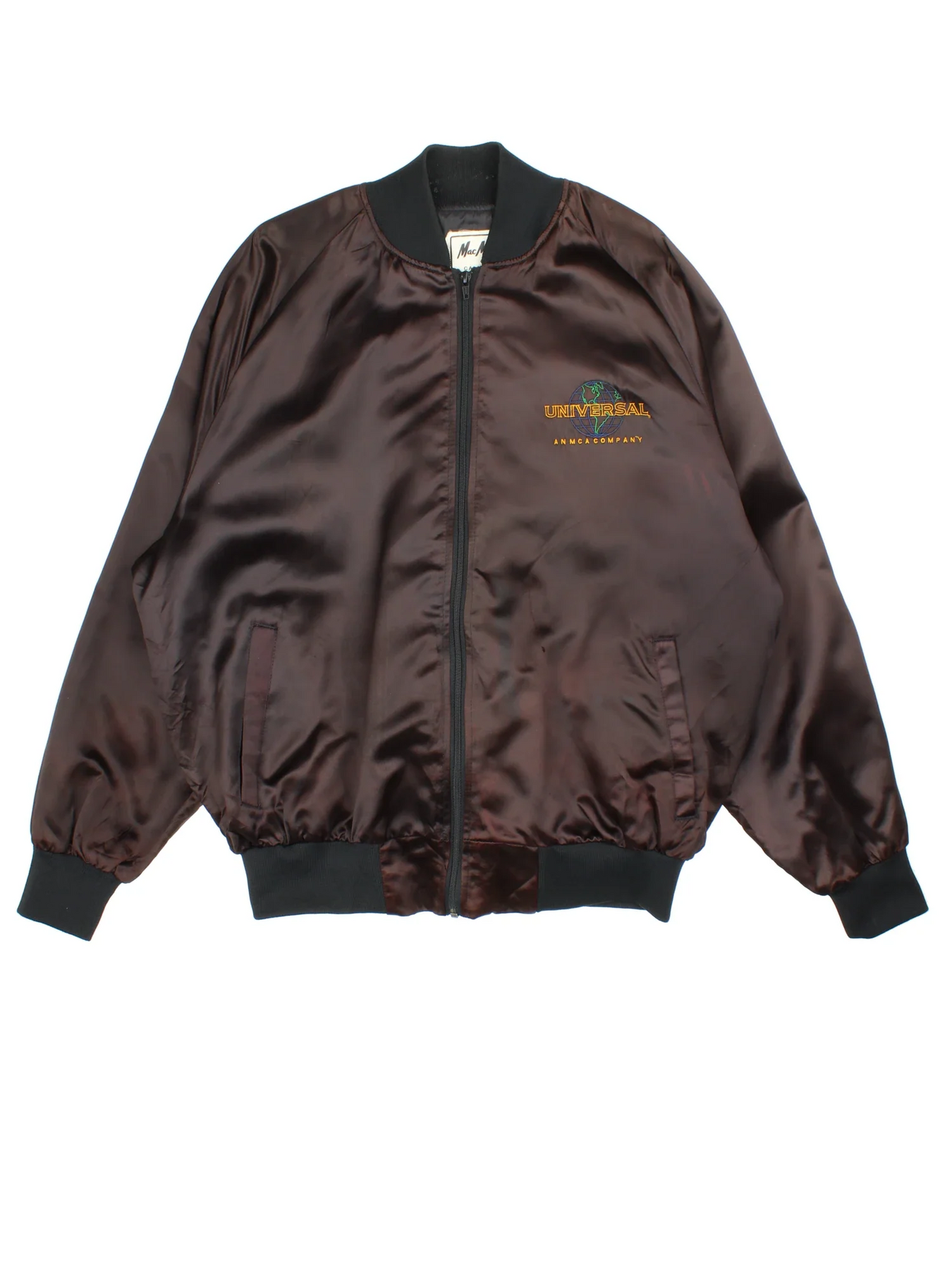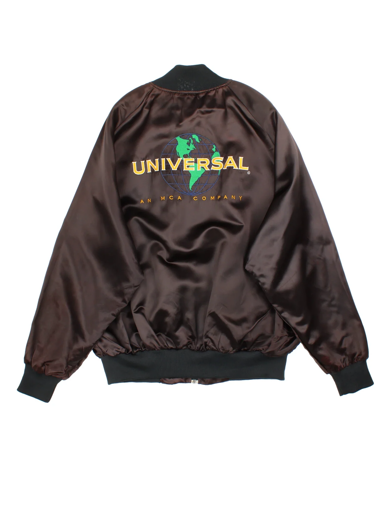 Vintage Universal Studios Varsity Jacket in a brown colourway. Zips up and has side pockets, and the logo embroidered on the front and back.