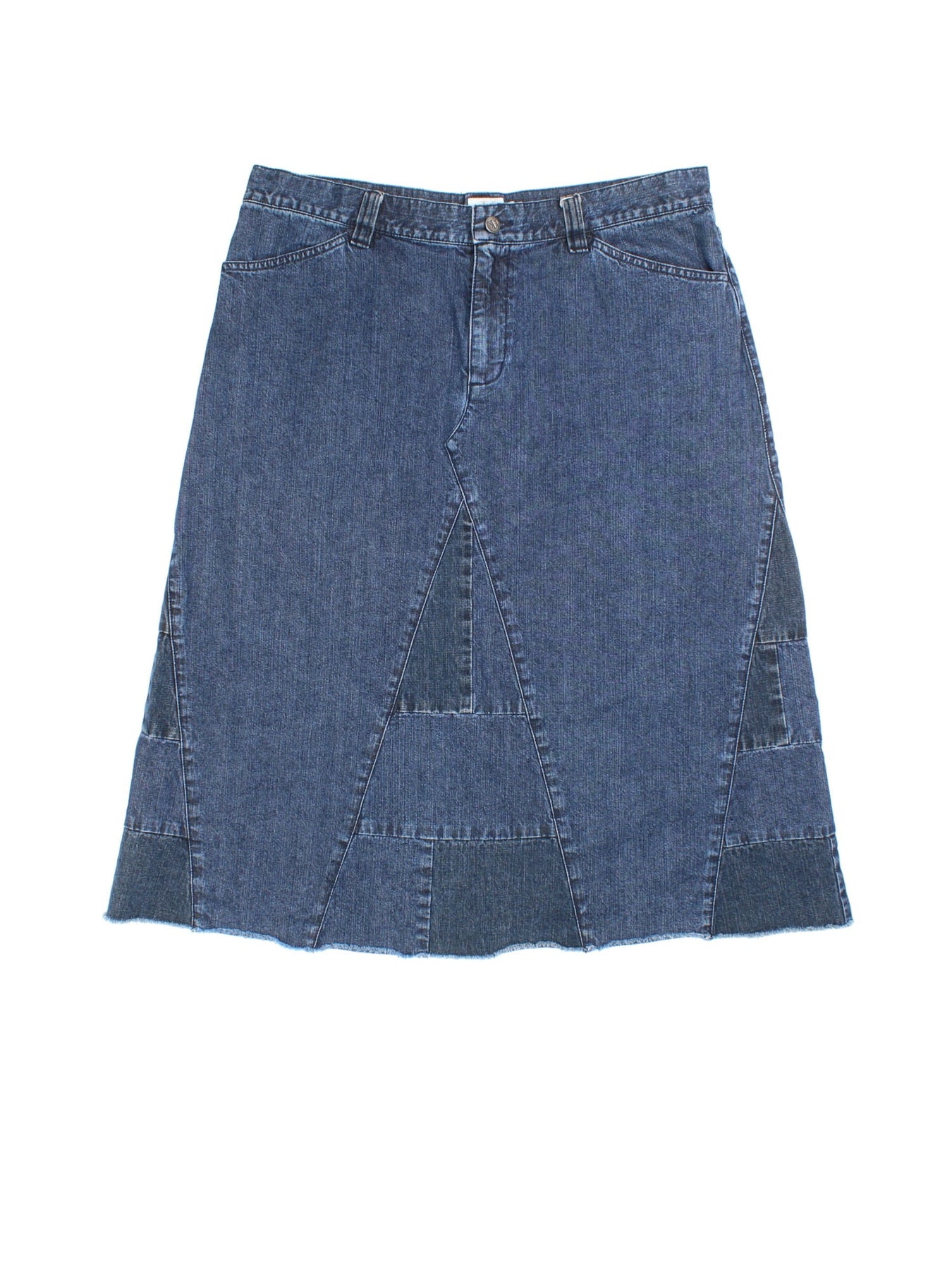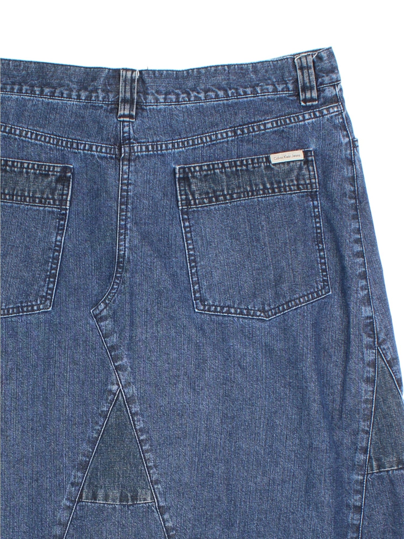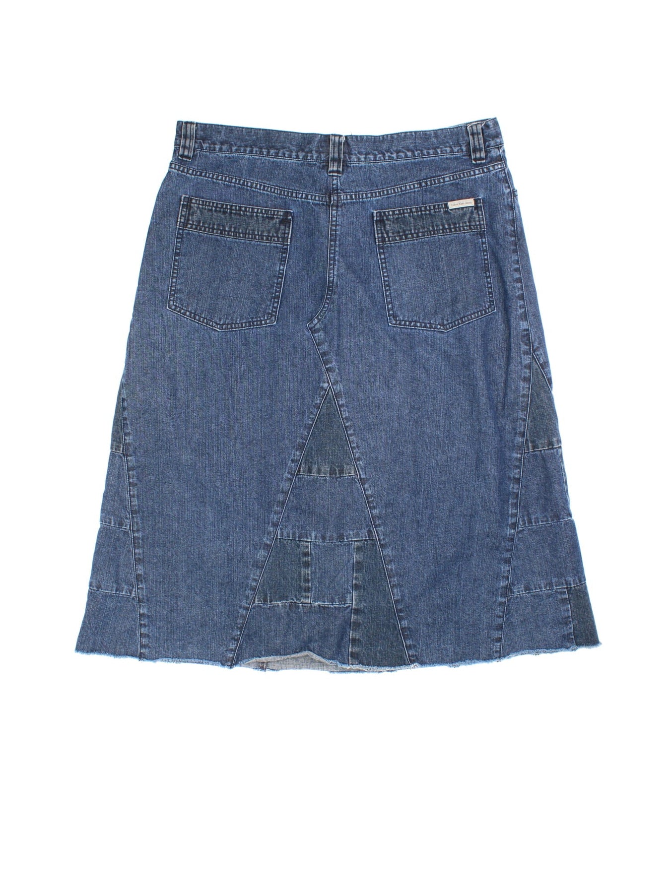 Y2K Calvin Klein Denim Skirt in blue colourway. Button/zip fastening, multi denim panel detailing and branding on back pocket.