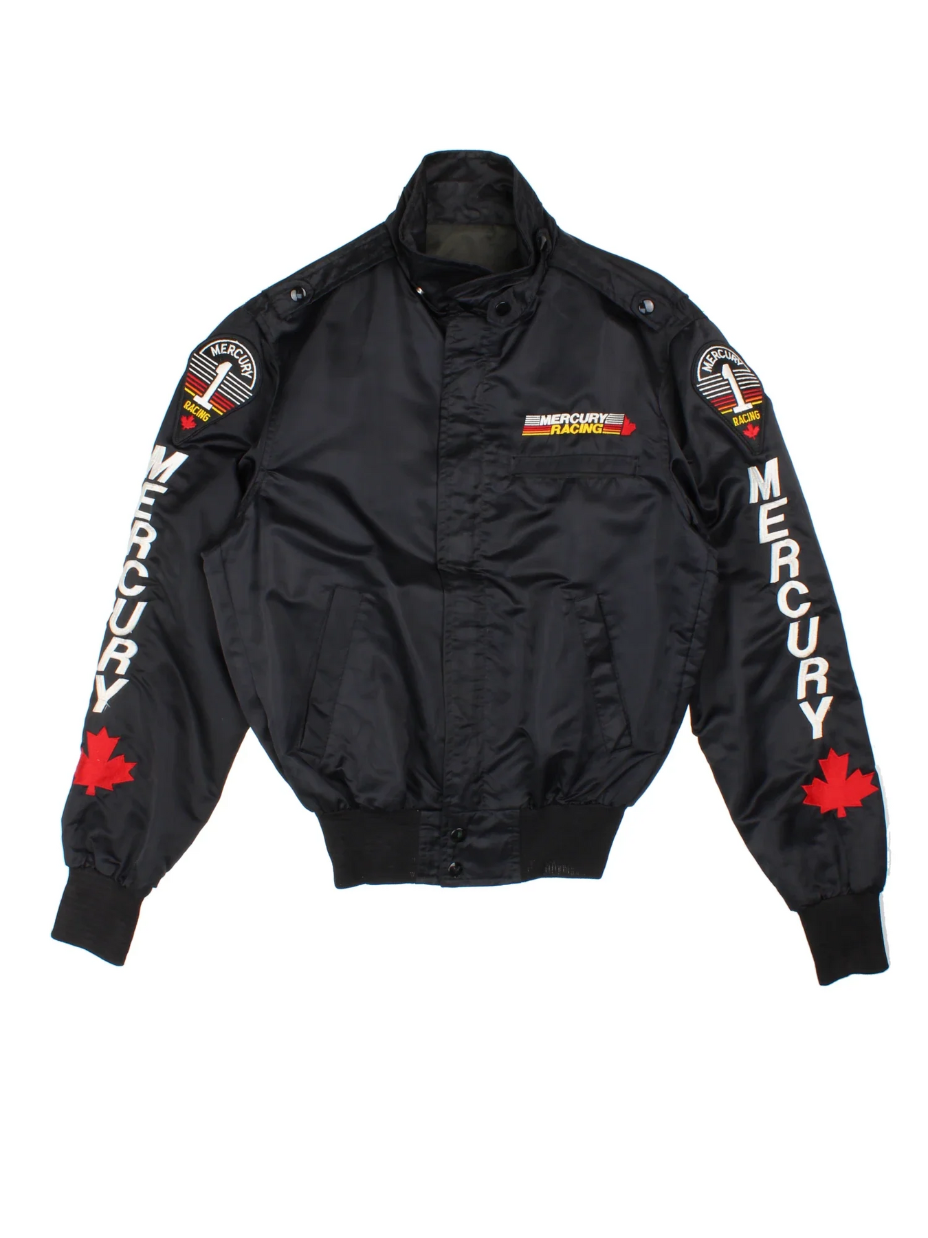 Mercury Racing Nascar Jacket in a black colourway. Zips up and has multiple pockets, and the logo / spell out embroidered on the front and sleeves.