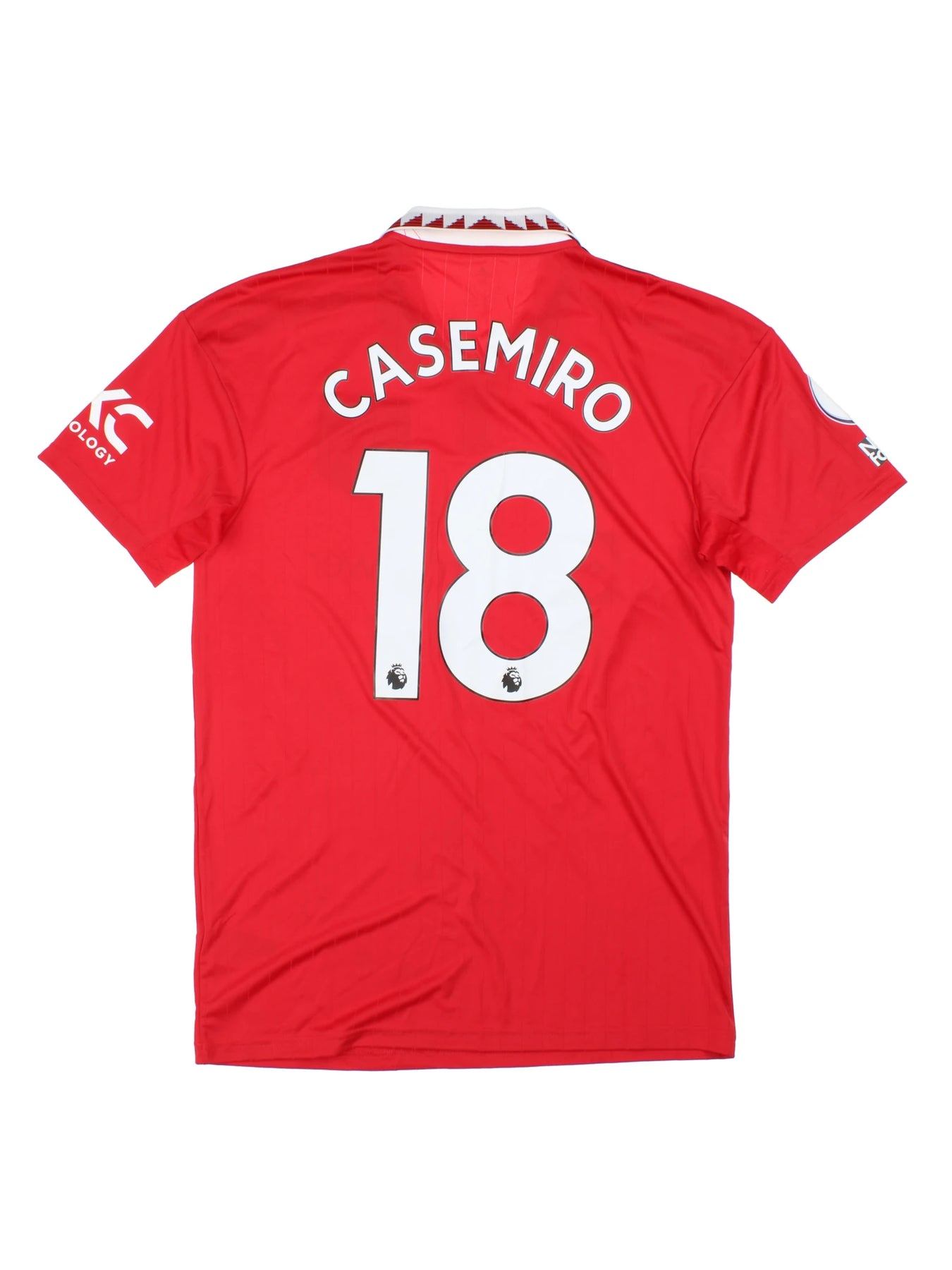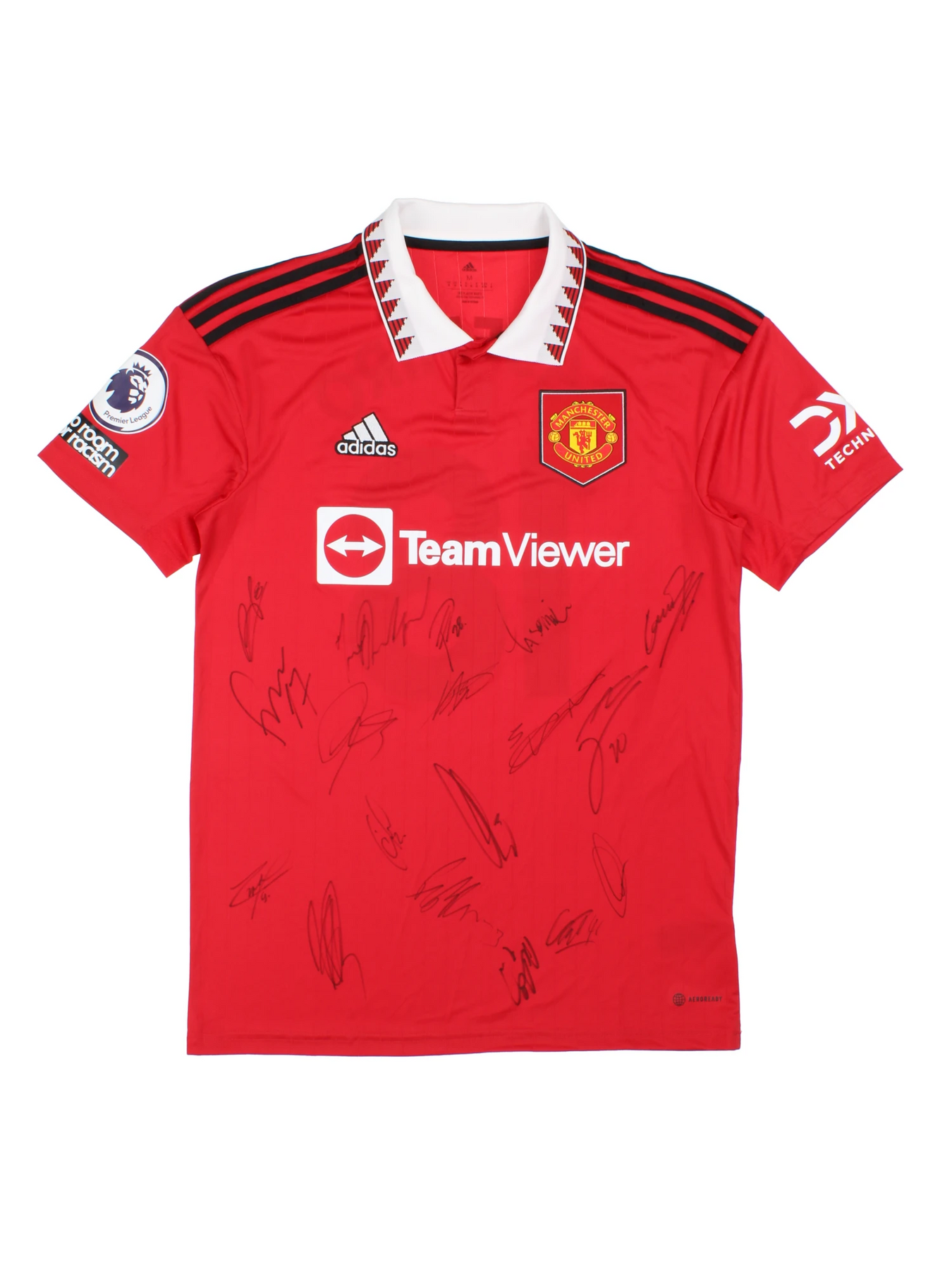 Celebrate your love for football with the iconic Adidas Manchester United Casemiro 18 Signed 2022/23 Home Shirt in vibrant red. This authentic team jersey, crafted from high-quality polyester, captures the spirit of Premier League action with signature details including the official club crest, sponsor branding, and a classic polo-style collar. Personalised with Casemiro's name and number 18 on the back, this shirt is further enhanced by multiple autographs from Manchester United first team players, making it a true collector's piece. In a comfortable S size, it offers a modern fit for sports or casual occasions. Perfect for fans, collectors, or as a standout gift, wear your team pride and add a piece of football history to your wardrobe.