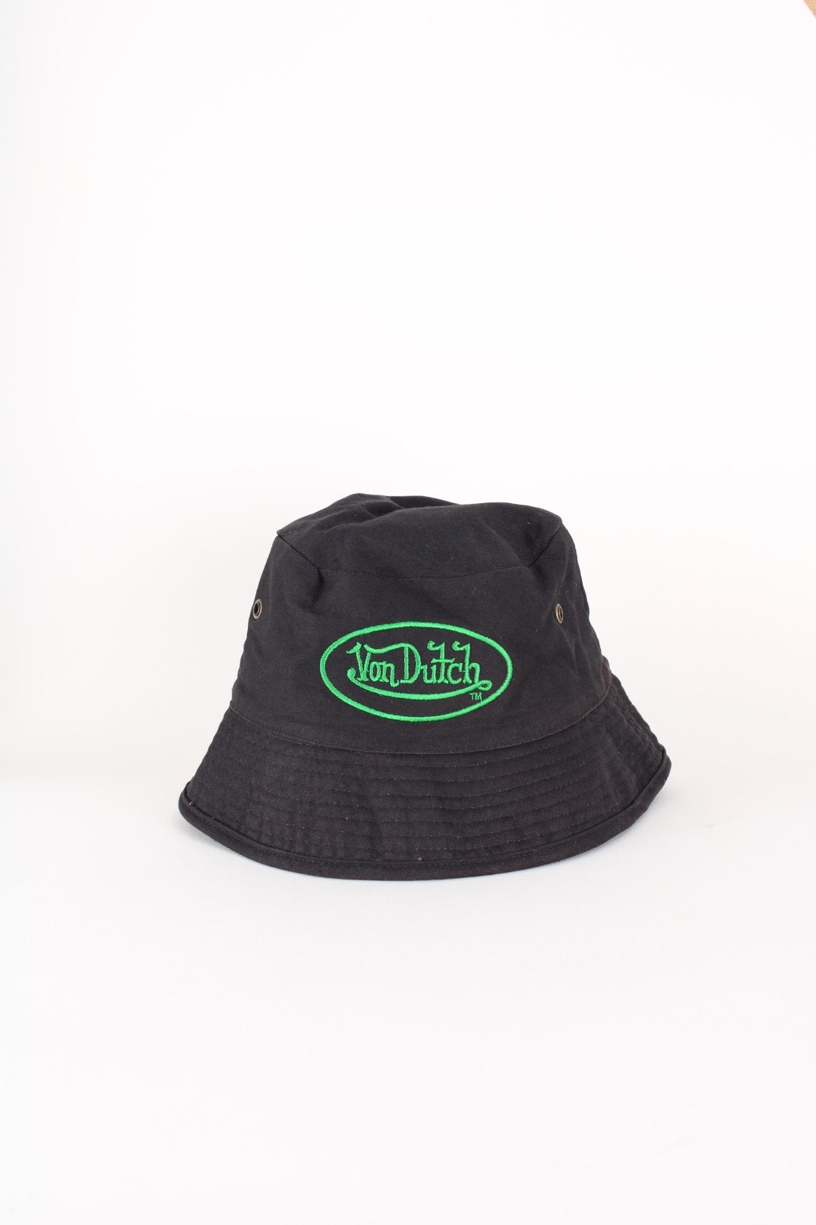 Y2K Von Dutch Reversible Bucket Hat in either a black or beige colourway options, and has the logo embroidered on.