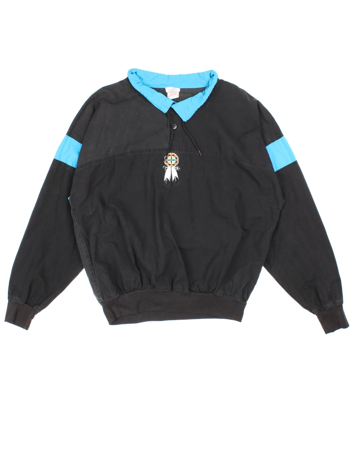 Vintage 1993 Jocky Mountain Windbreaker in a black colourway. Features contrast collar/panelling, and graphic embroidered on the front/printed on the back.