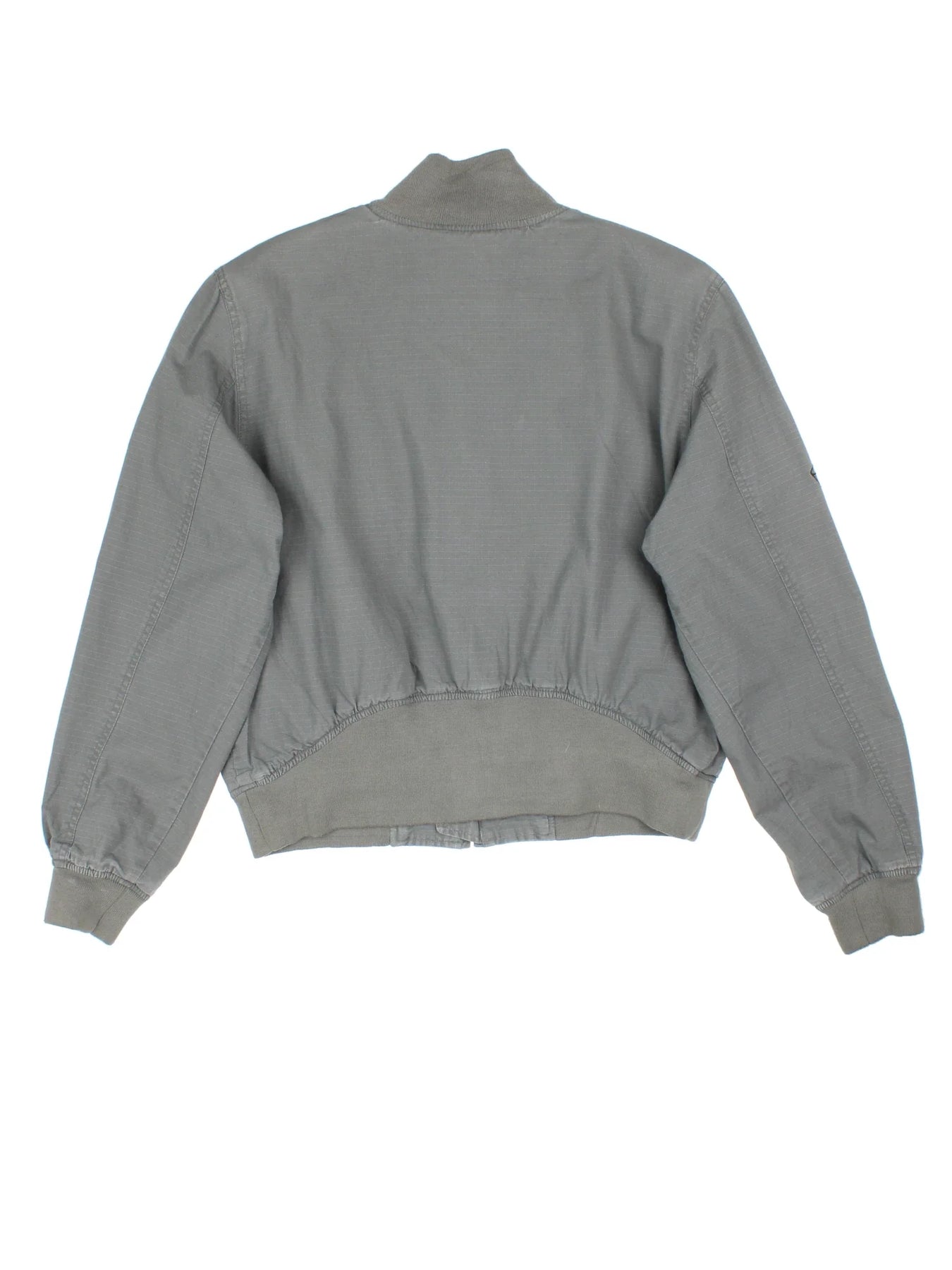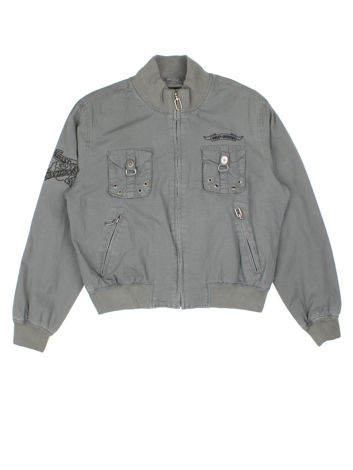 Harley-Davidson Bomber Jacket in a grey colourway. Zips up and has multiple pockets, and the logo embroidered on the front and right sleeve.