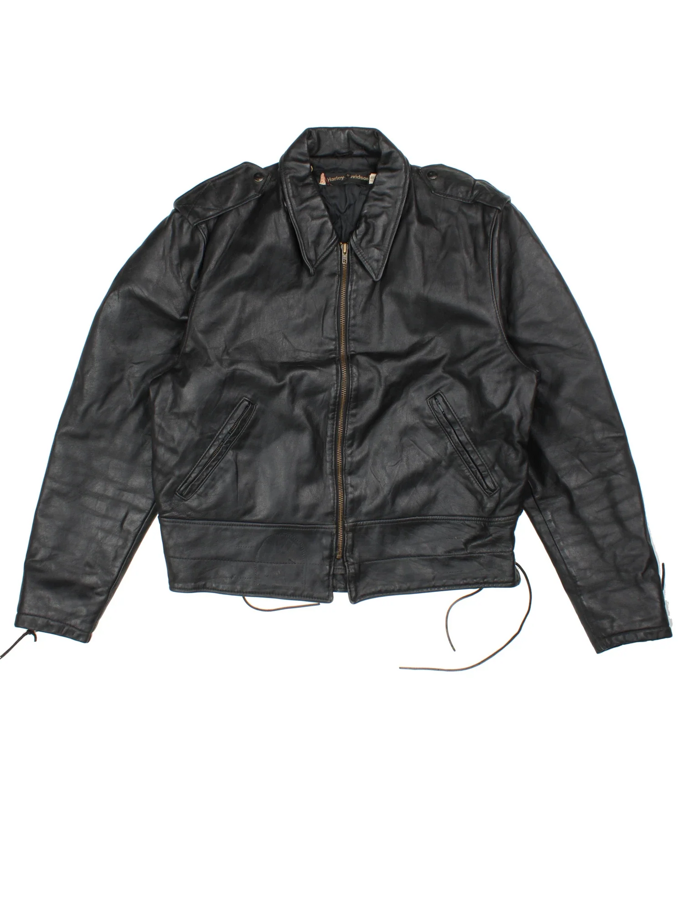 Vintage Harley-Davidson Embroidered Leather Motorcycle Jacket in a black colourway. Zips up and has multiple pockets, insulated with a quilted lining, side tie detail and branding embroidered on the back.