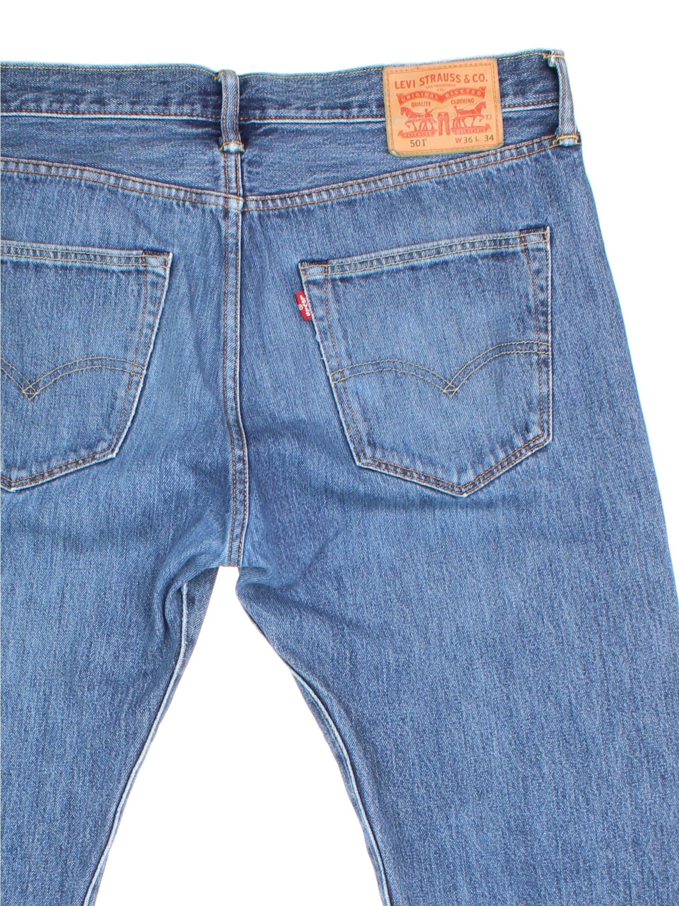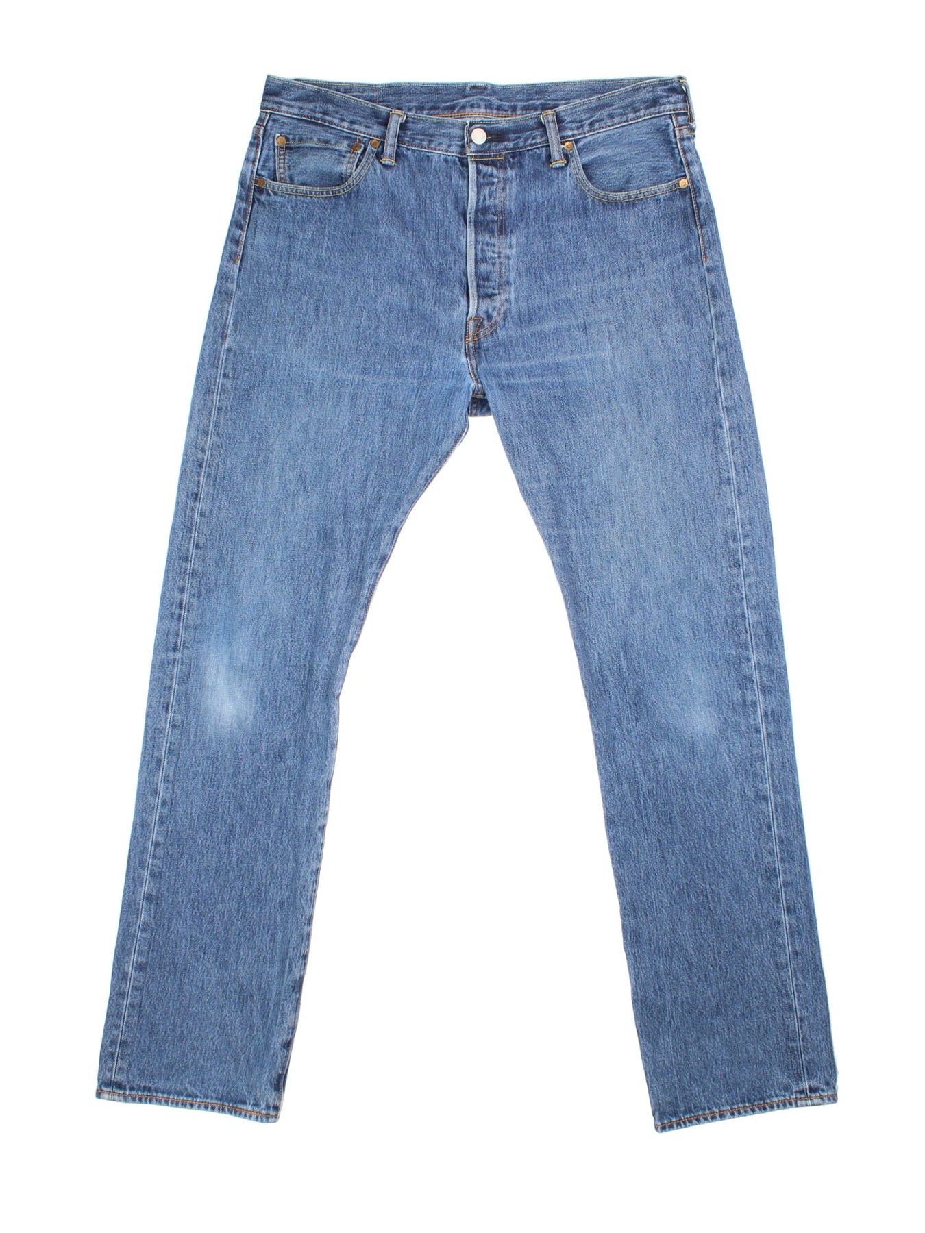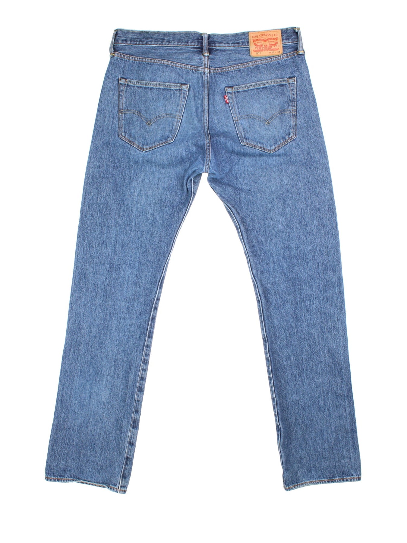 Levi Strauss 501 jeans in blue colourway with button up fly, straight leg and leather logo patch on the back.