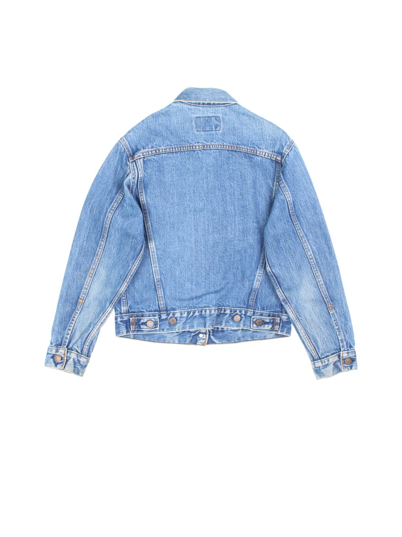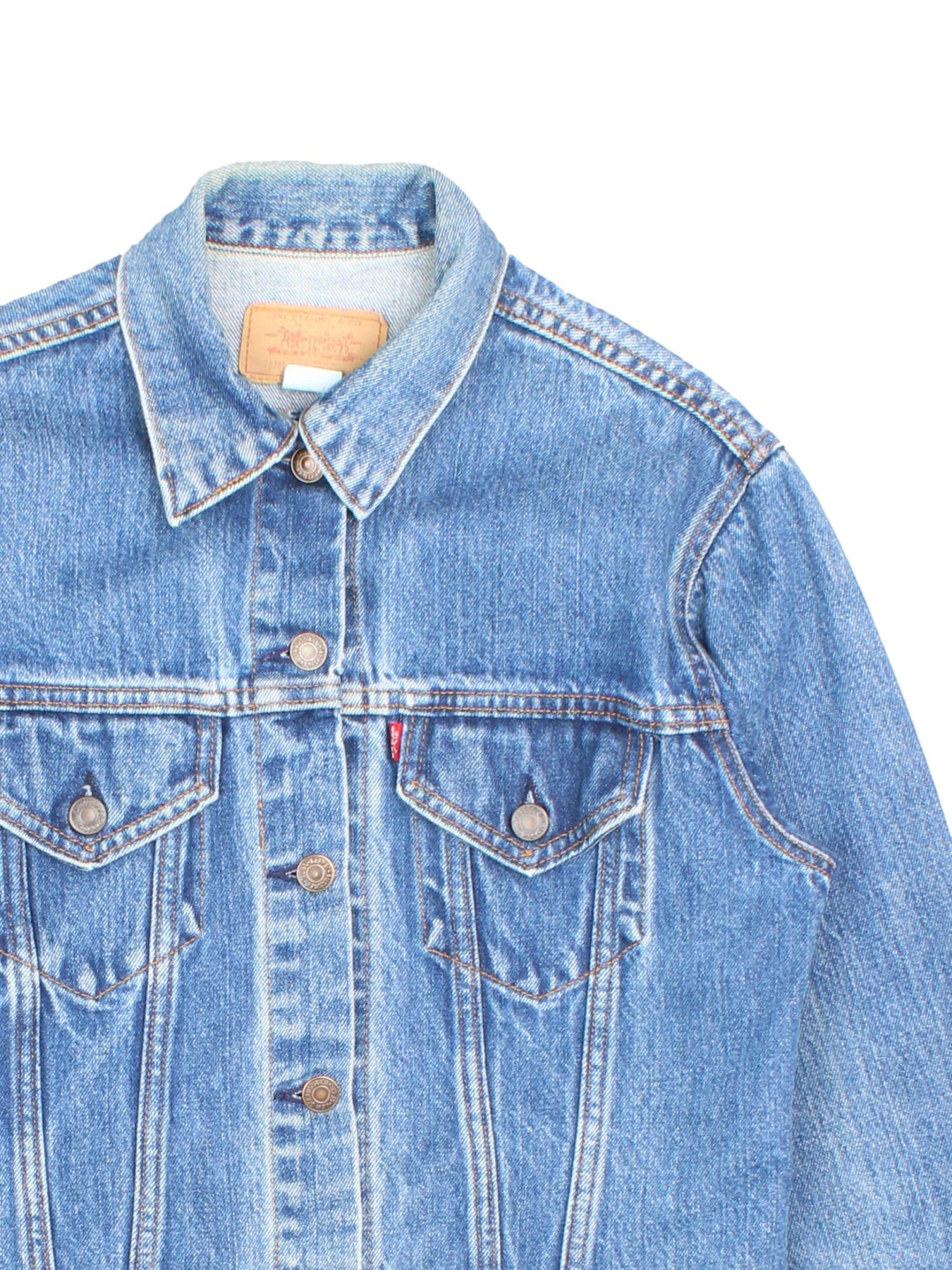 Levi Strauss trucker denim jacket in blue with two pockets, button closure, and a red tab on the front.