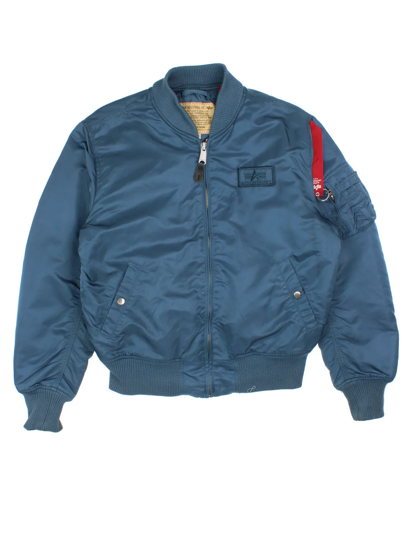 Alpha Industries Bomber Jacket in a blue colourway. Zips up and has multiple pockets, insulated with a quilted lining, and has velcro patch logo on the front.