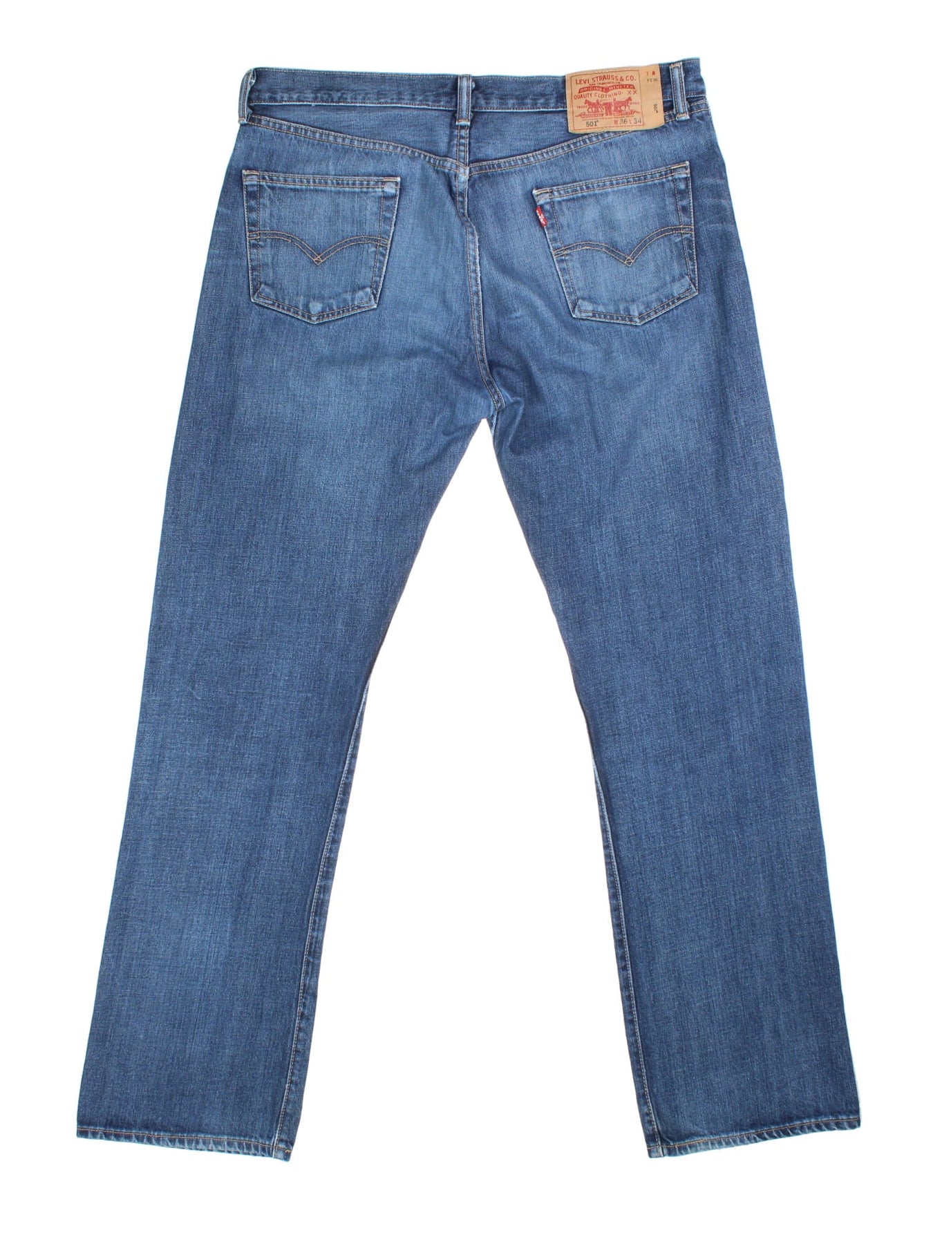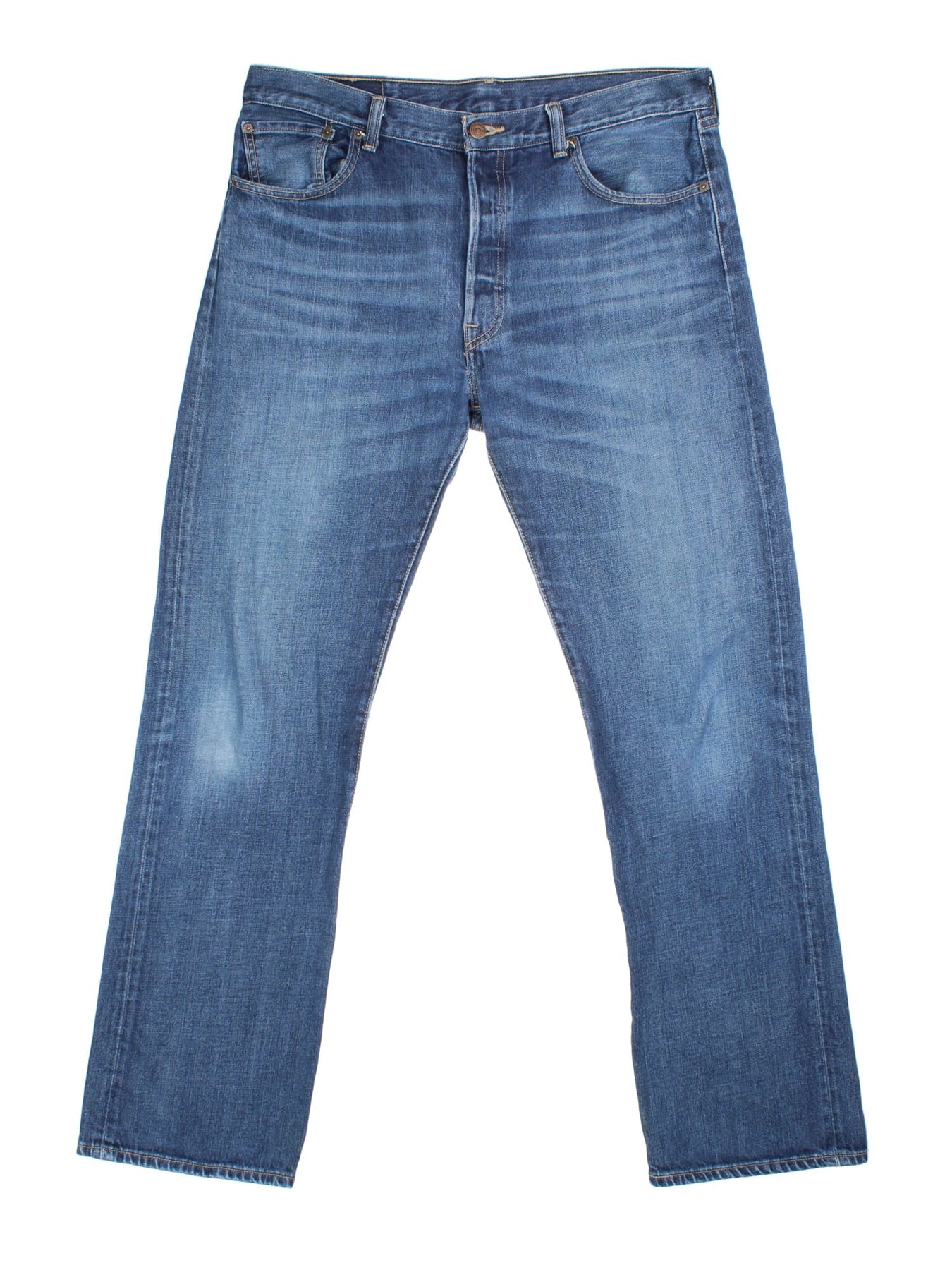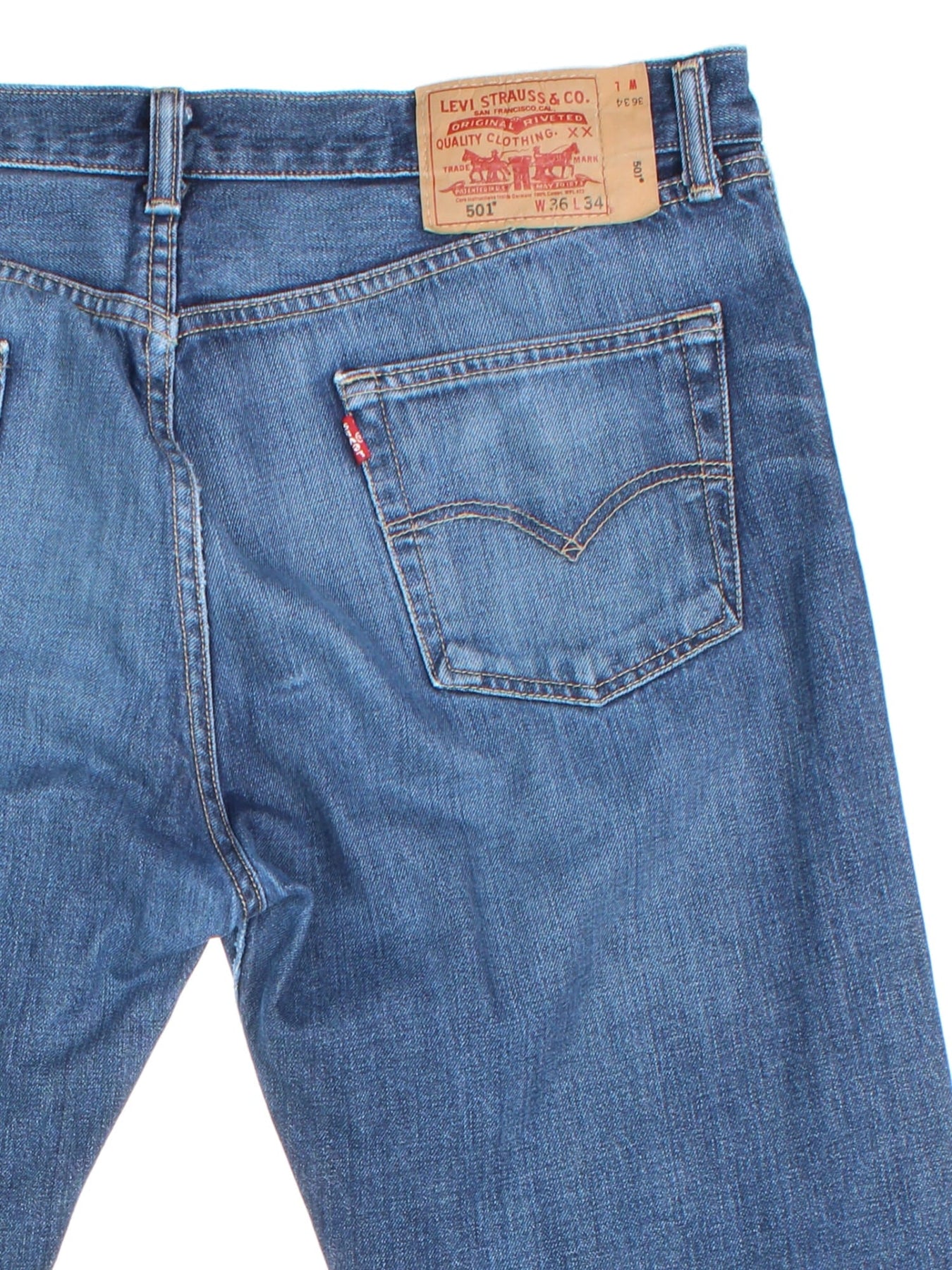 Levi Strauss 501 Jeans in blue colourway with multiple pockets and the logo tab embroidered on the back.