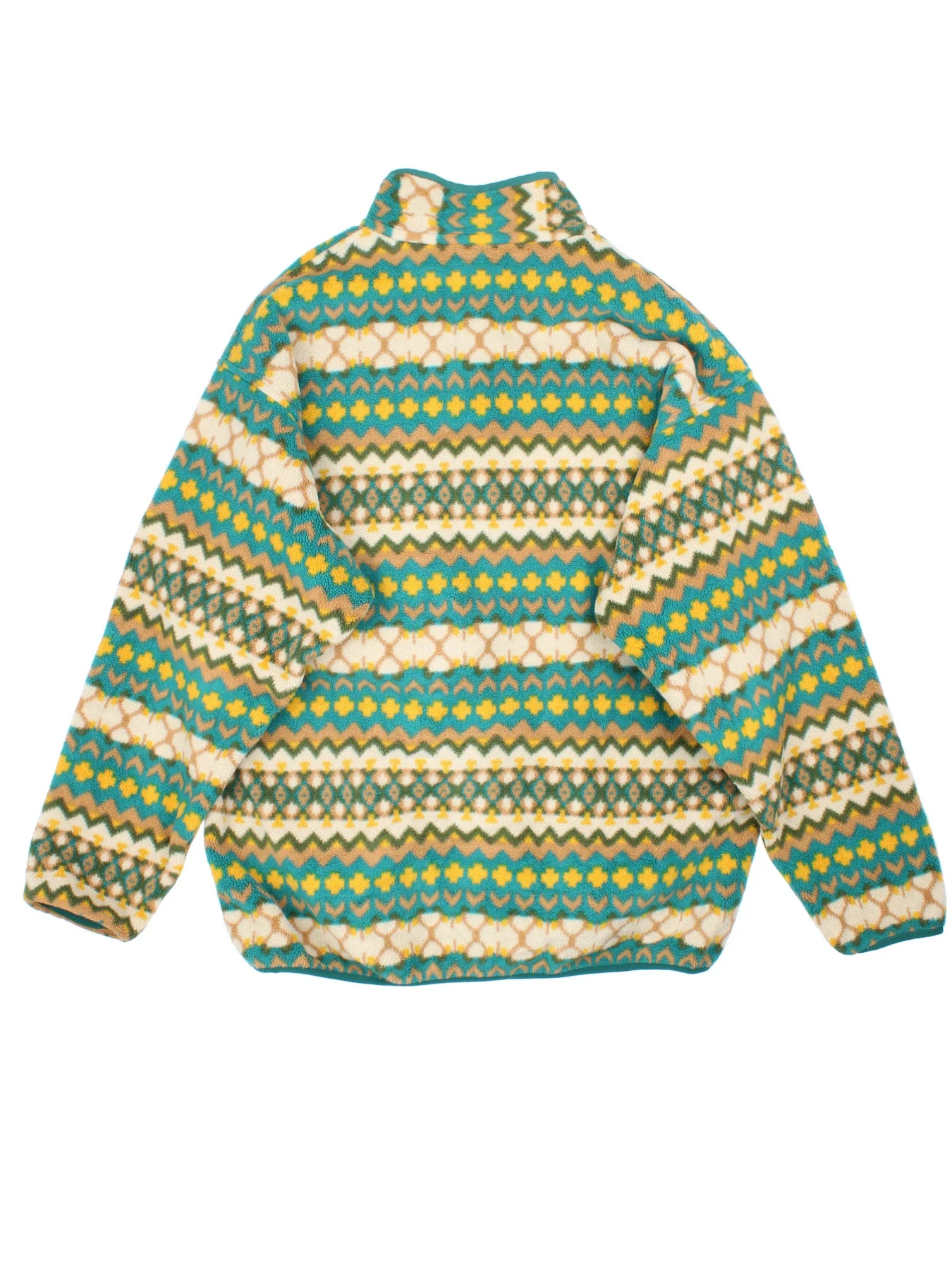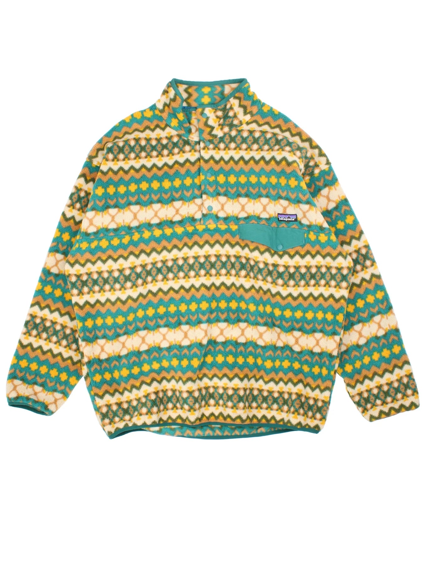 Vintage Patagonia Synchilla Snap-T Fleece in a green/yellow patterned colourway. x3 button popper fastening, with front pocket and embroidered logo on the front.