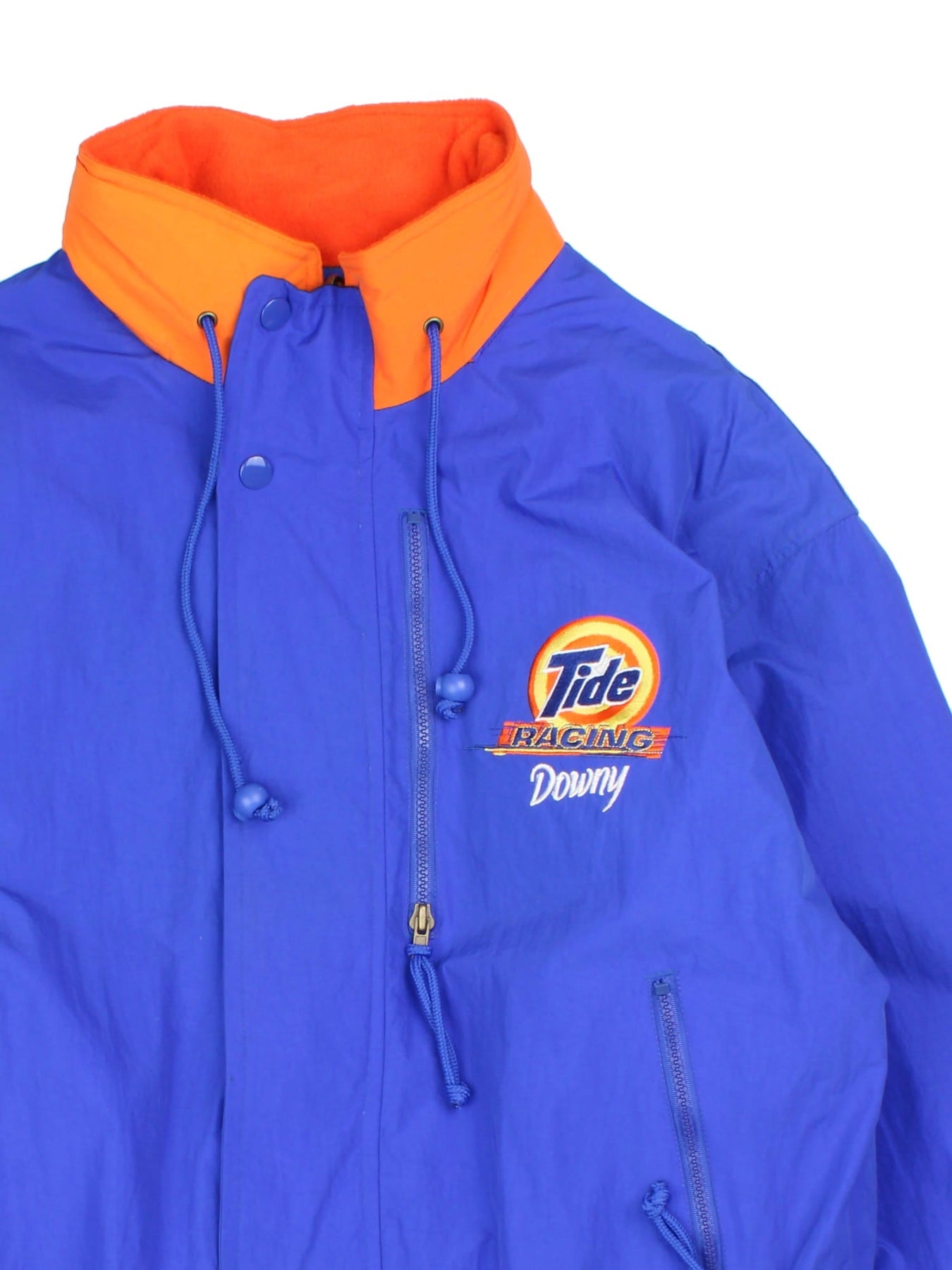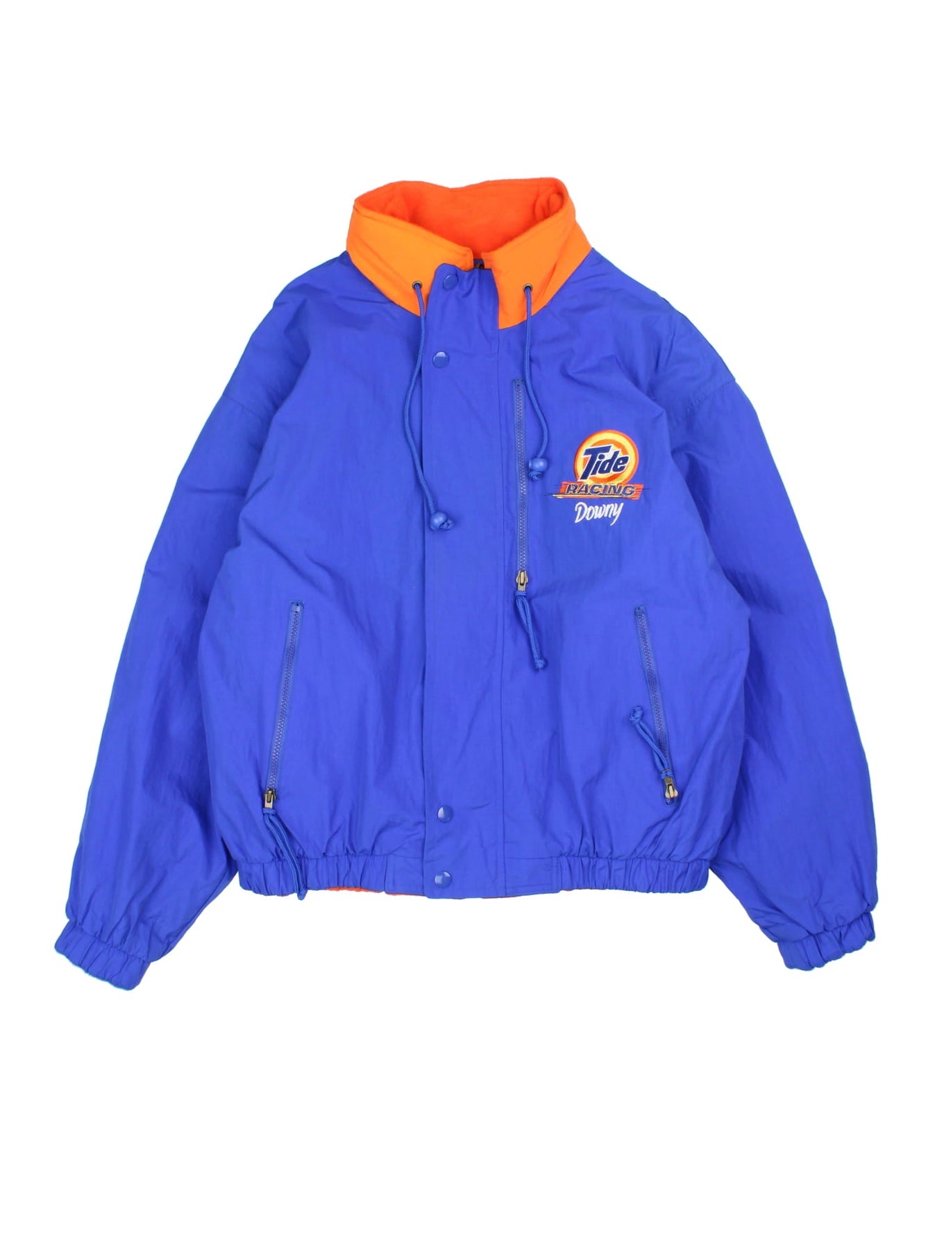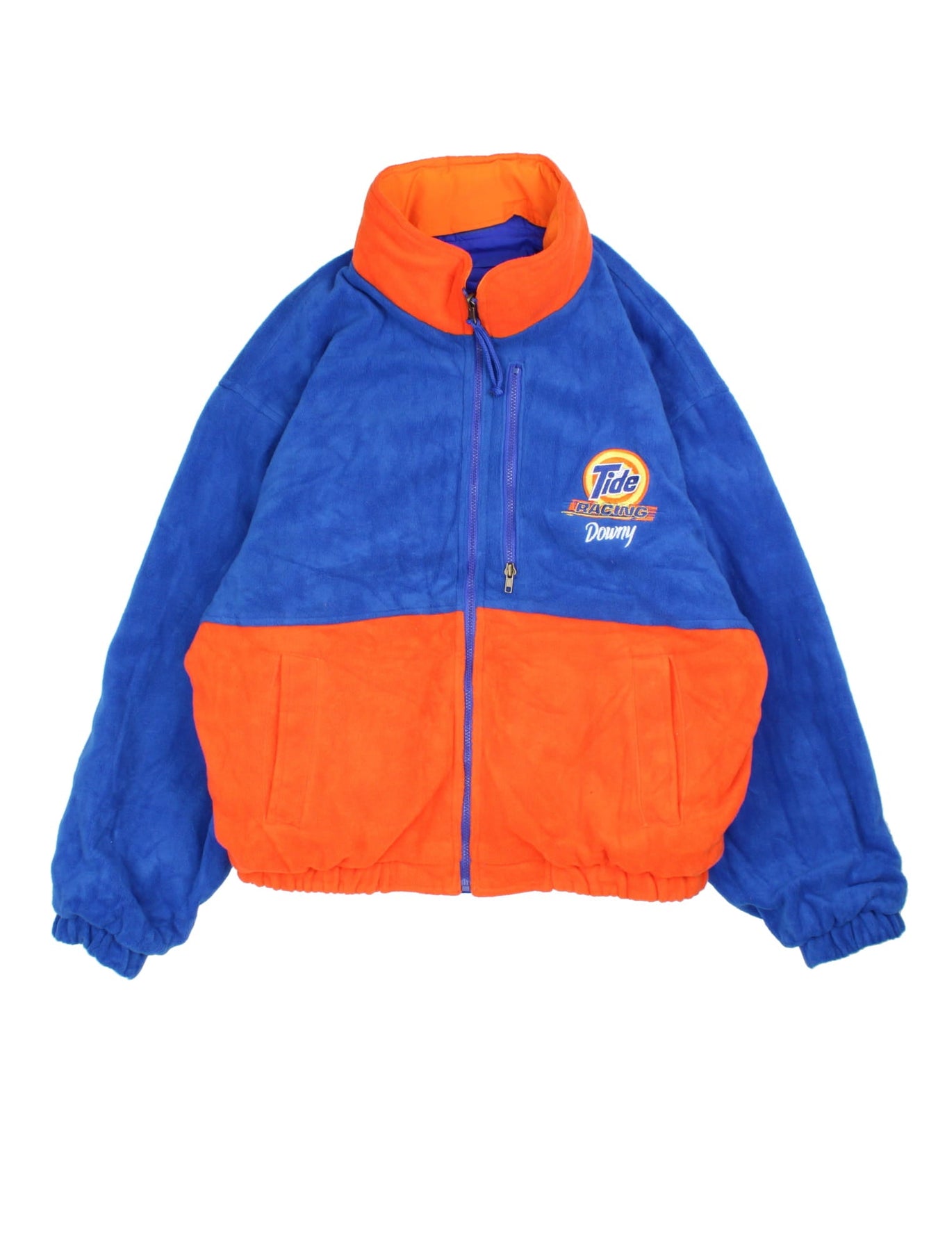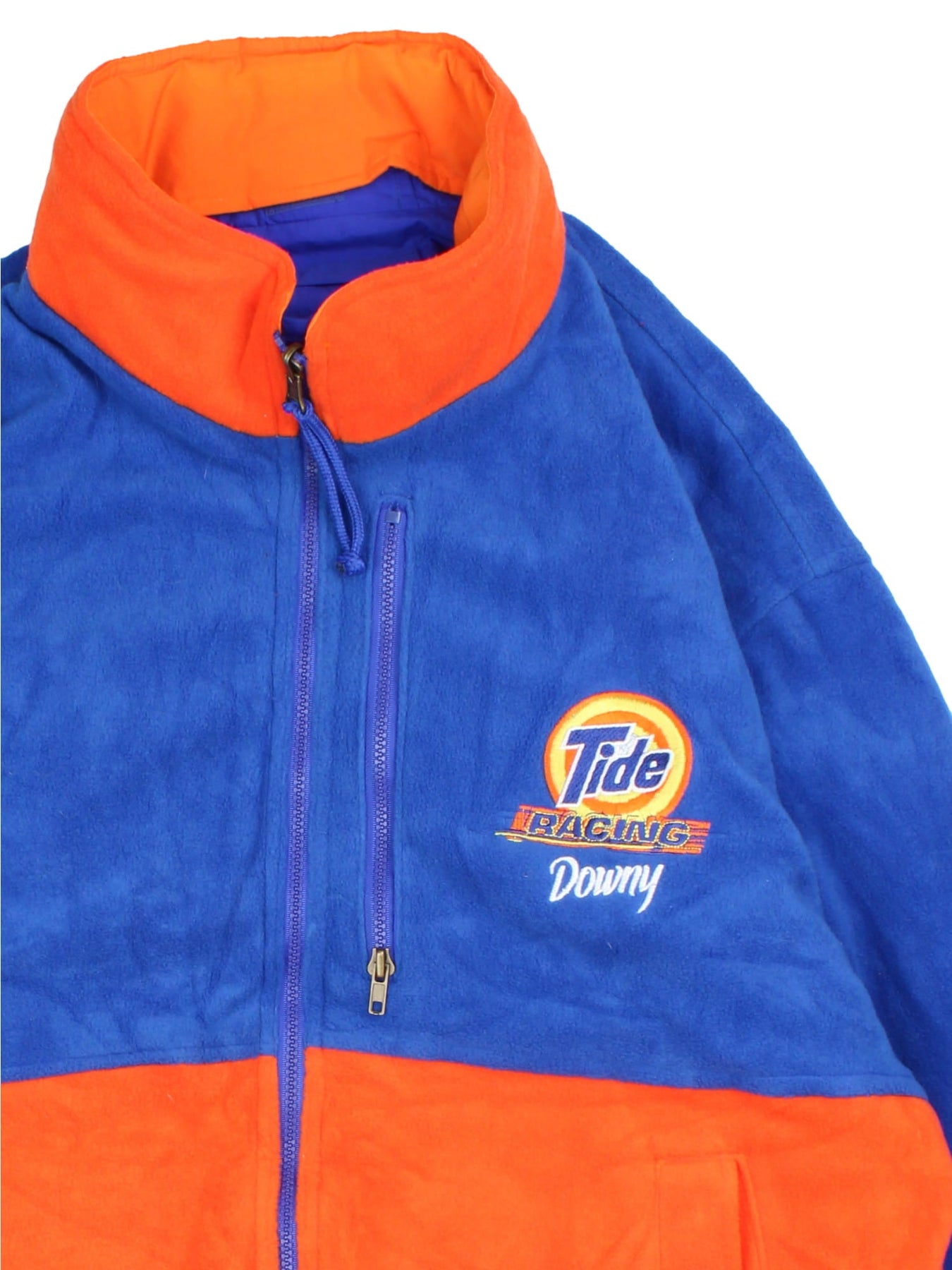 Vintage Tide Racing Downy Nascar Reversible Jacket in a blue and orange colourway with either jacket or fleece reversible options. Zips up and has multiple pockets, insulated lining, hidden hood and has the logo embroidered on the front and back.