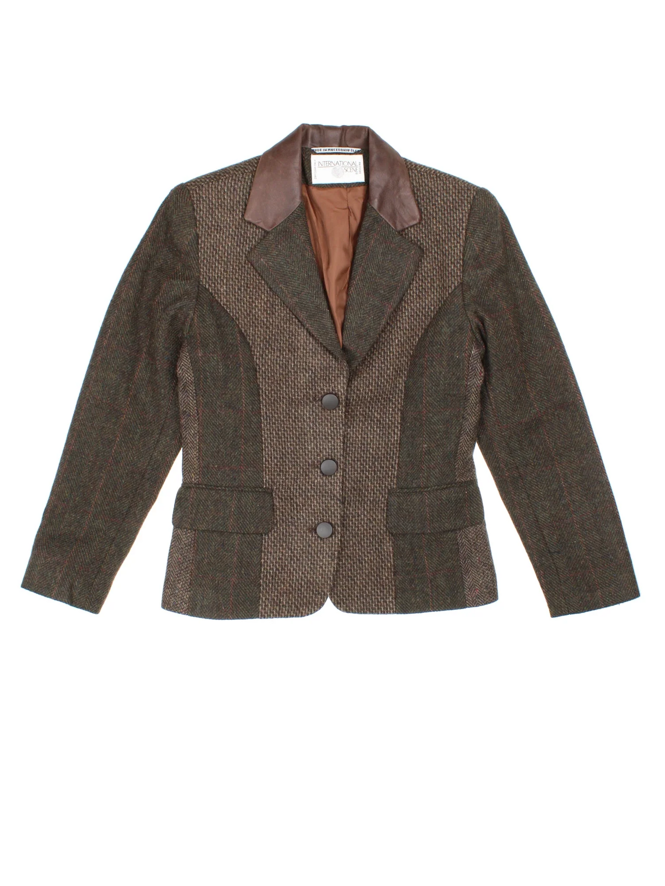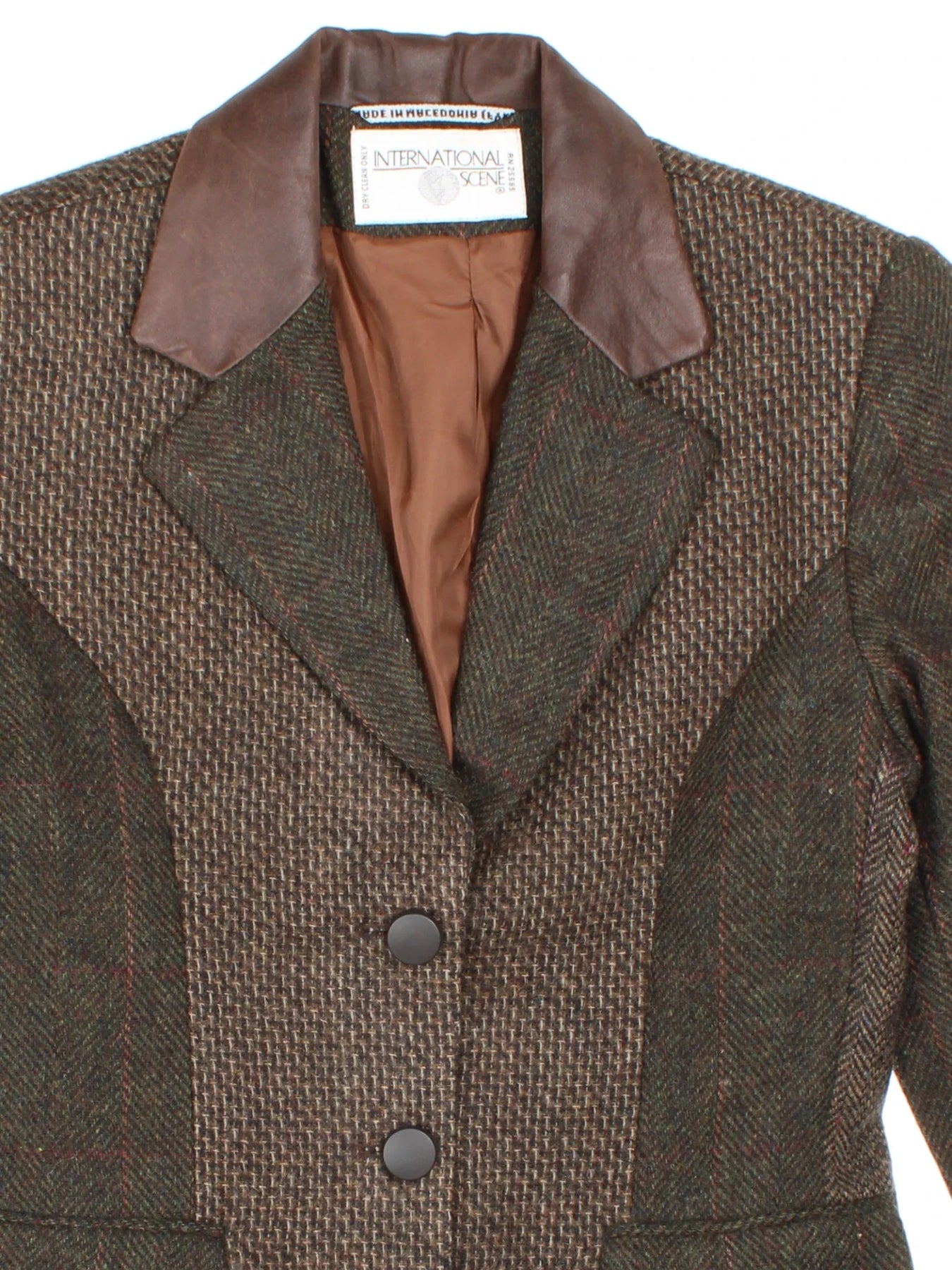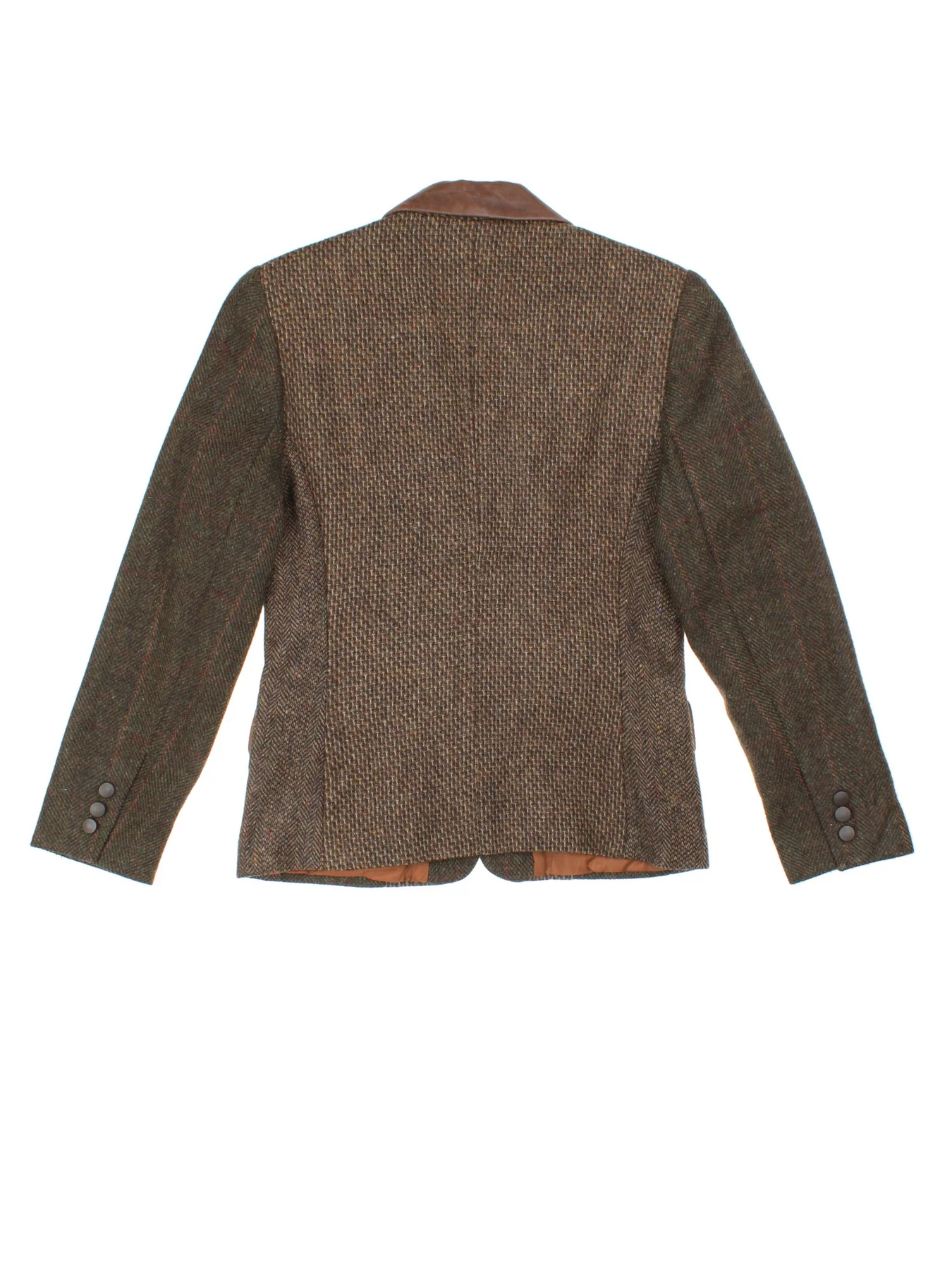 Vintage Tweed Blazer in a brown colourway. Buttons up, front patch pockets and leather collar, fully lined.