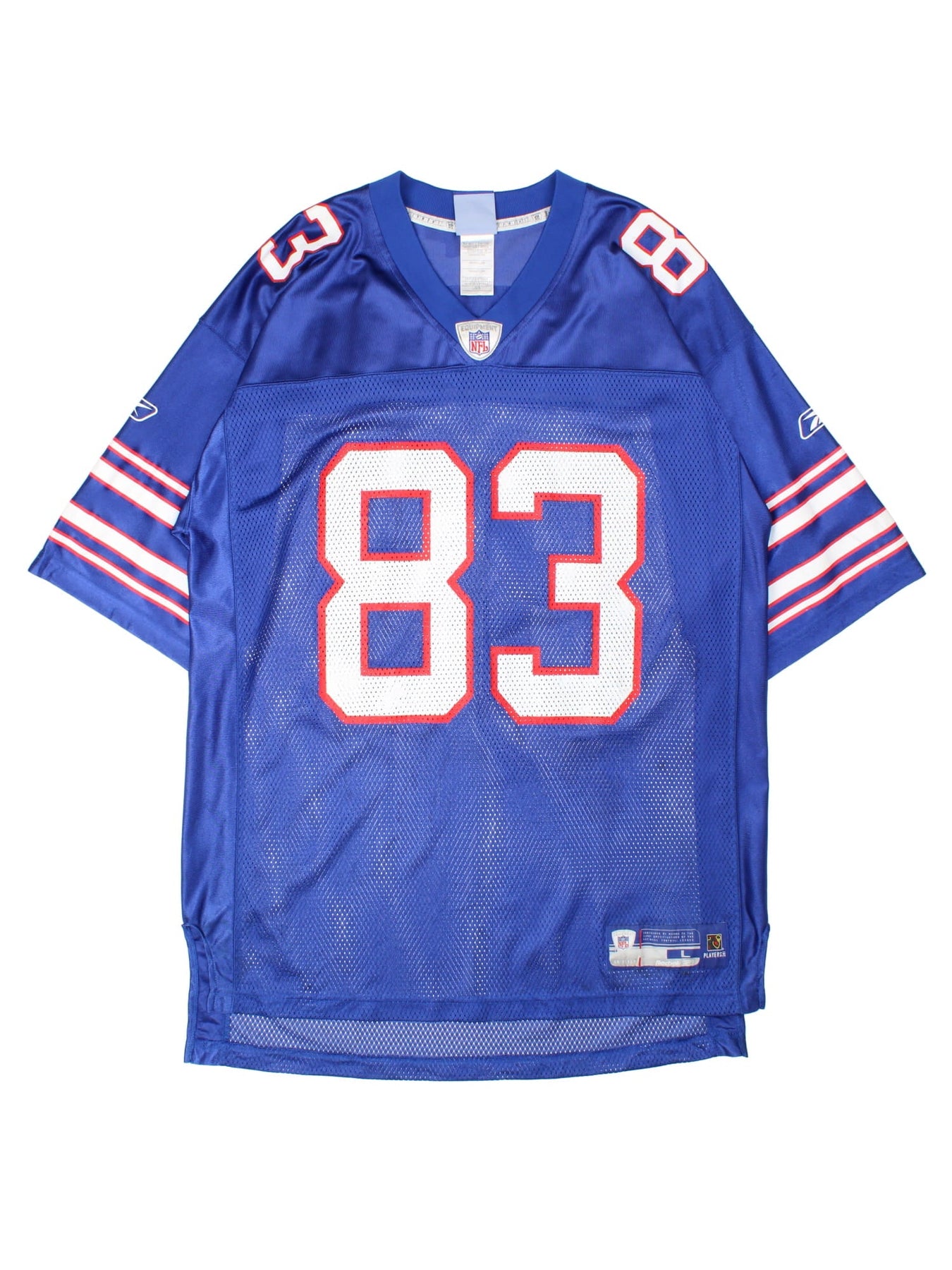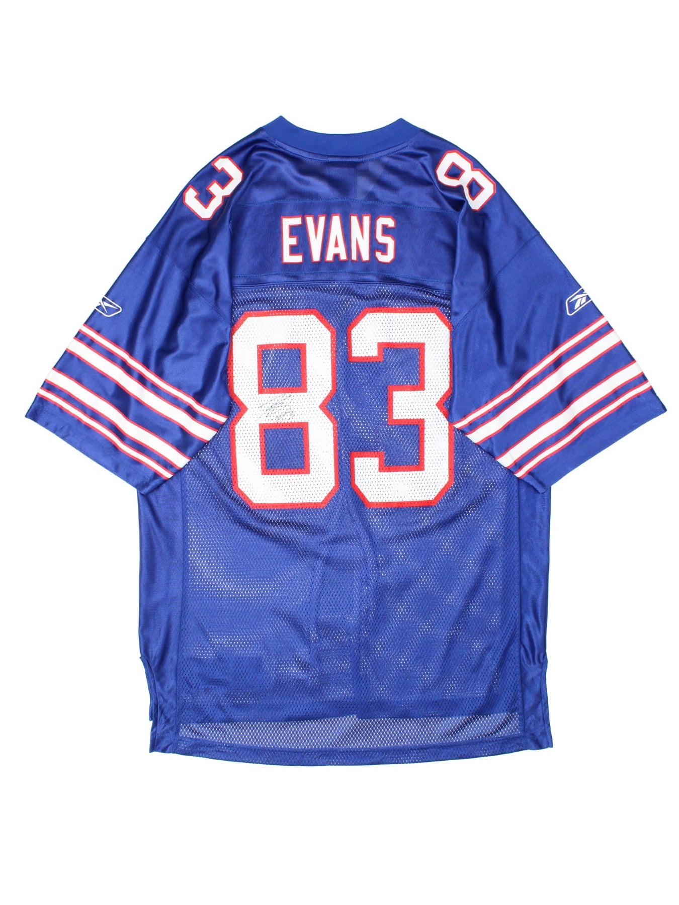 Buffalo Bills Signed Lee Evans NFL Jersey in the blue home kit colourway, features printed logo and badge on the front, and Evans number 83 signed on the back.