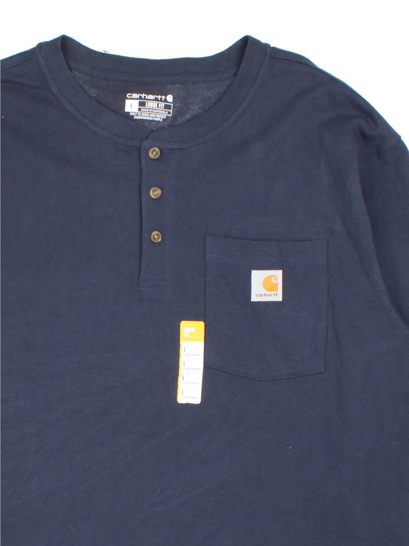 Carhartt Long Sleeve T-Shirt in a blue colourway with button up front and small classic logo on the front pocket