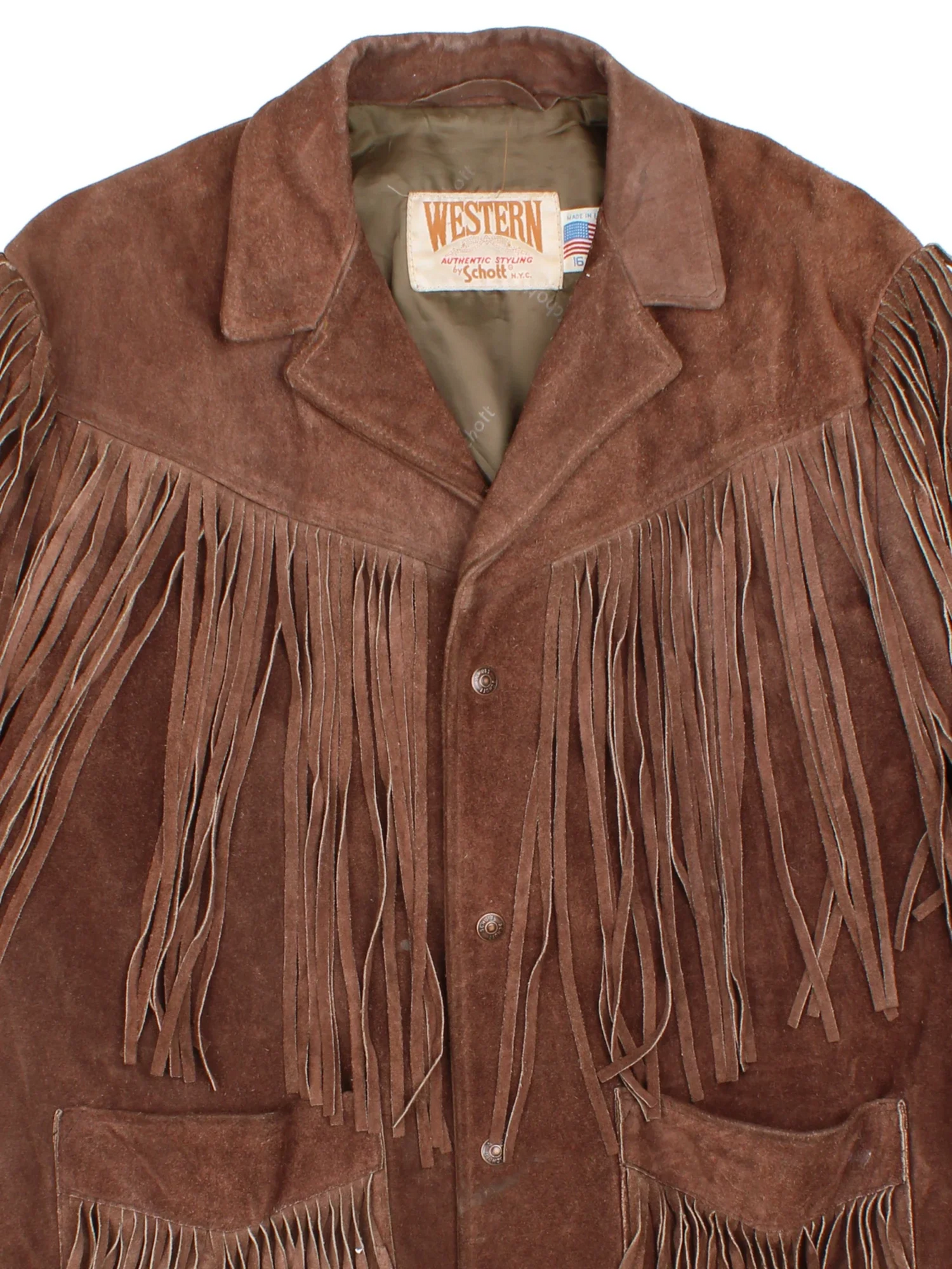 Vintage Schott Fringed Western Suede Leather Jacket in a brown colourway. Buttons up and has front patch pockets and all over fringe detail.