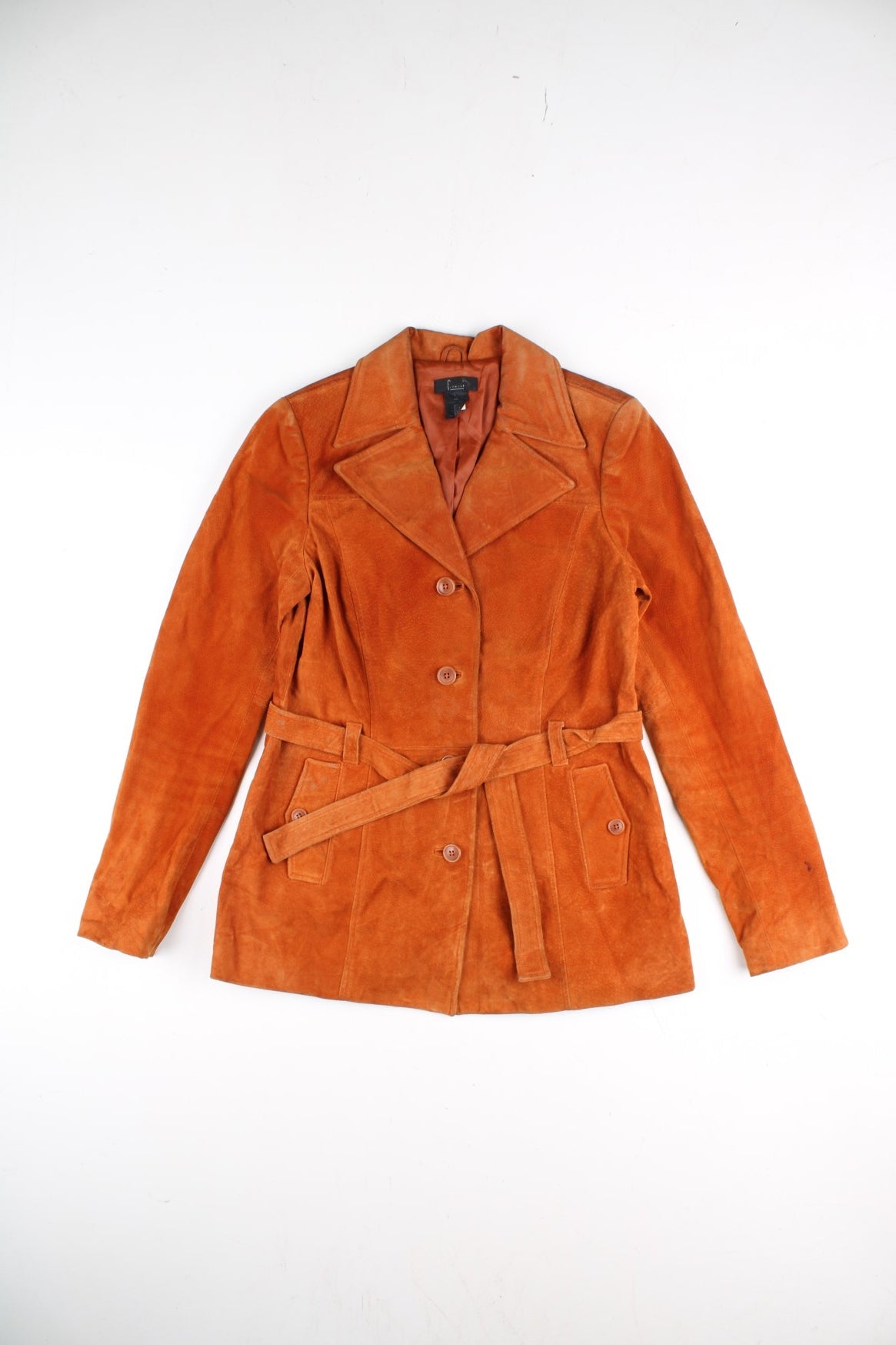 Vintage Suede Trench Coat in a brown colourway. Buttons up and has side pockets, a large collar, and belt feature.