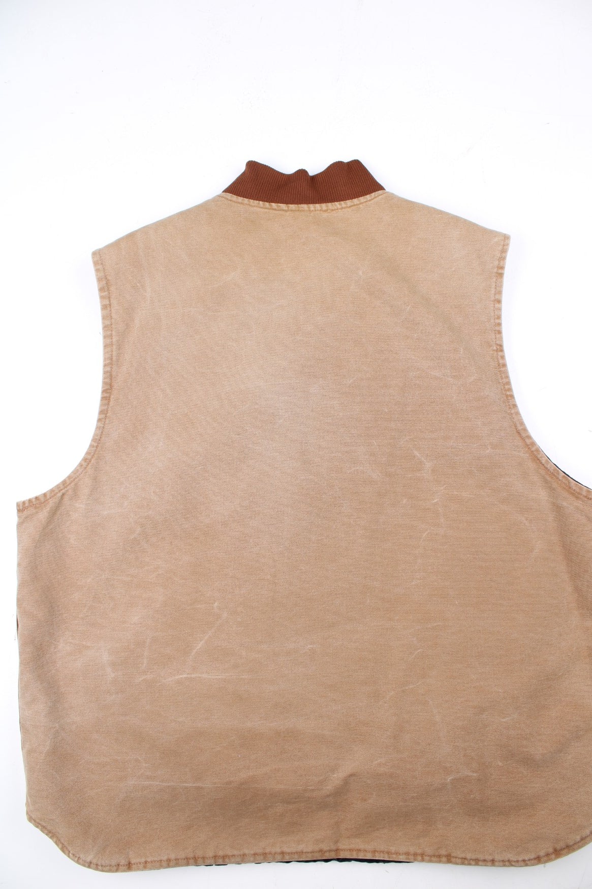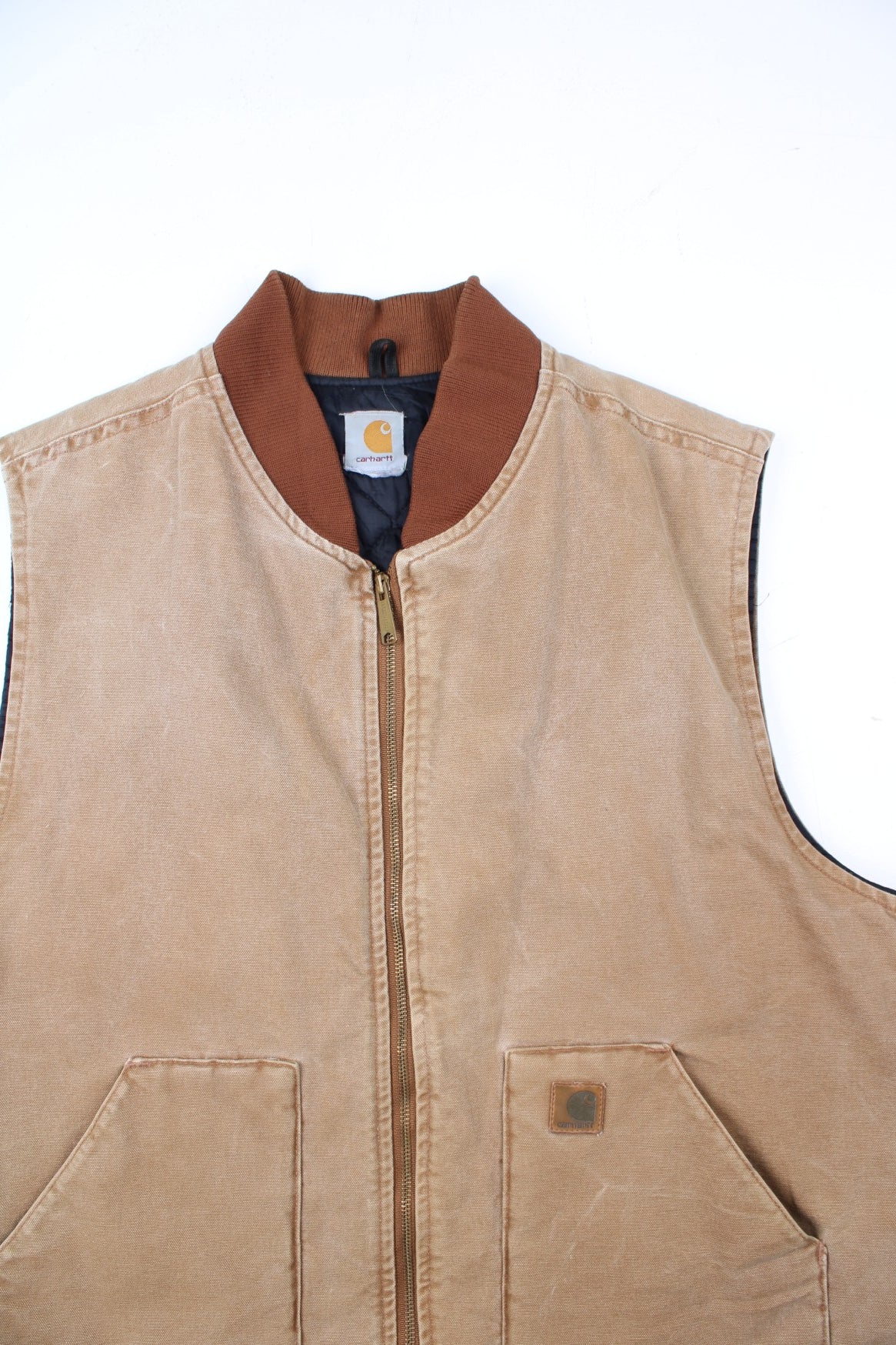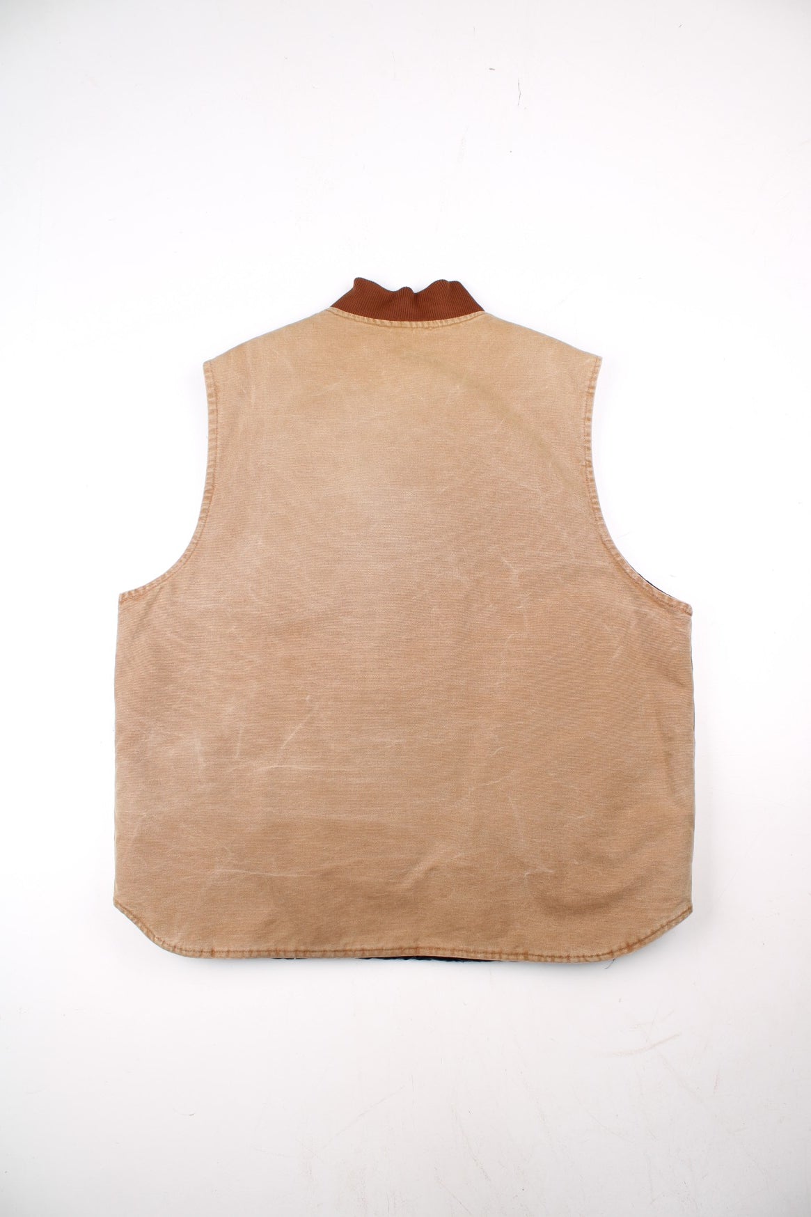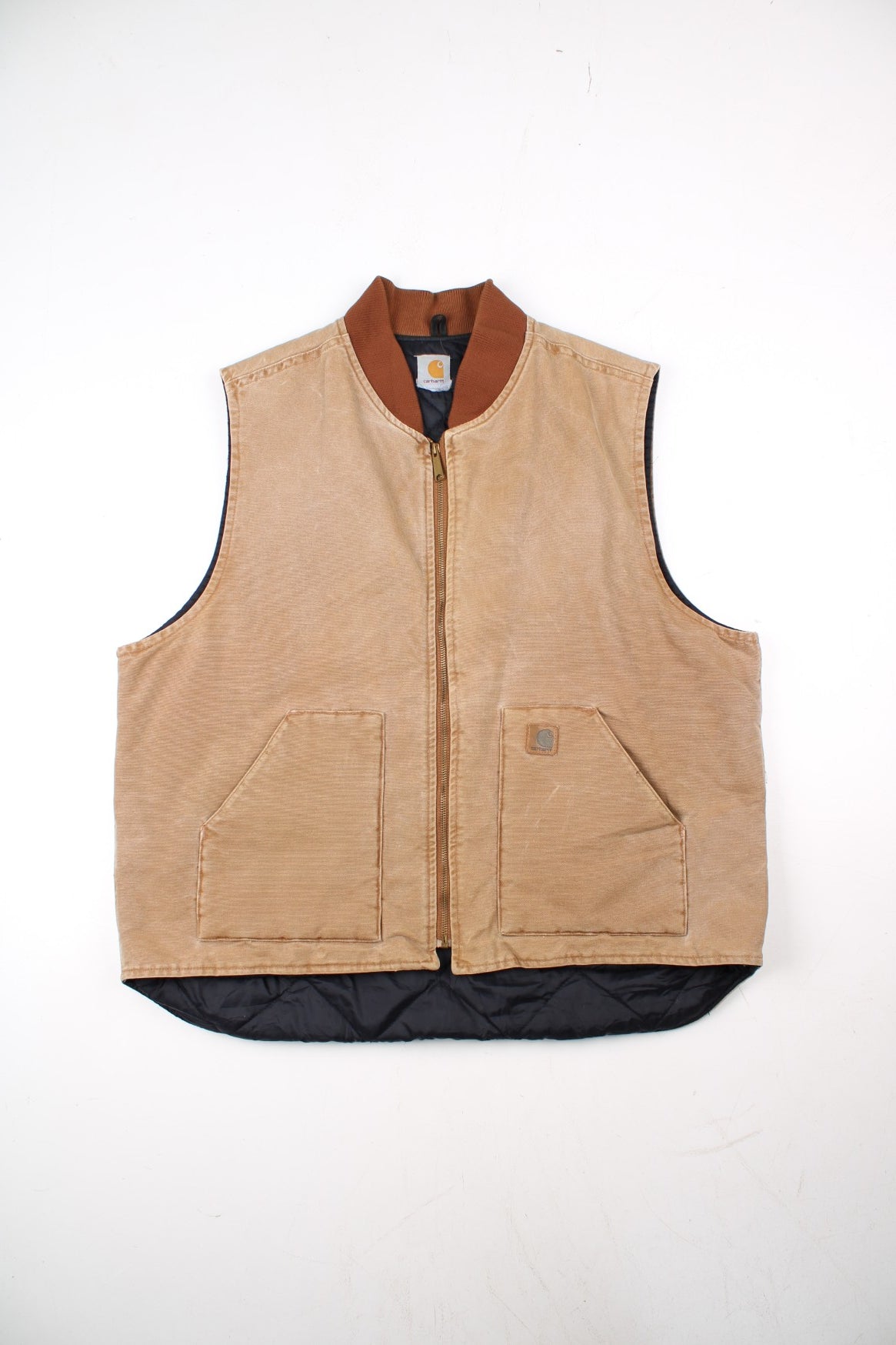 Vintage Carhartt Gilet in a tan colourway. Zip up with double pockets on front, insulated with a quilted lining and classic logo on front.