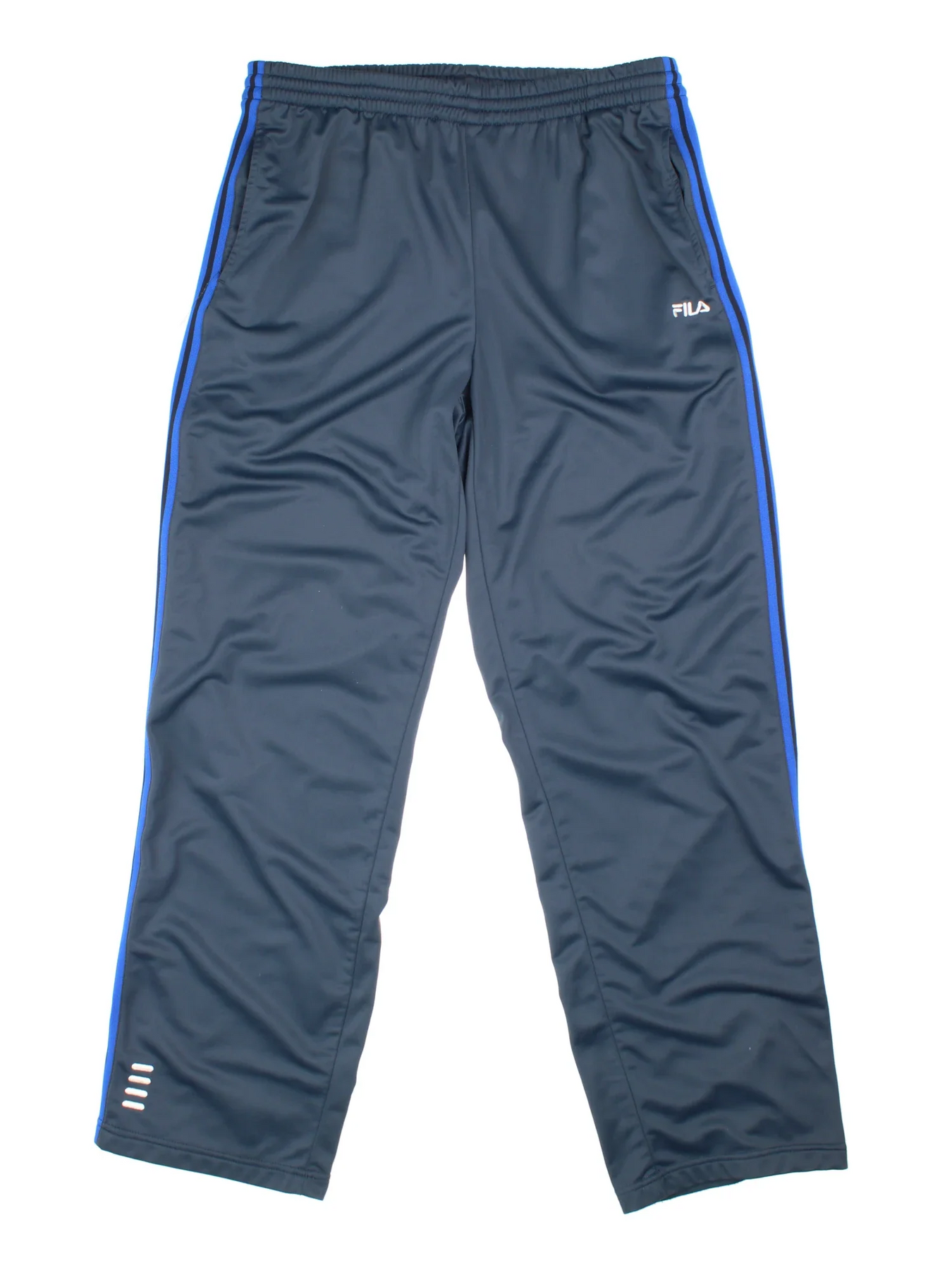 90's Fila Tracksuit Bottoms in blue colourway. Side pockets, contrast piping and the logo embroidered on the front.