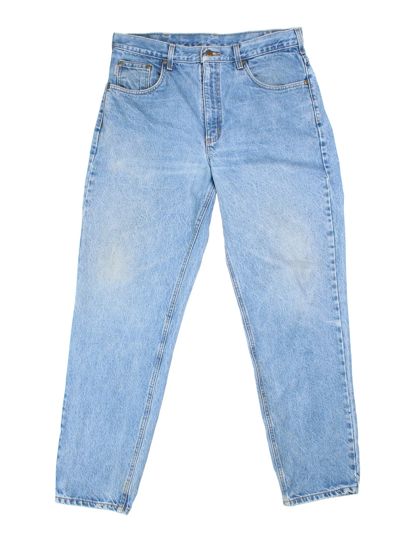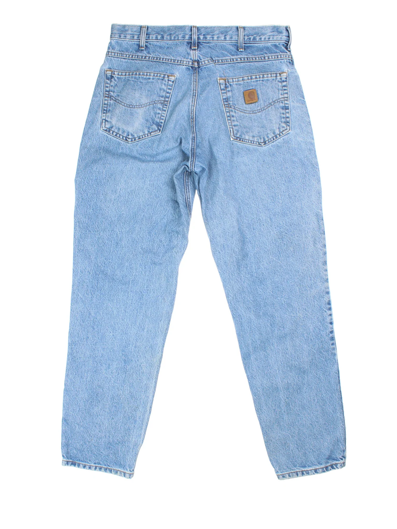 Carhartt Jeans in a blue colourway with multiple pockets and the logo embroidered on the back.