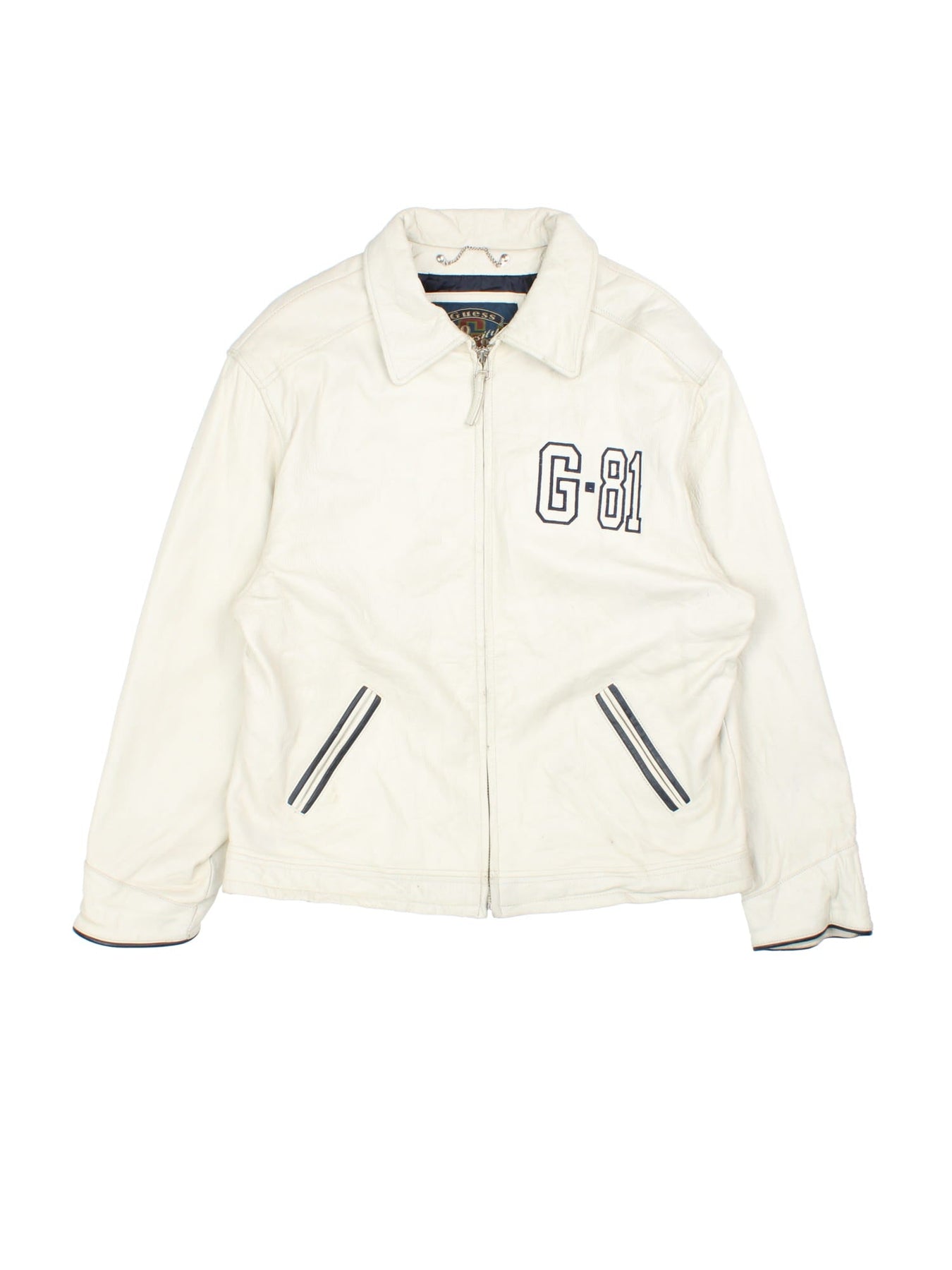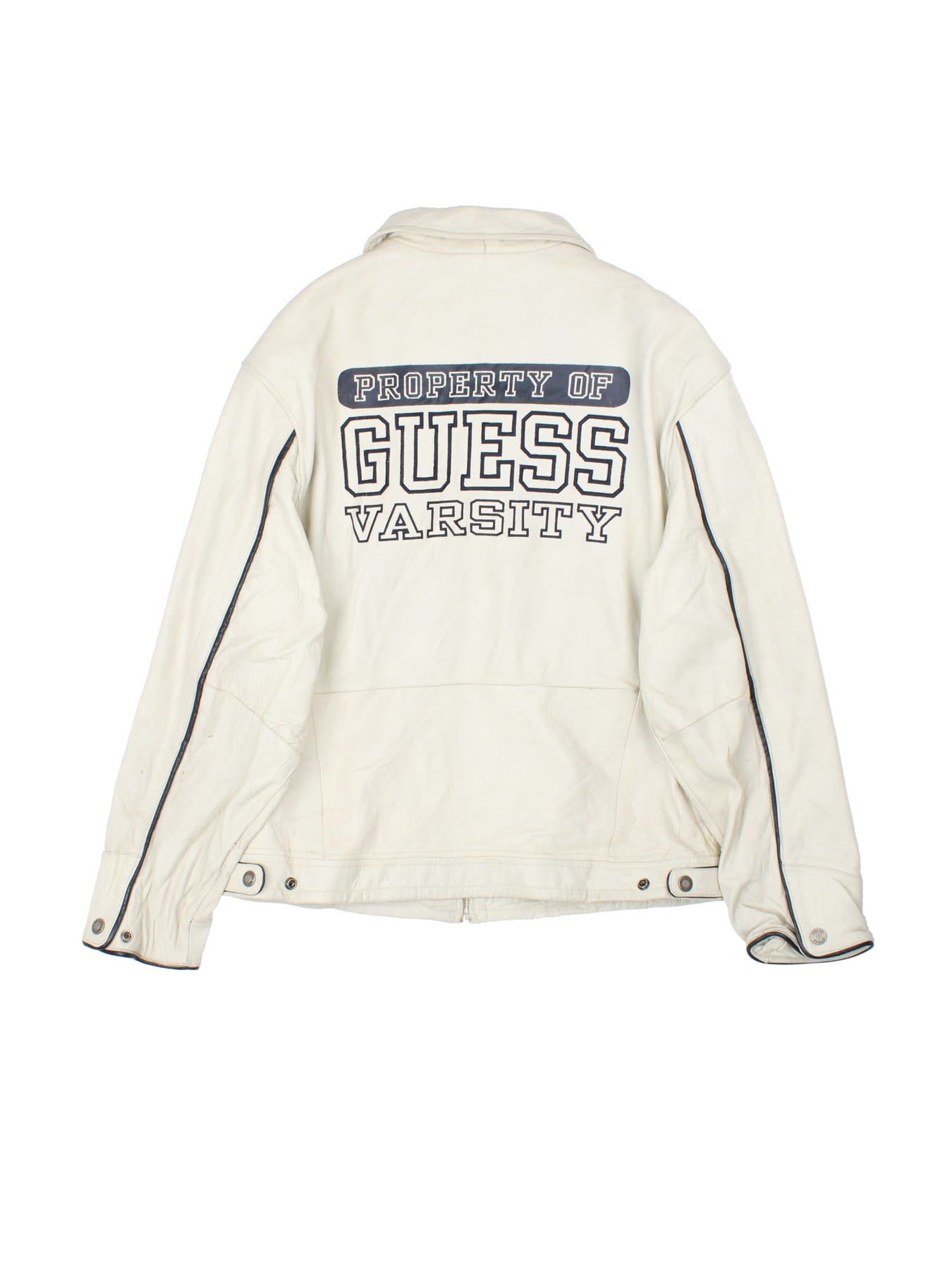 Vintage Guess 1981 Leather Jacket in a white colourway. Full zip up with double pocket on the front. Varsity style lettering on the front and graphic on the back.