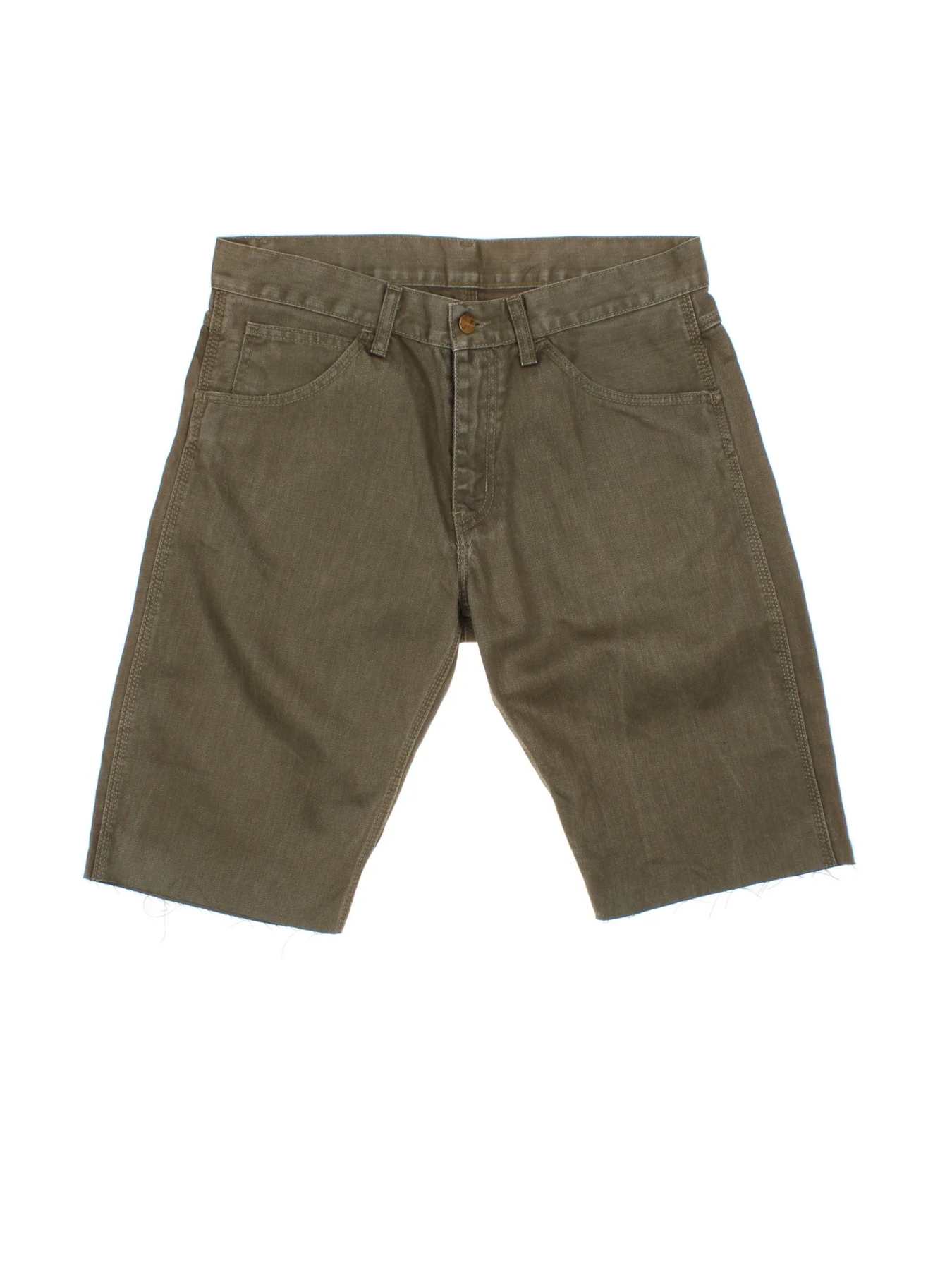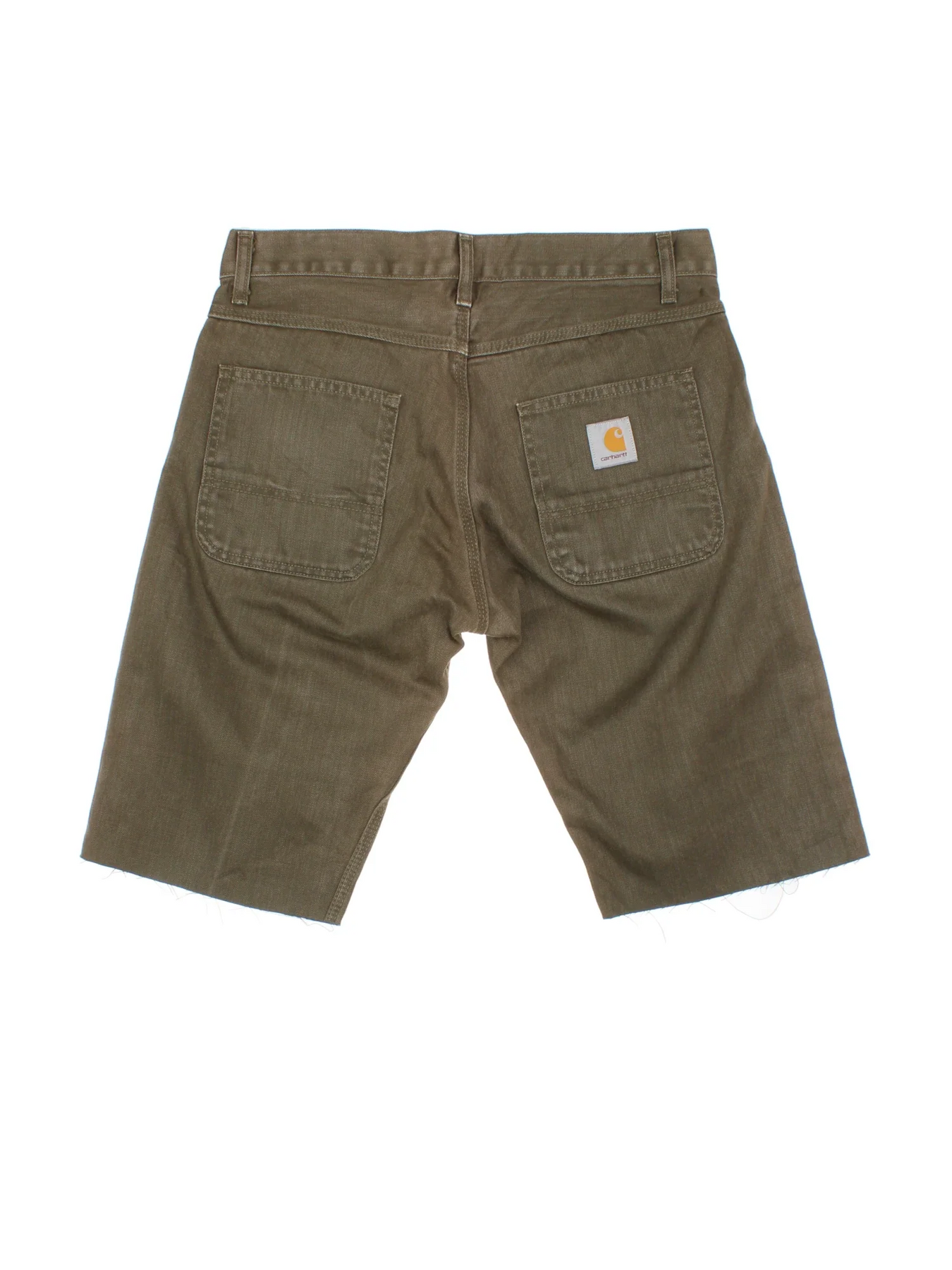 Carhartt Cut Off Shorts in green colourway. Zip fly fastening with multiple pockets, frayed hem and embroidered branding on the back.